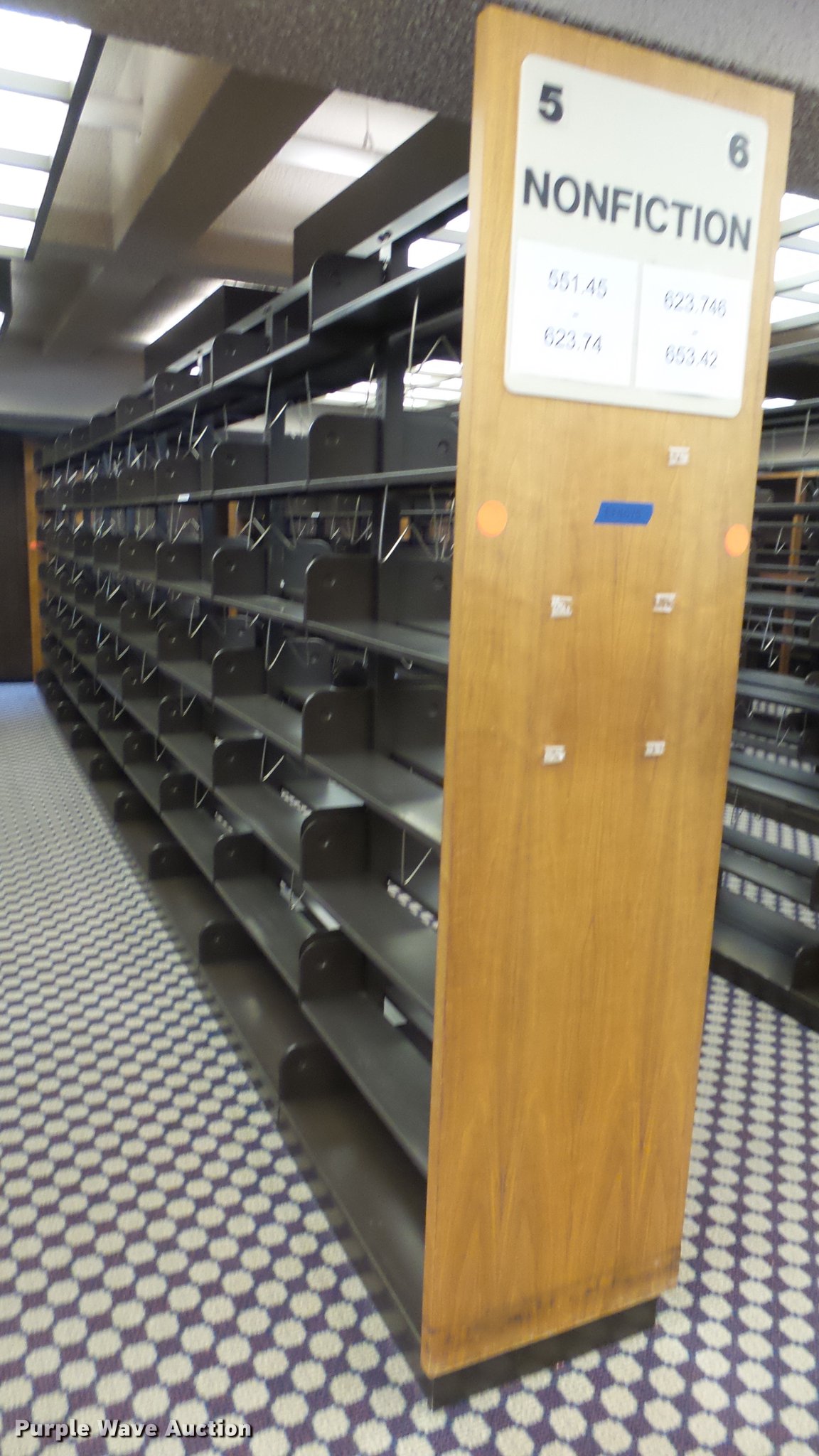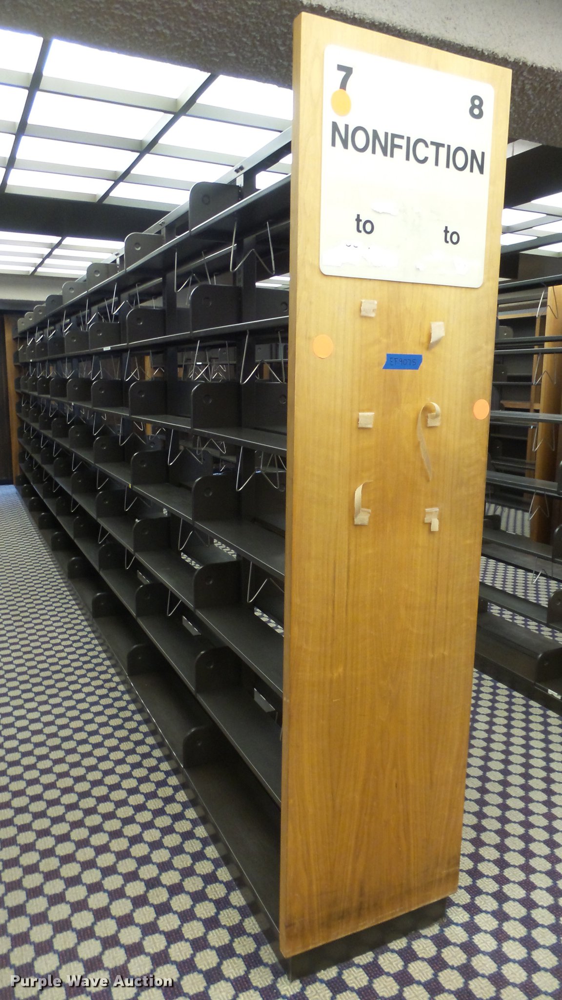 (8) floor-to-ceiling style bookshelves. 6-7 tier, Adjustable, Steel frames and shelves, Wood sides and top, Back to back shelves, (2) 75"W x 22'D x 91"H, 291.5"W x 22"D x 91"H, 219"W x 22"D x 91"H, 327"W x 22"D x 91'H, Location 2nd floor. City of Wichita Former Central Public Library - Open inspection Aug. 22. 223 S Main. Wichita, KS 67202