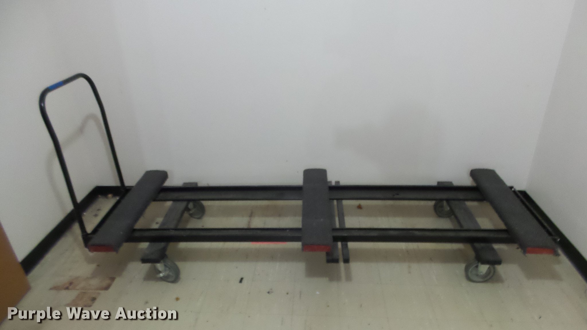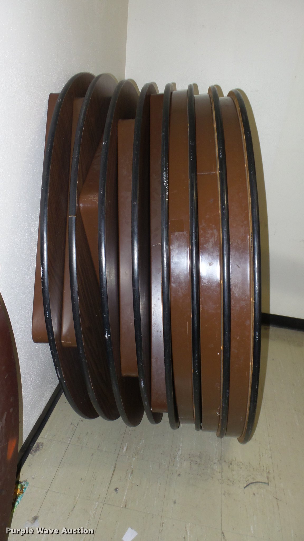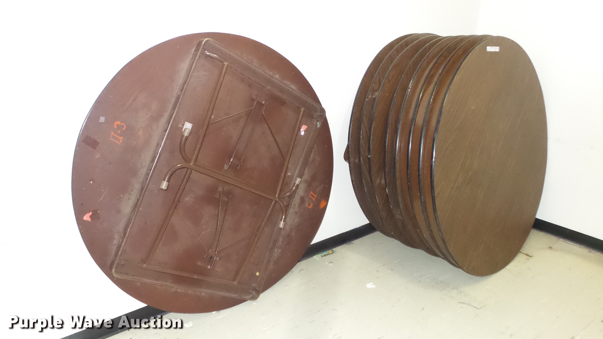 Purple Wave is selling a used Furniture in Kansas. This item is a (13) folding tables with the following: (9) round, 5' diameter, (4) rectangular, (3) 8' x 30", 8' x 36", Cart included, Location 3rd floor