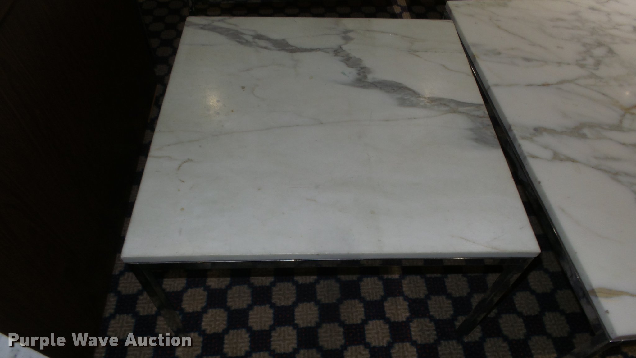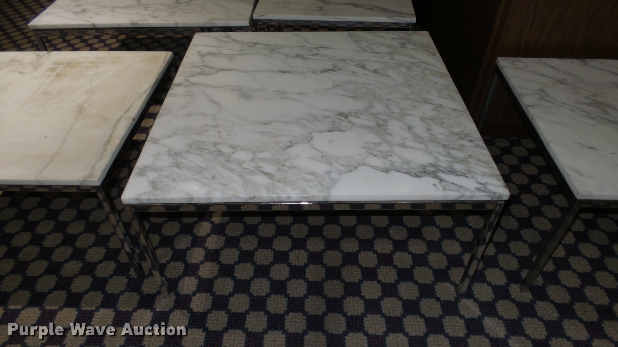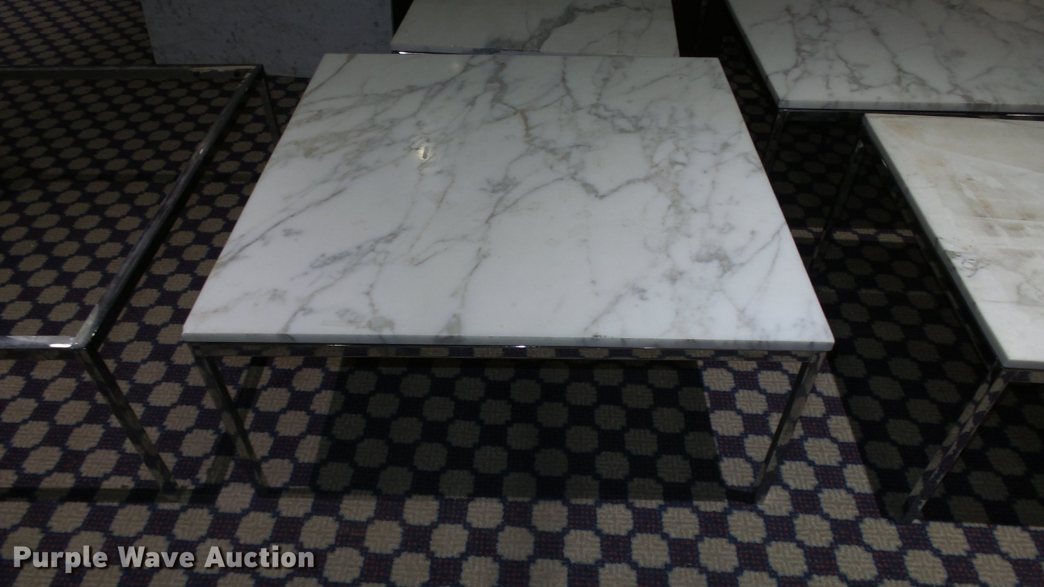 Purple Wave is selling a used Furniture in Kansas. This item is a (9) marble top coffee and end tables with the following: (4) coffee tables, 36" x 36", One damaged, (5) end tables, 27" x 27", Marble unverified, Location 3rd floor