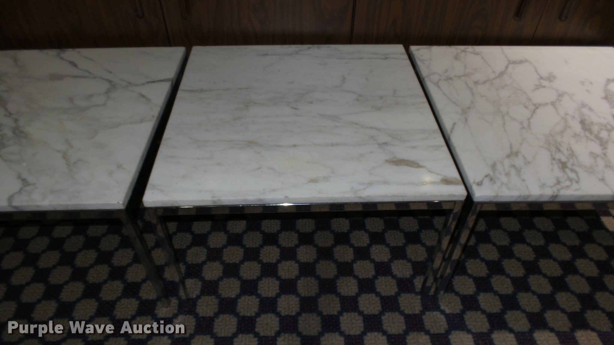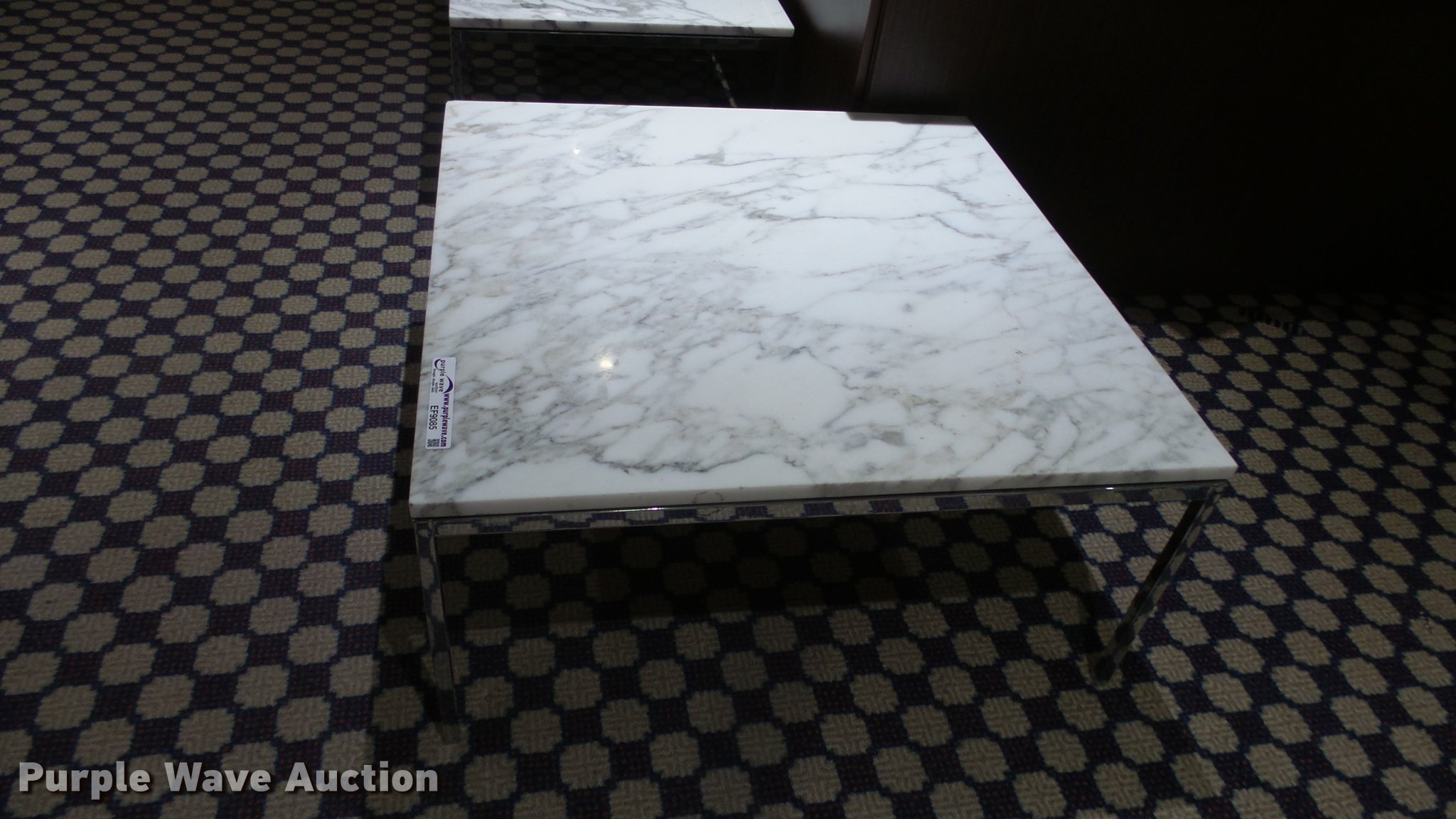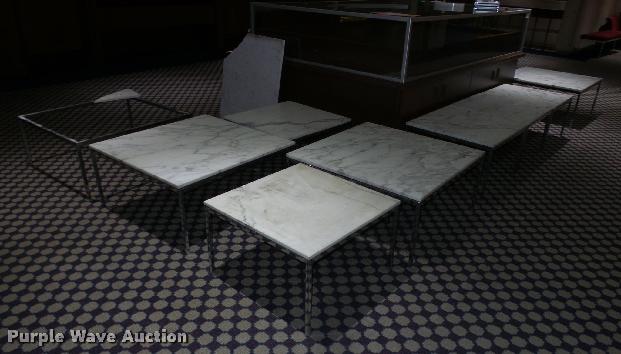 Purple Wave is selling a used Furniture in Kansas. This item is a (9) marble top coffee and end tables with the following: (4) coffee tables, 36" x 36", One damaged, (5) end tables, 27" x 27", Marble unverified, Location 3rd floor