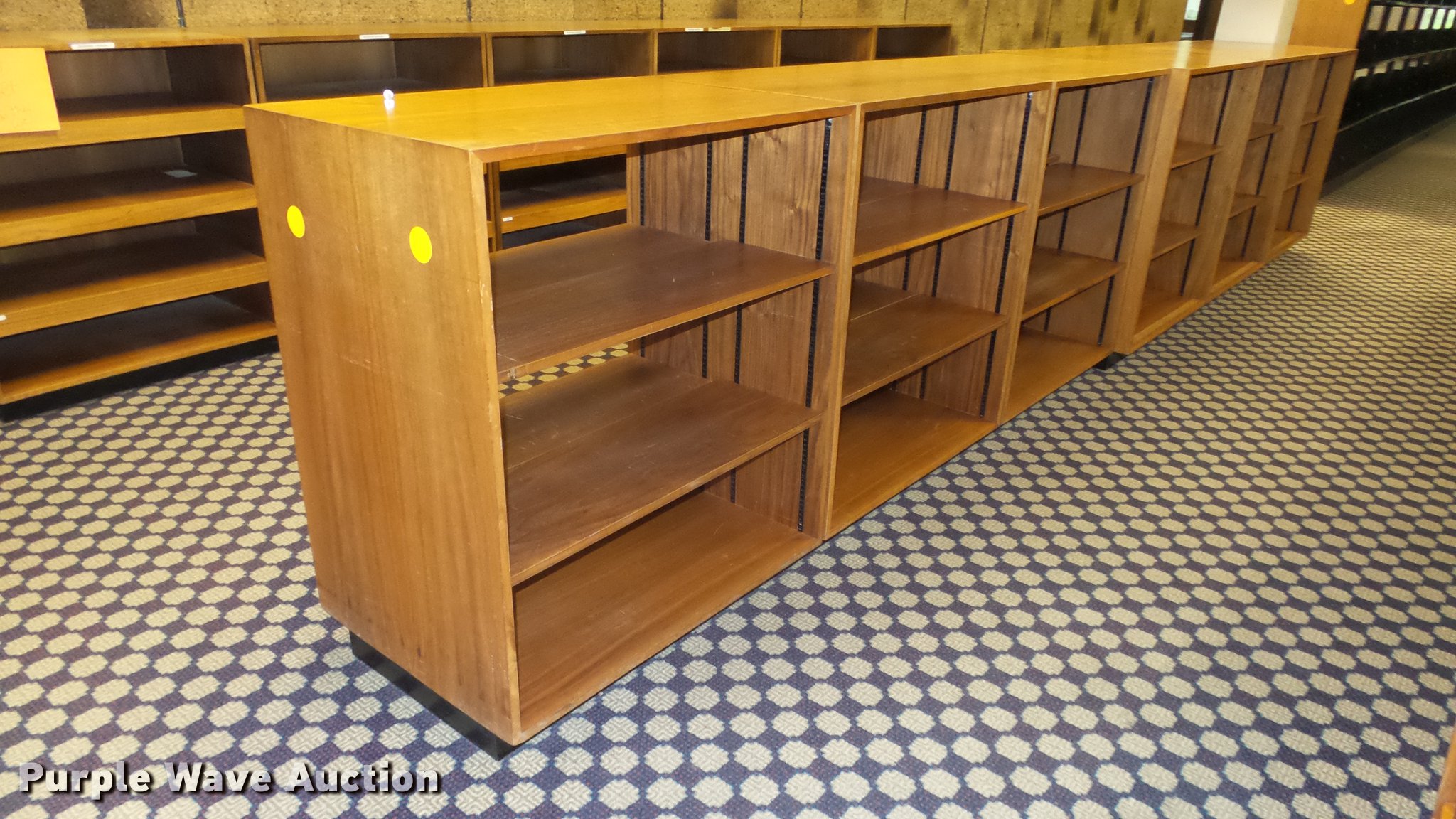 Purple Wave is selling a used Shelving and Storage in Kansas. This item is a (6) wood bookshelves with the following: (3) 9' x 24" x 42"H, (2) 9' x 28" x 42"H, 18' x 24" x 42"H, Adjustable shelves, Location 3rd floor