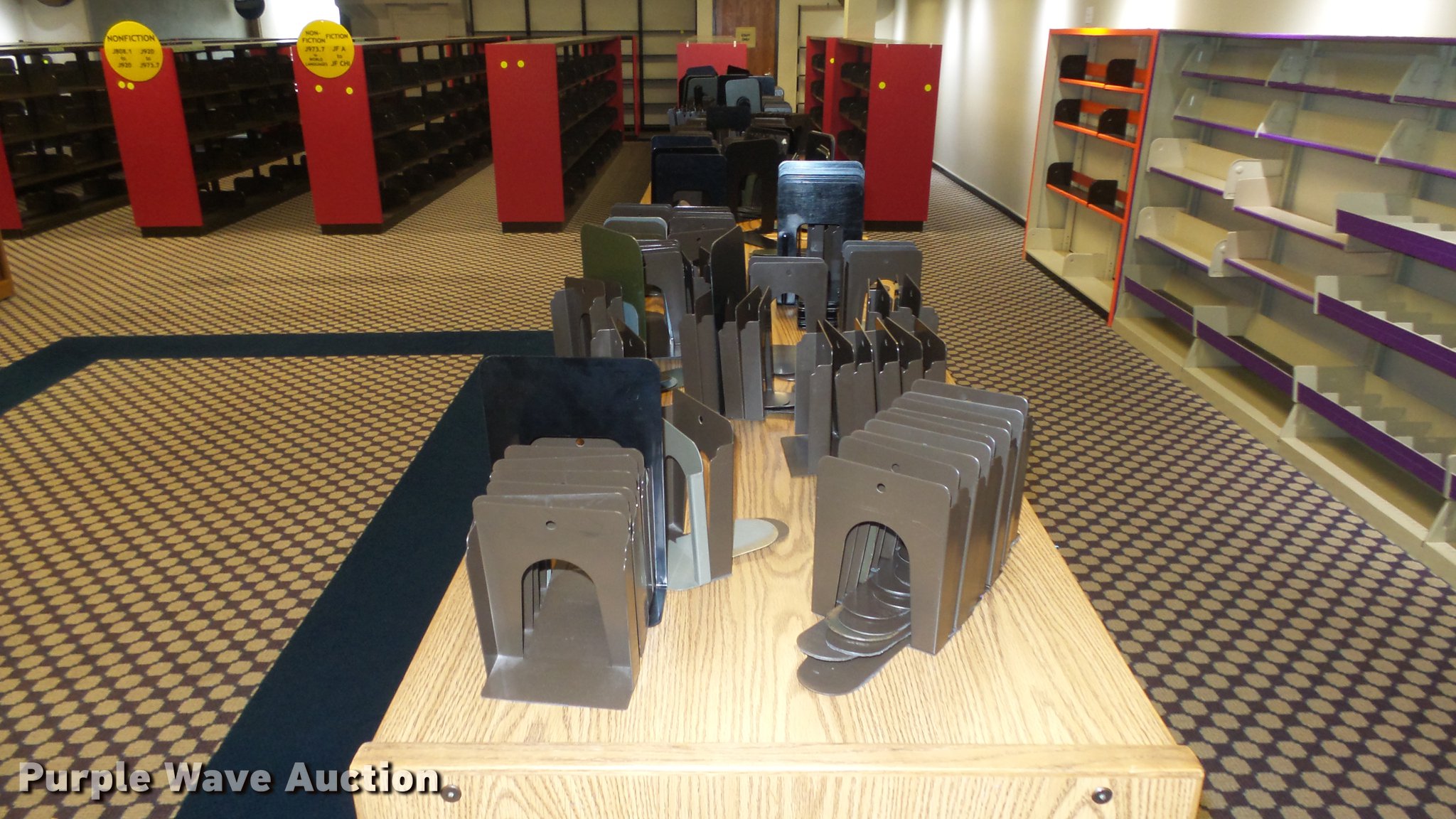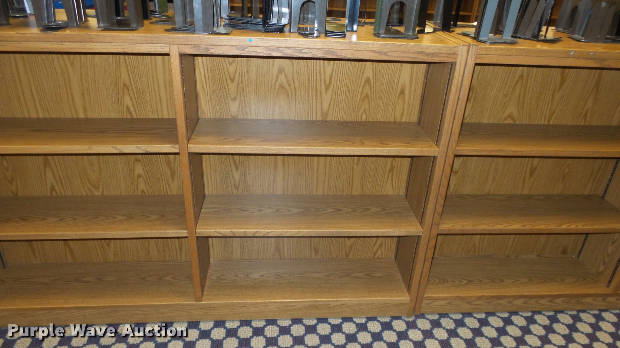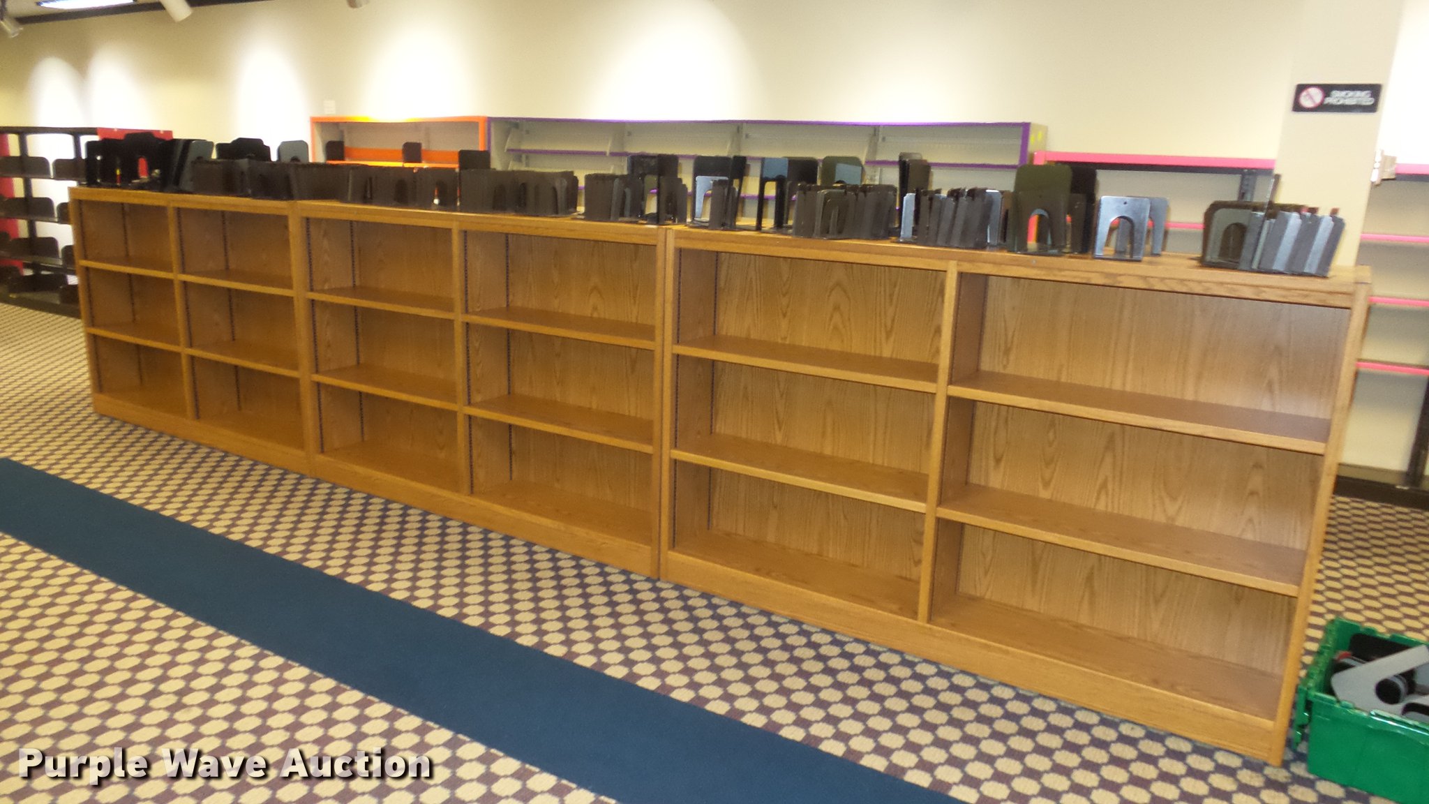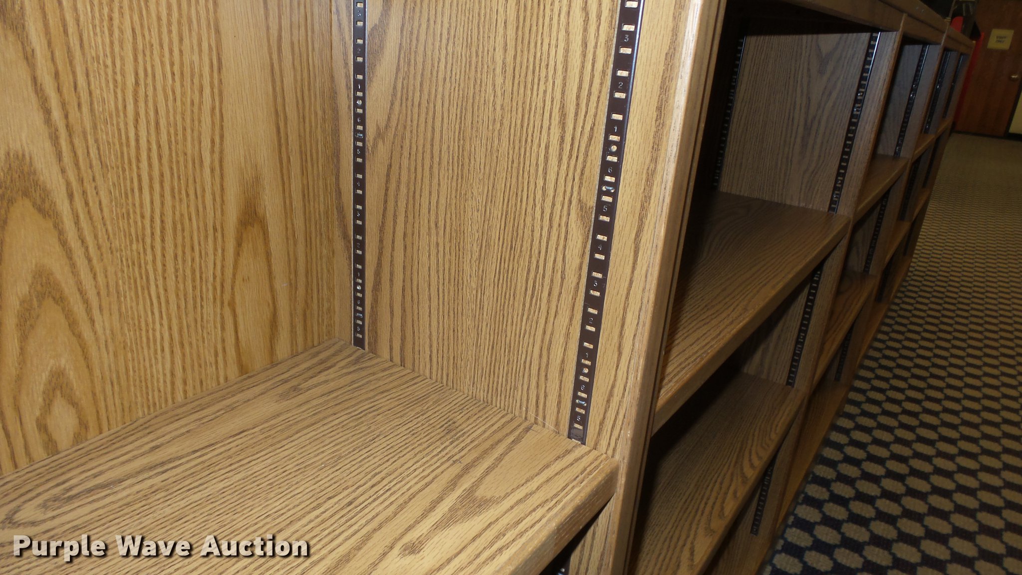 Purple Wave is selling a used Shelving and Storage in Kansas. This item is a (6) wood bookshelves with the following: 75" x 23" x 48"H, Adjustable shelving, Metal book ends, Location 3rd floor