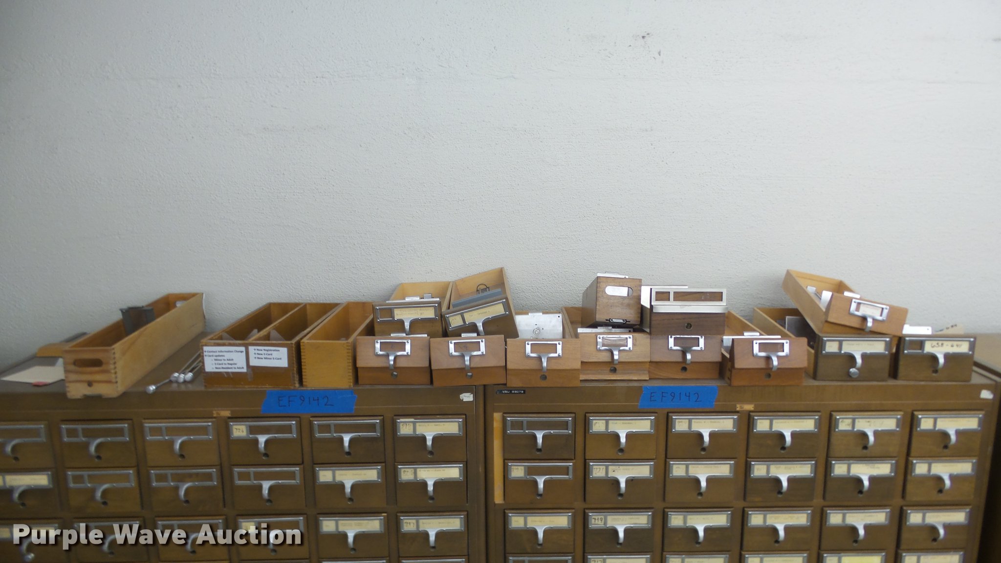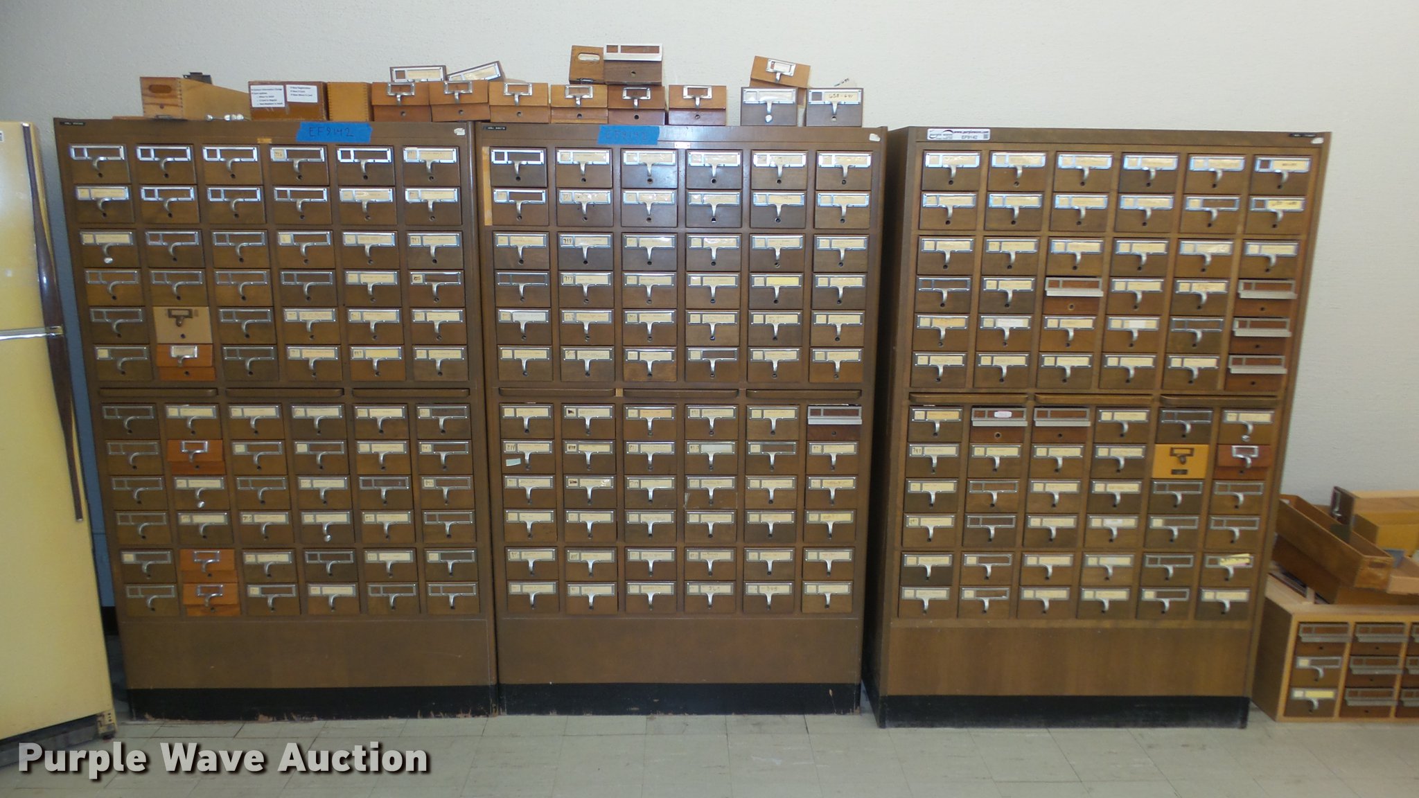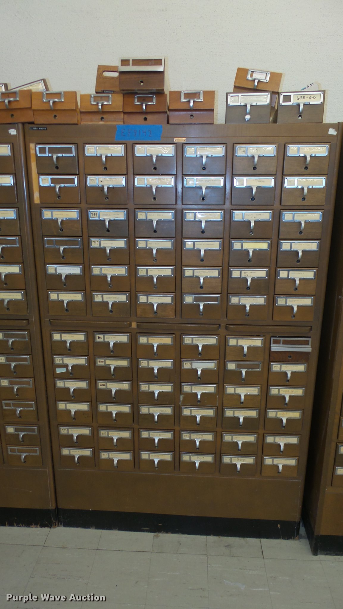 Purple Wave is selling a used Office Supplies and Equip. in Kansas. This item is a (4) wood card file cabinets with the following: 72 drawers, 15 drawers, Location basement #5