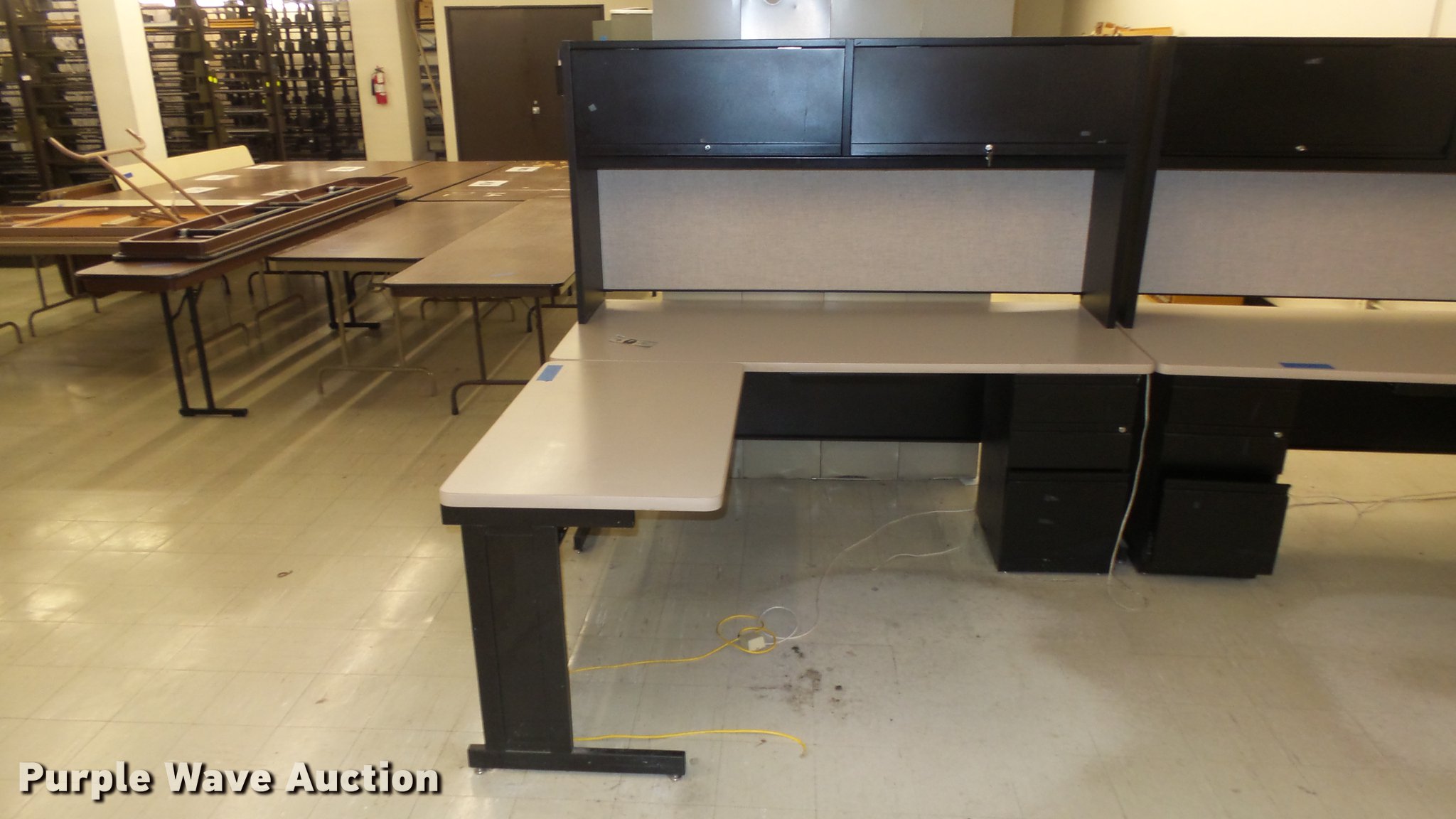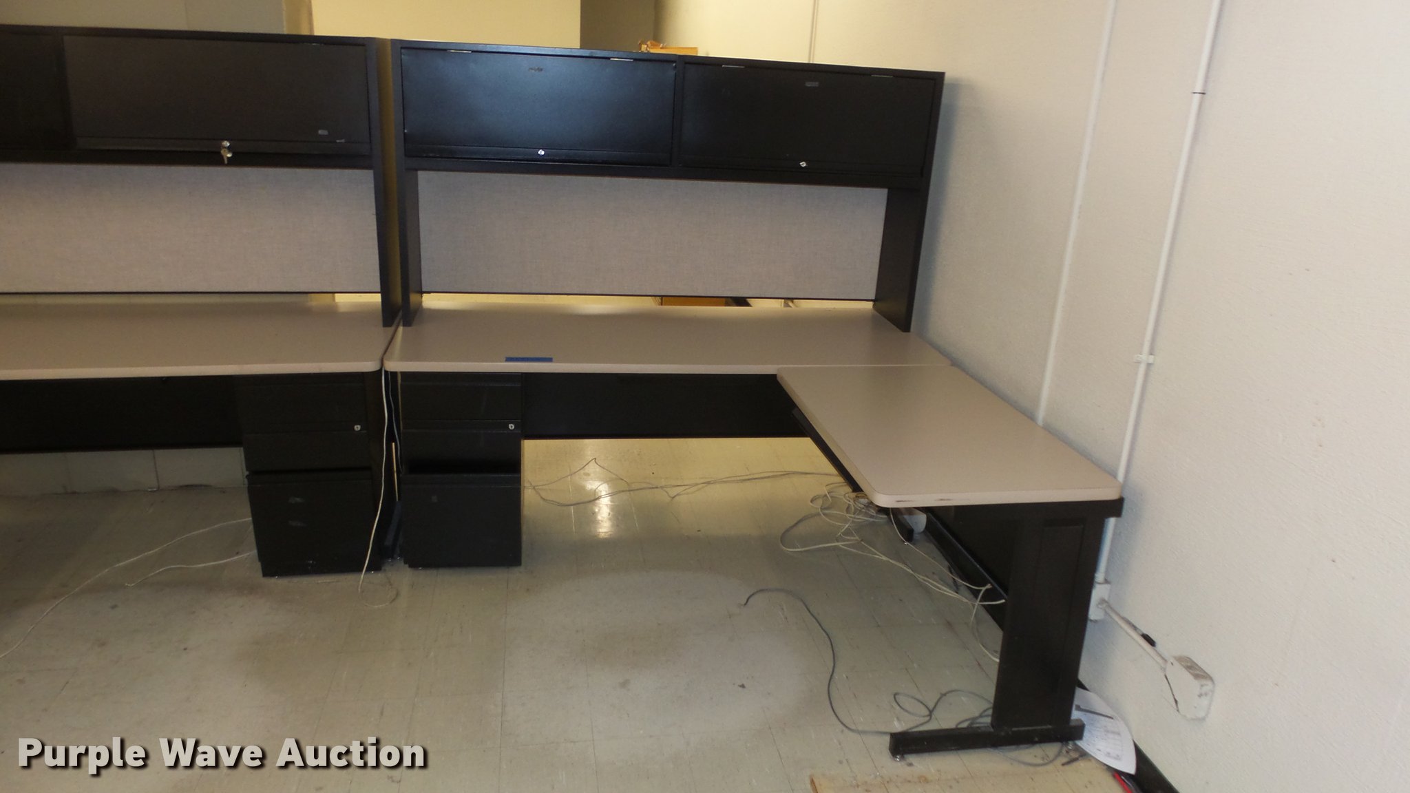 Purple Wave is selling a used Furniture in Kansas. This item is a (5) office desks with the following: 30" to 72", Hutches, (4) file cabinets, (4) returns, 40" x 24", Location basement #5