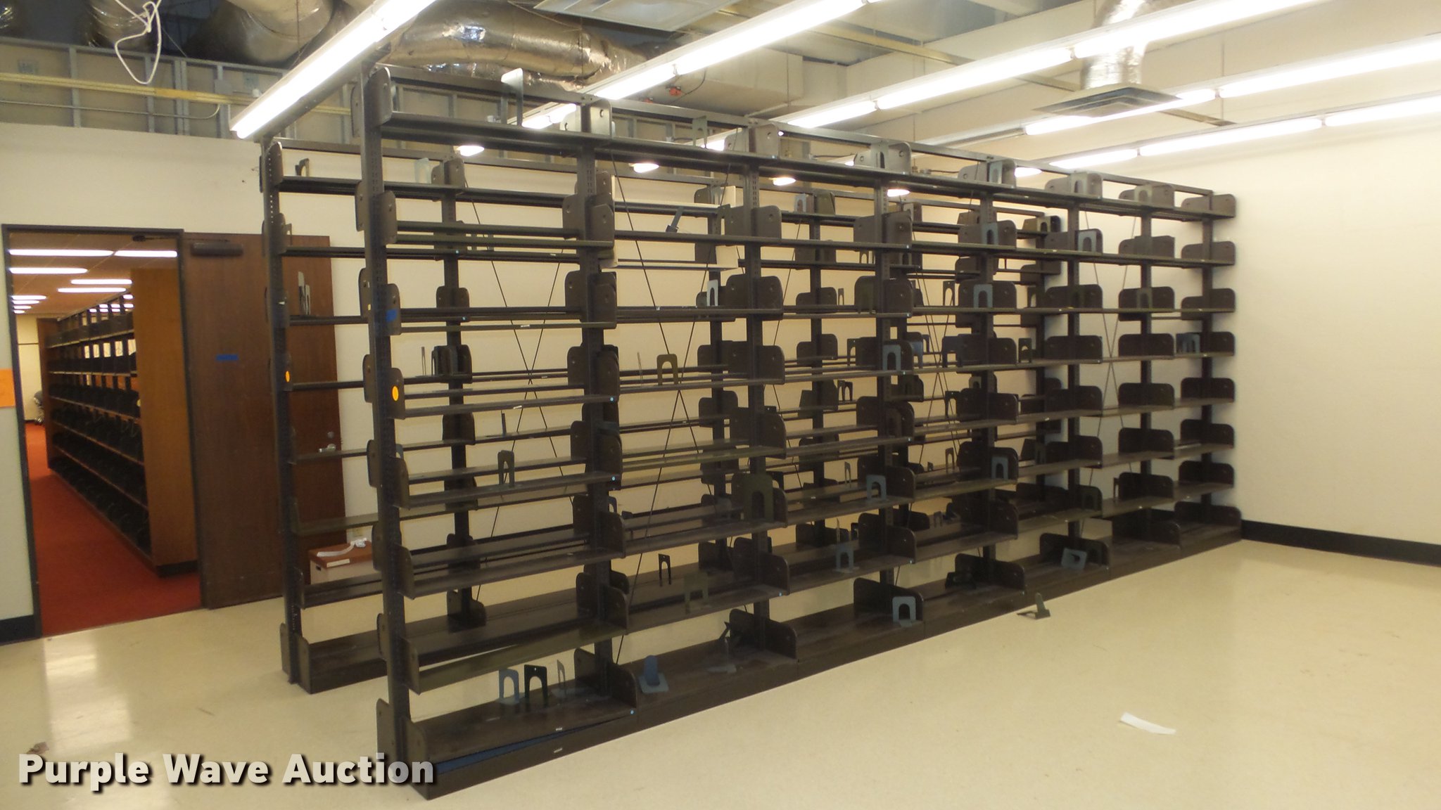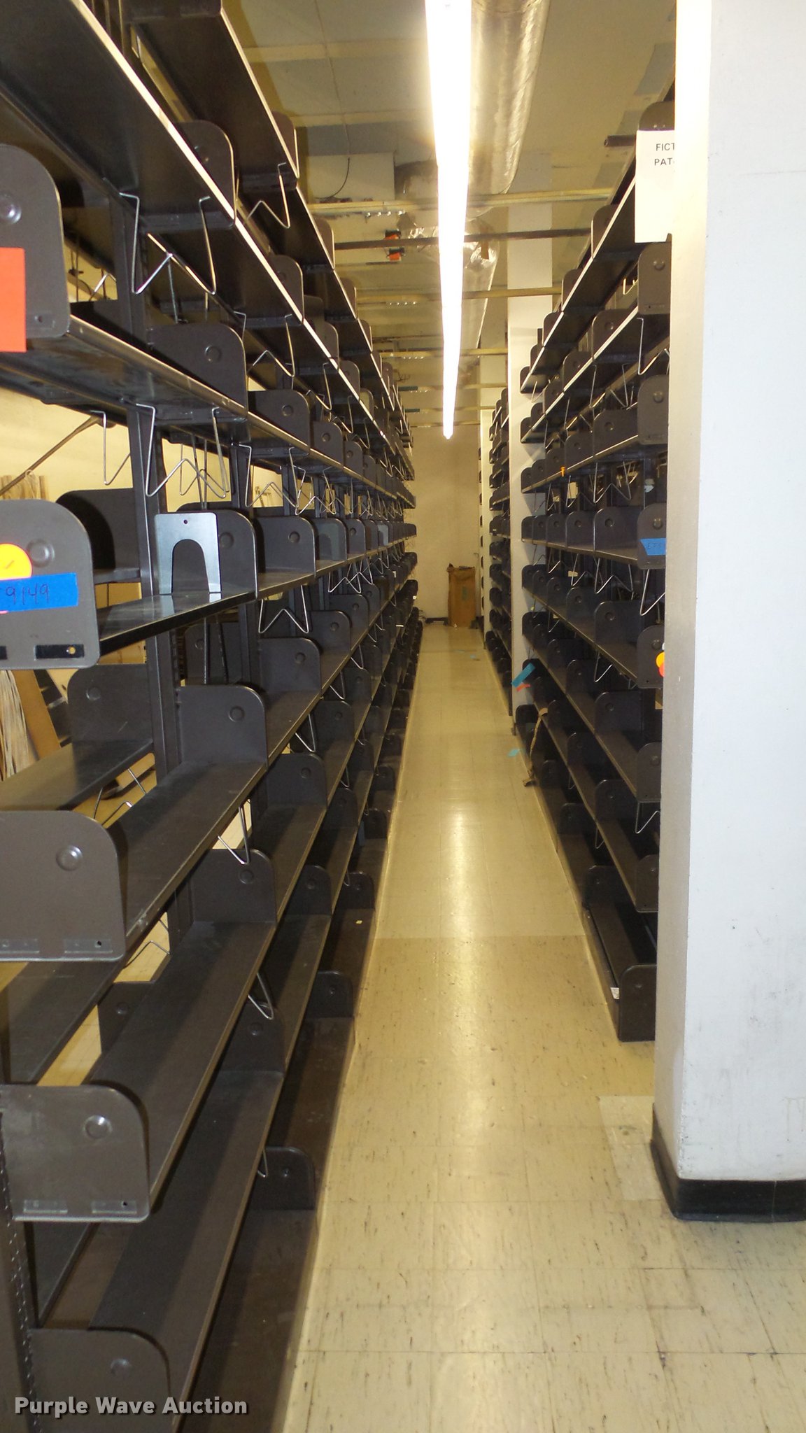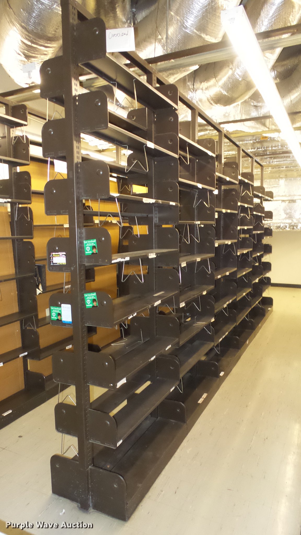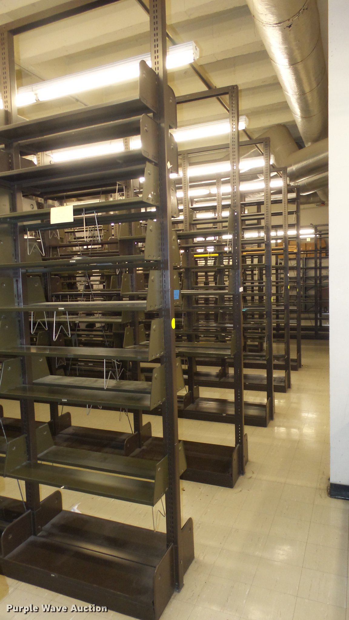 Purple Wave is selling a used Shelving and Storage in Kansas. This item is a Bookcases with the following: (63) sections, Approximately 1,000', 6' to 30' sections, Most 18' to 24', 8 to 10 shelves per section, 108" to 118"H, 21"W, Additional shelves, brackets, uprights, and back stops, Location basement #12, 13, 4, 5