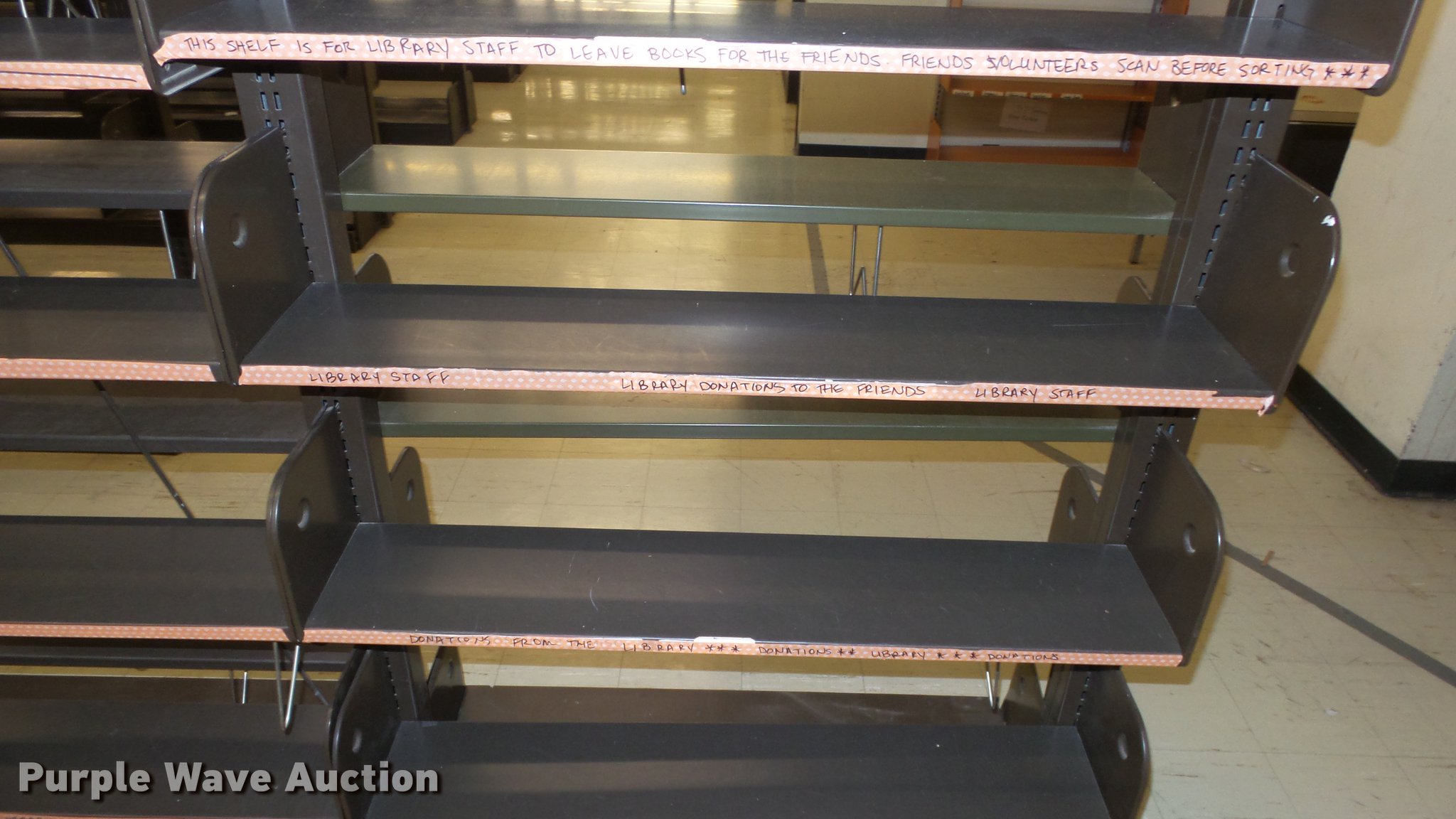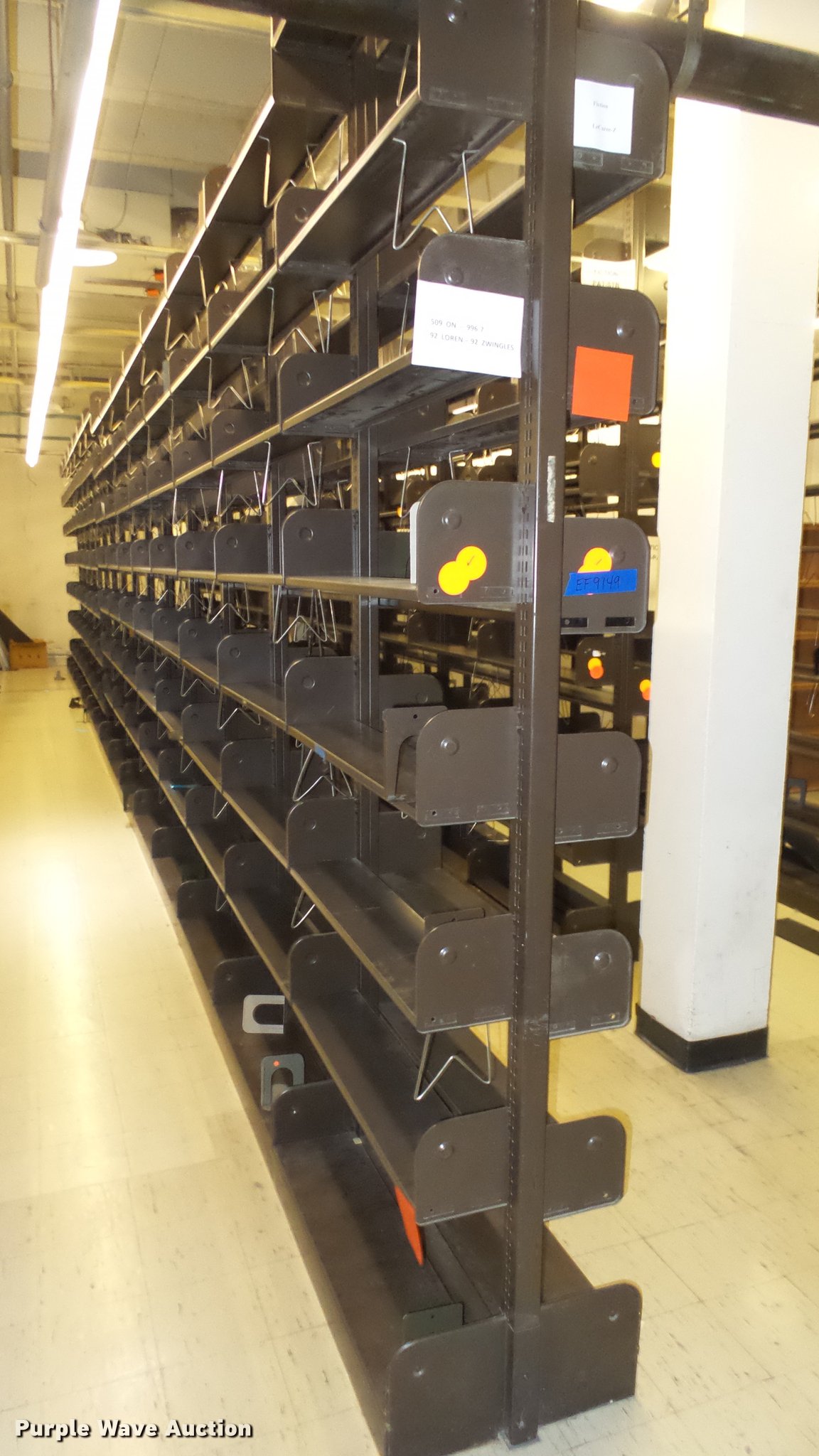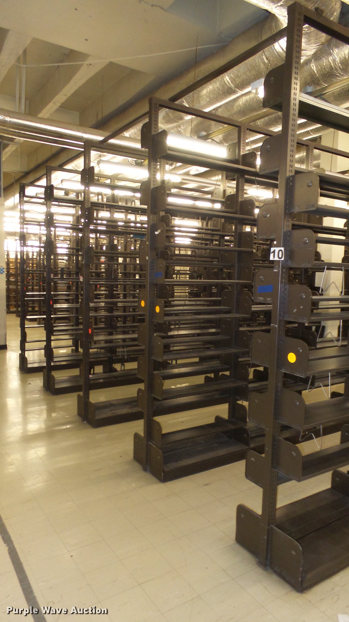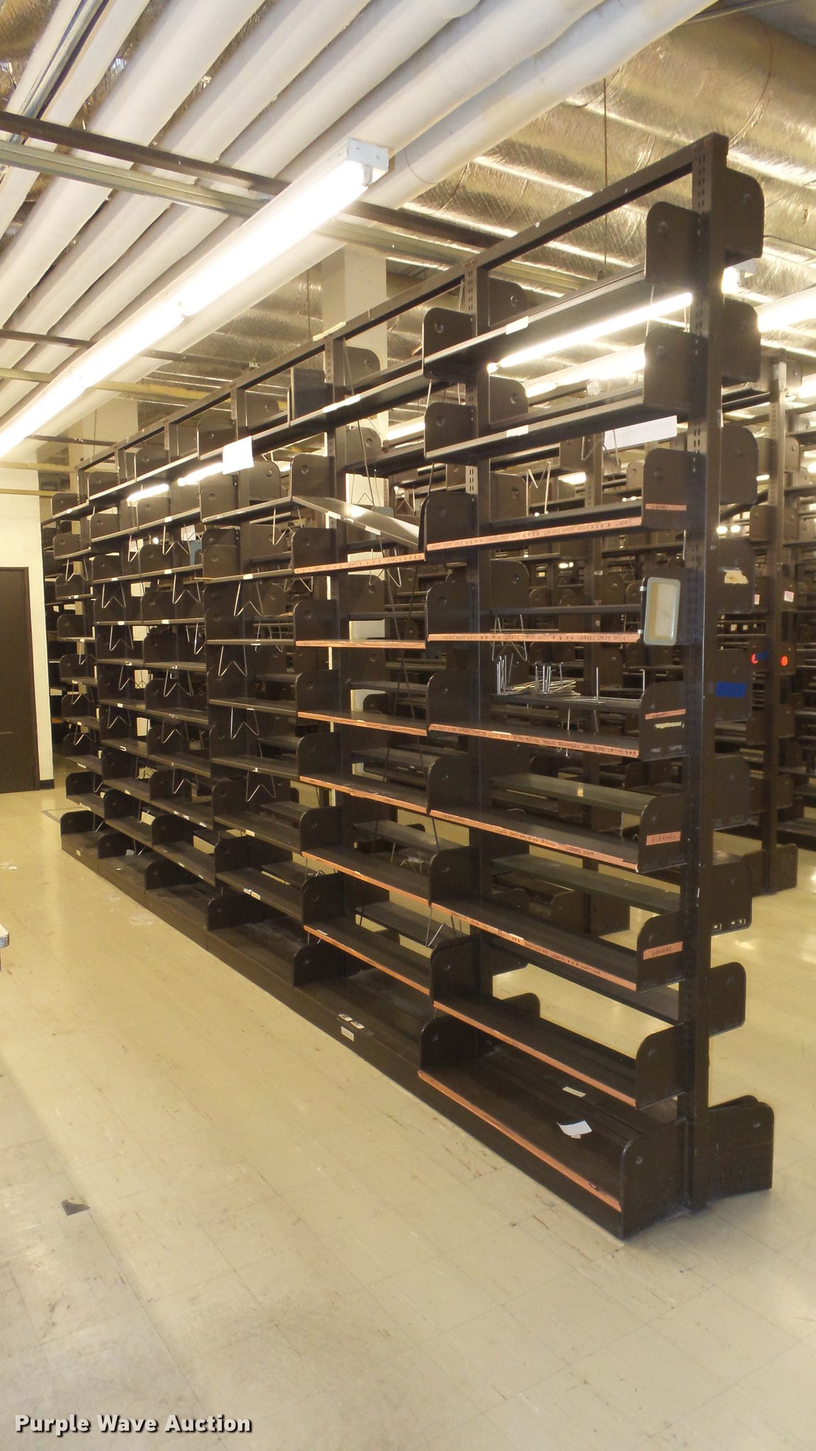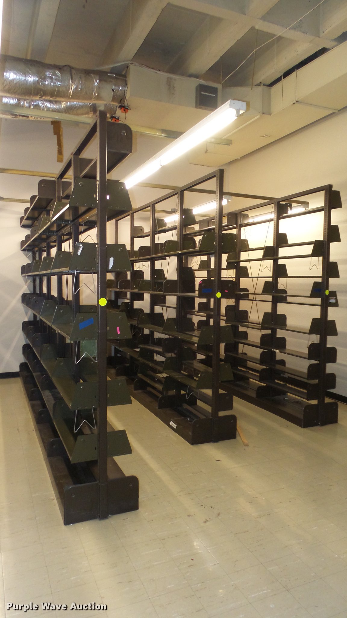 Purple Wave is selling a used Shelving and Storage in Kansas. This item is a Bookcases with the following: (63) sections, Approximately 1,000', 6' to 30' sections, Most 18' to 24', 8 to 10 shelves per section, 108" to 118"H, 21"W, Additional shelves, brackets, uprights, and back stops, Location basement #12, 13, 4, 5