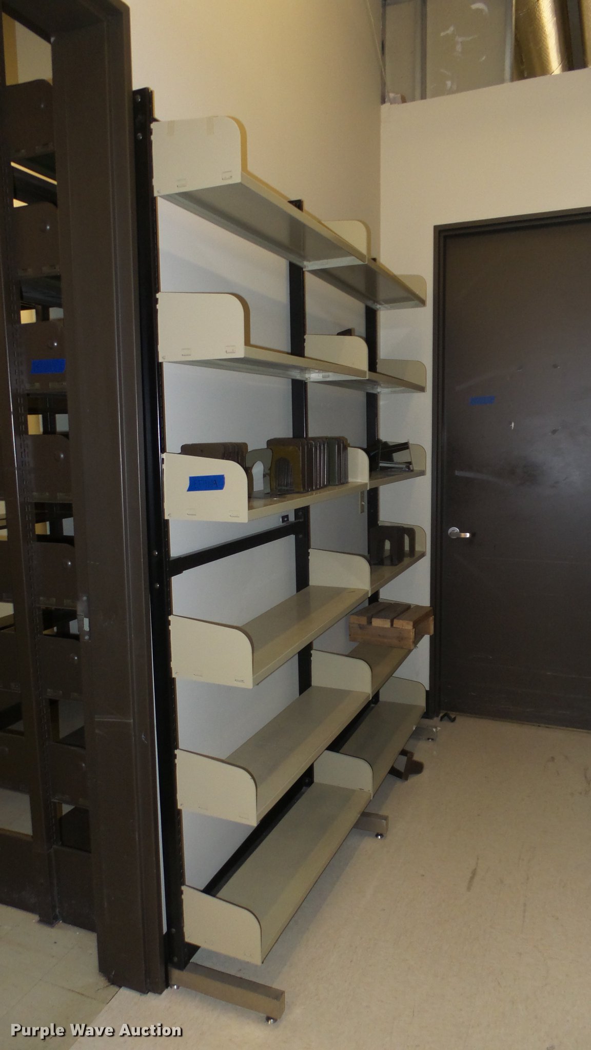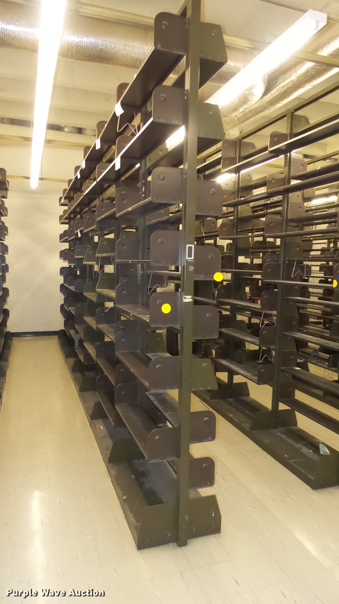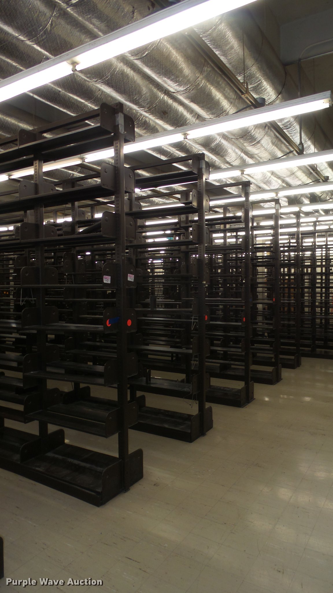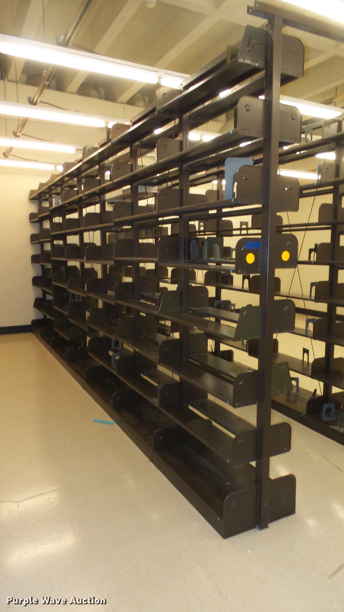 Purple Wave is selling a used Shelving and Storage in Kansas. This item is a Bookcases with the following: (63) sections, Approximately 1,000', 6' to 30' sections, Most 18' to 24', 8 to 10 shelves per section, 108" to 118"H, 21"W, Additional shelves, brackets, uprights, and back stops, Location basement #12, 13, 4, 5