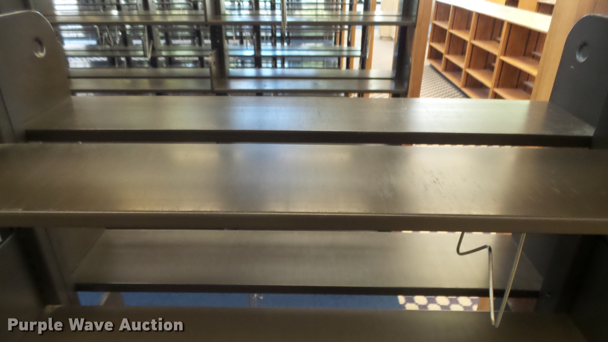 Purple Wave is selling a used Shelving and Storage in Kansas. This item is a (19) floor-to-ceiling style bookshelves with the following: 5-8 tier, Adjustable, Steel frame and shelves, Wood sides and top, Back to back shelves, (6) 219.5"W x 22"D x 91"H, (13) 255.5"W x 22.5"D x 91"H, Location 1st floor