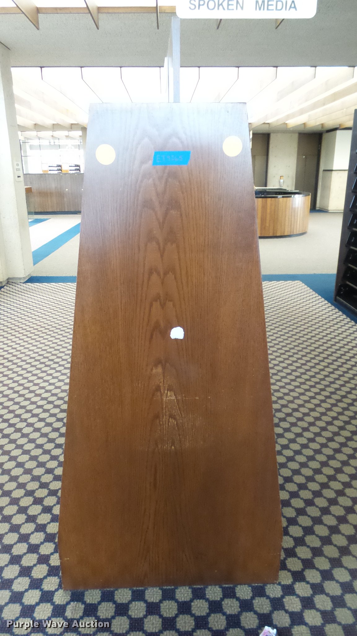 (5) bookshelves. (2) 146"W x 32"D x 74"H Slanted metal shelves, Wood surround, 146"W x 36"D x 70"H Slanted metal shelves , Wood surround, Wood hexagon bookshelf 22" x 67"H, Metal bookshelf 24" x 66"H, Location 1st floor. City of Wichita Former Central Public Library - Open inspection Aug. 22. 223 S Main. Wichita, KS 67202