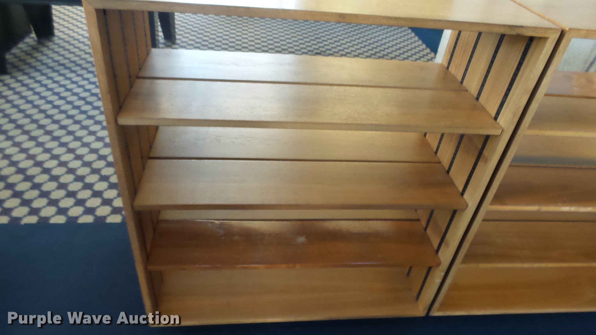 Purple Wave is selling a used Shelving and Storage in Kansas. This item is a (4) wood bookcases with the following: 9'W x 16"D x 42"H, Adjustable shelving, Location 1st floor
