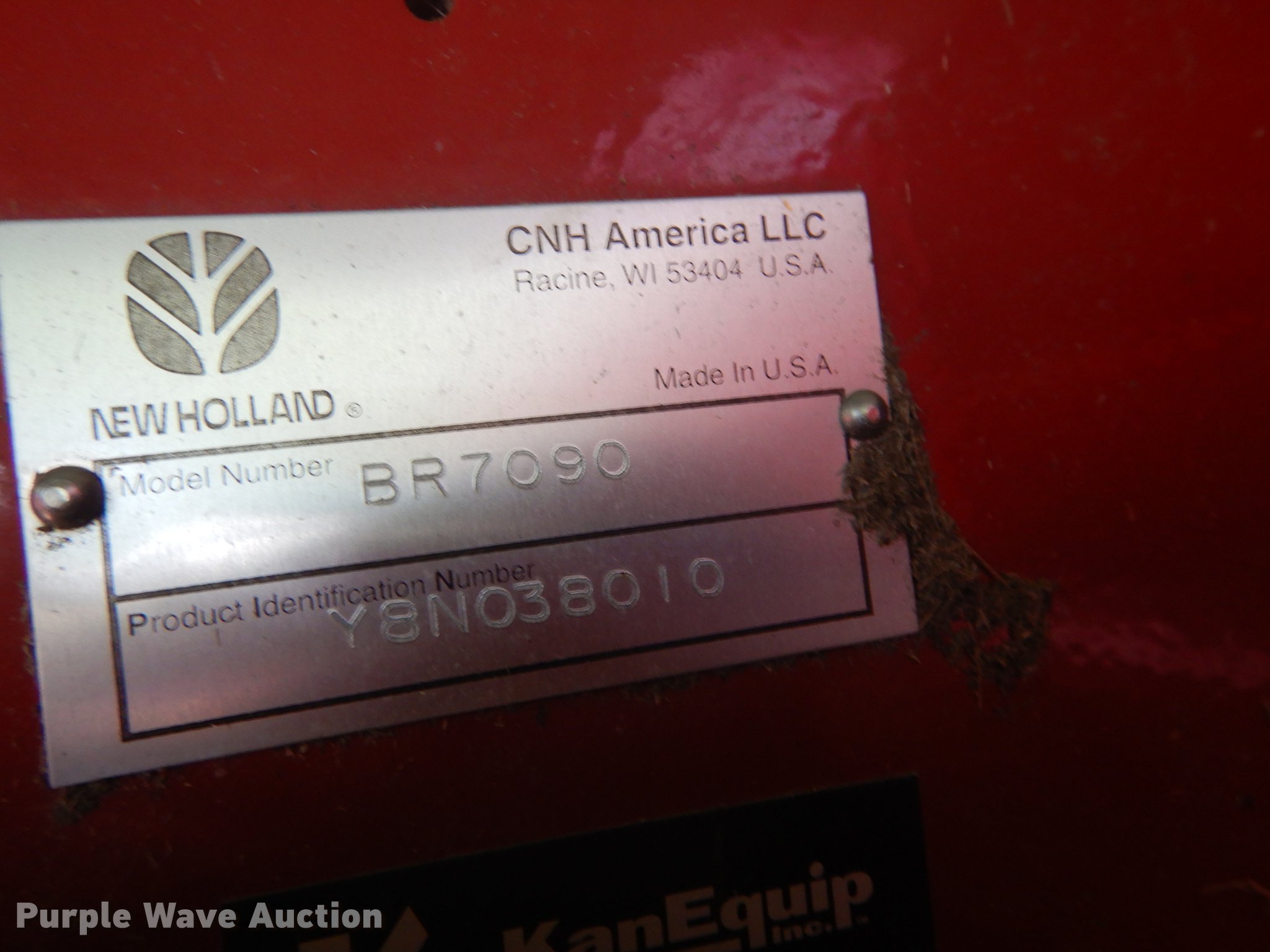 Purple Wave is selling a used Round Baler in Kansas. This item is a 2008 New Holland BR7090 round baler with the following: Approx. 6,500 bale count, 5' x 6' bale capacity, 8'W XtraSweep pickup, Hydraulic pickup lift, 4.80-8 gauge wheels, New Holland Bale Command Plus 86624474 monitor, Auto-tie, Twin twine tie, Bale ramp, 1000 PTO, Pin hitch, 480/45-17 tires, Serial Y8N038010
