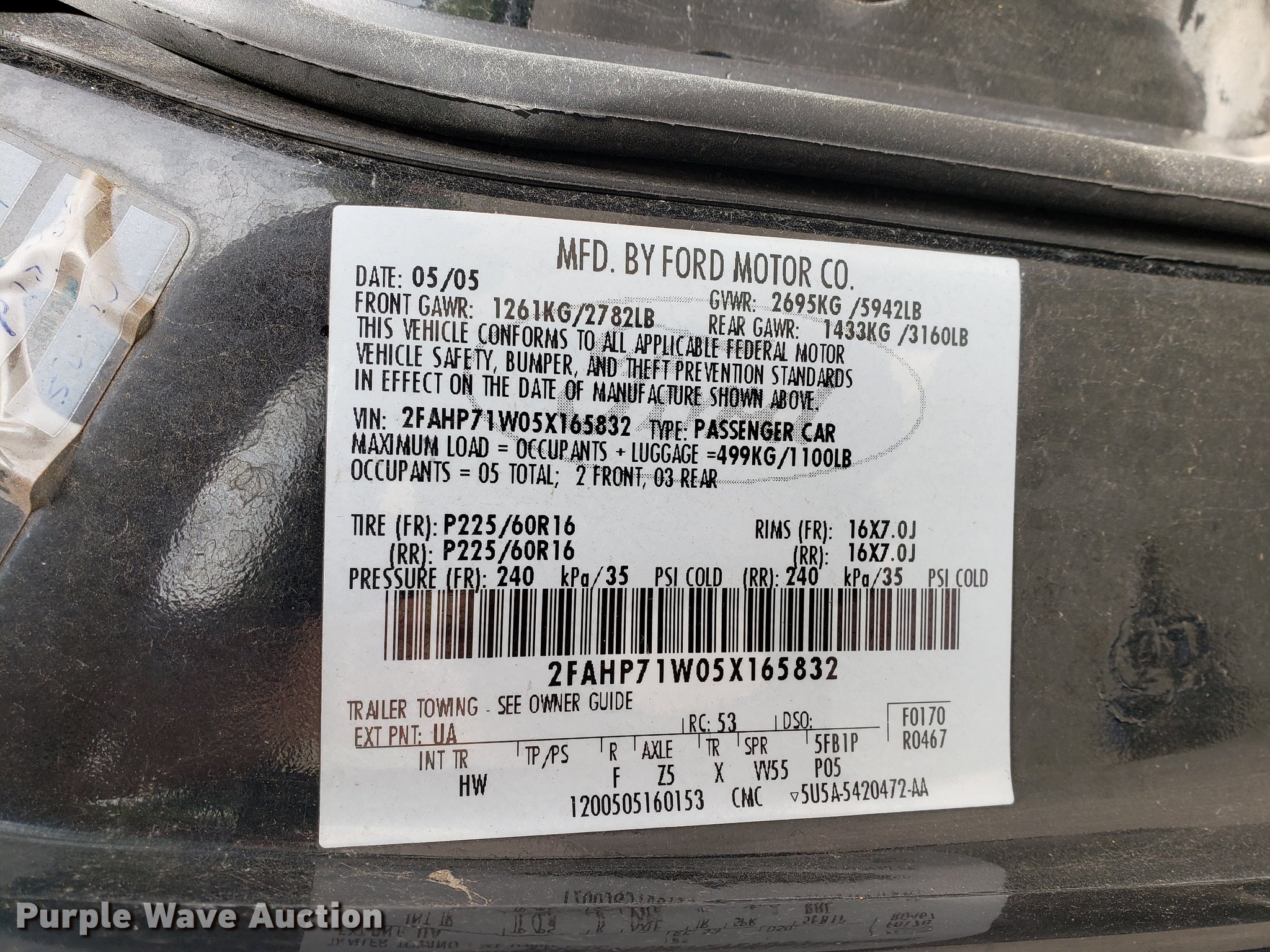 Purple Wave is selling a used Passenger Vehicle in Missouri. This item is a 2005 Ford Crown Victoria Police Interceptor with the following: 104,693 miles on odometer, 4.6L V8 SOHC 16V gas engine, Automatic transmission, AC and heat, Tilt, Cruise, AM/FM, Power windows, locks, and mirrors, Cloth interior, 225/60R16 tires