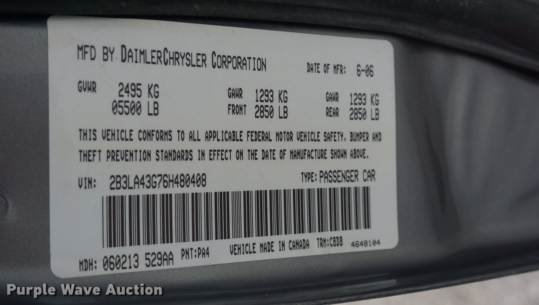 2006 Dodge Charger. 95,125 miles on odometer, 3.5L V6 SOHC 24V gas engine, Automatic transmission, AC and heat, Tilt, Cruise, AM/FM/CD, Power windows, locks, mirrors, and seat, Cloth interior, 225/60R18 tires, Center console removed. Kansas title. 2B3LA43G76H480408. City of Lenexa. 7700 Cottonwood St. Lenexa, KS 66216
