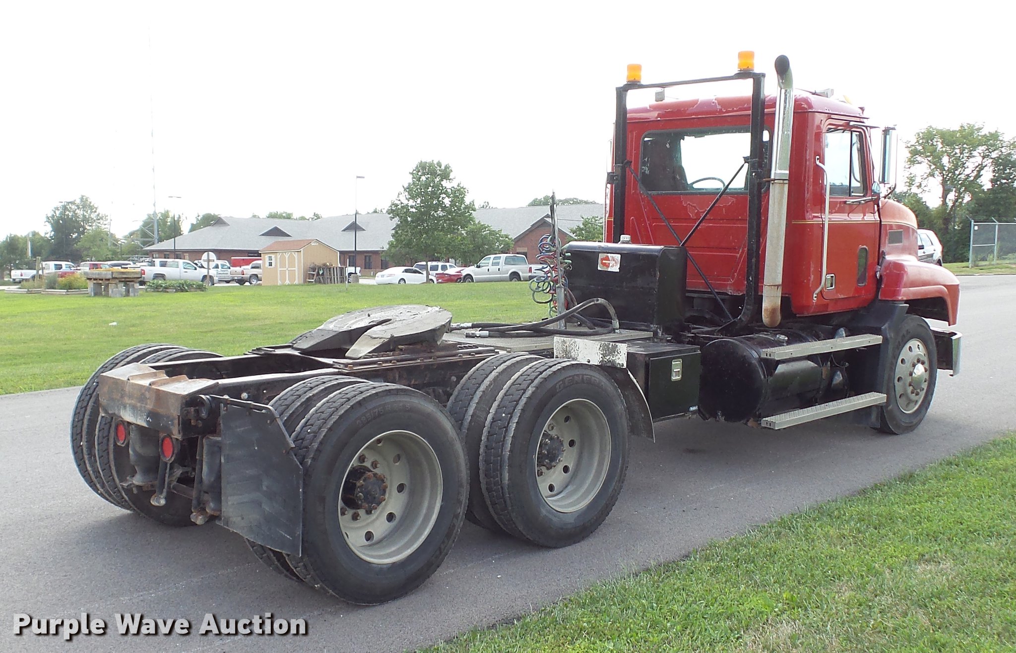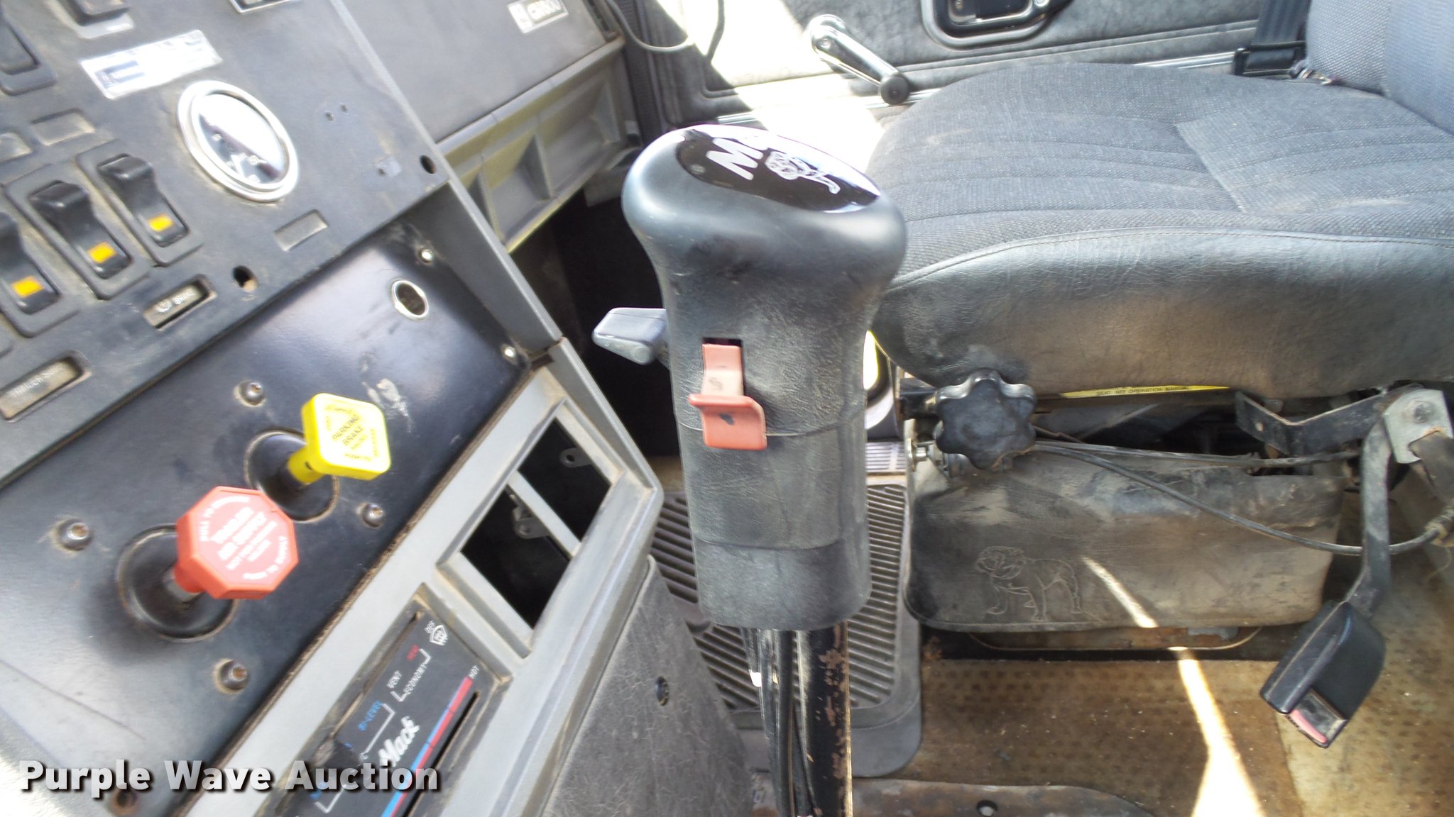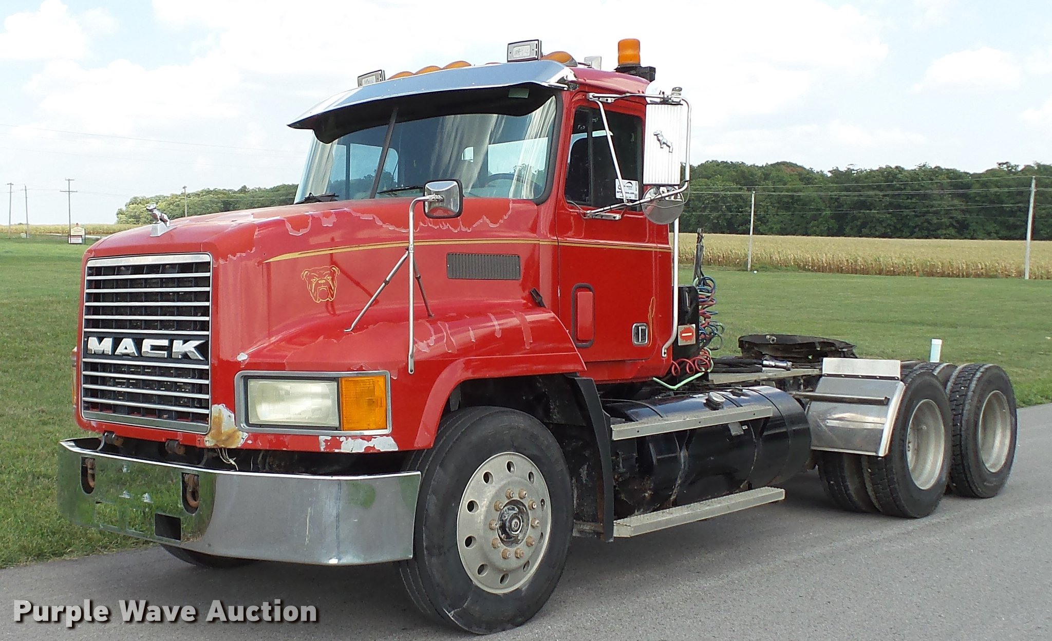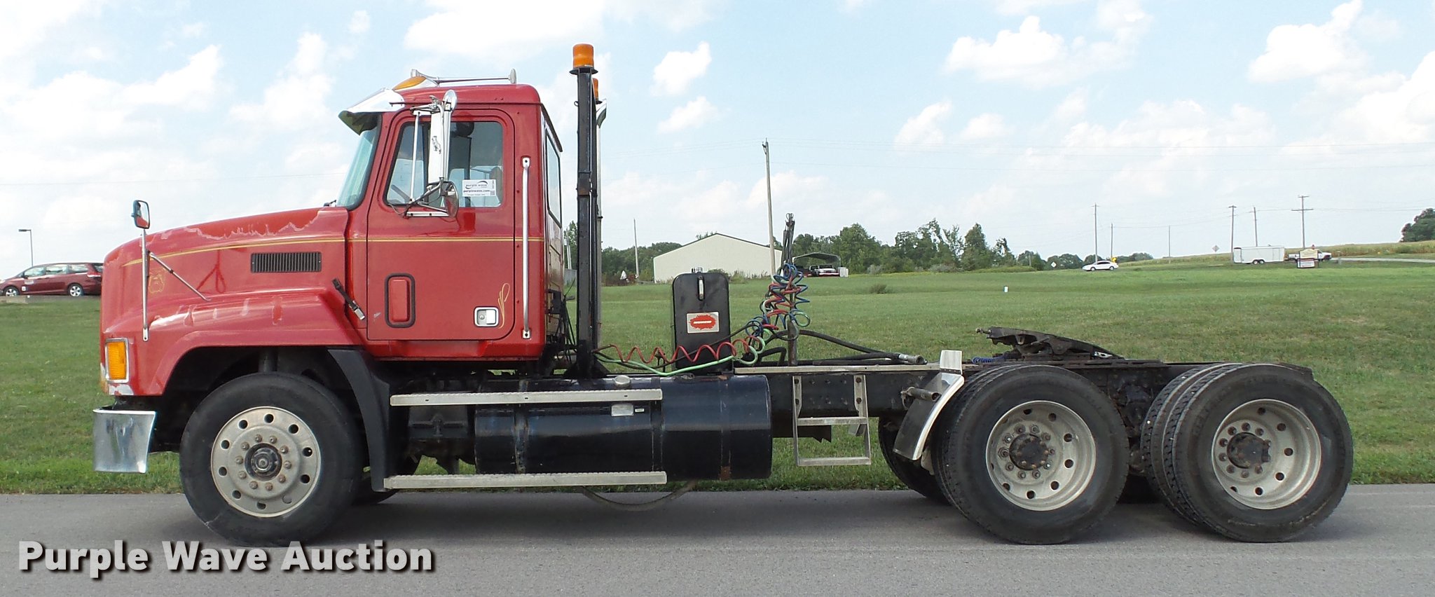 Purple Wave is selling a used Truck Tractor in Missouri. This item is a 1994 Mack CH613 semi truck with the following: 856,633 miles on odometer, 27,363 hours on meter, Mack 12.0L L6 turbo diesel engine, Maxitorque T2130 13 speed manual transmission, Tandem axle, AC and heat, Tilt, Cruise, AM/FM, Heated mirrors, Air suspension seat, Air ride cab, Beacon light, Block heater, Front tow hooks, Exterior visor, PTO, Wet kit, Single exhaust stack, Aluminum deck plate, Air operated sliding fifth wheel plate, Dual fuel tanks, Stainless steel quarter fenders, 206" wheelbase, Air suspension, Air brakes, Engine brake, Aluminum outer wheels, Steel inner wheels, 285/75R24.5 tires, Exhaust leak between turbo and exhaust manifold