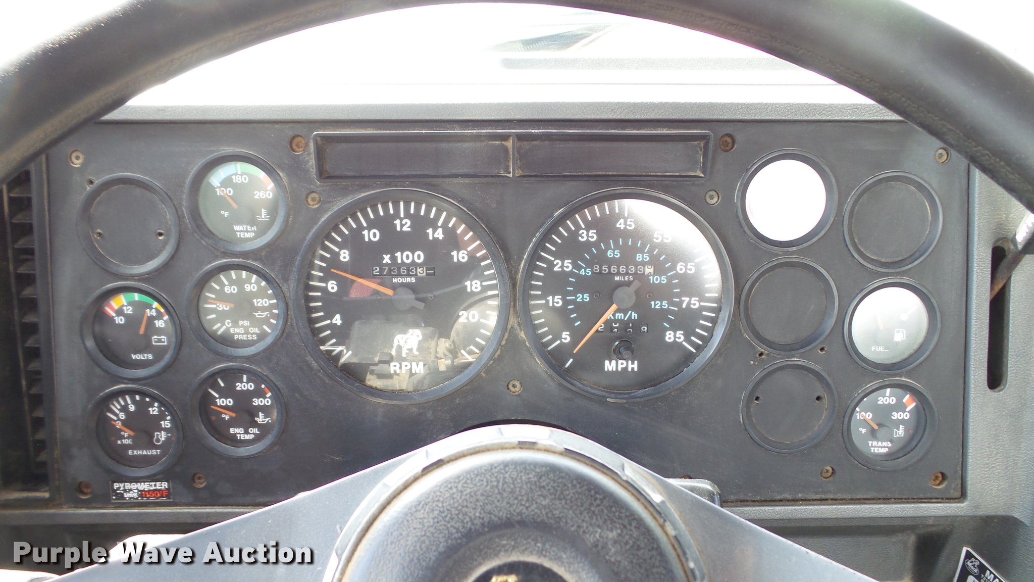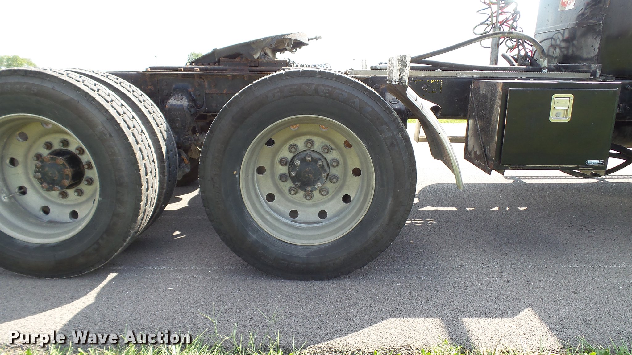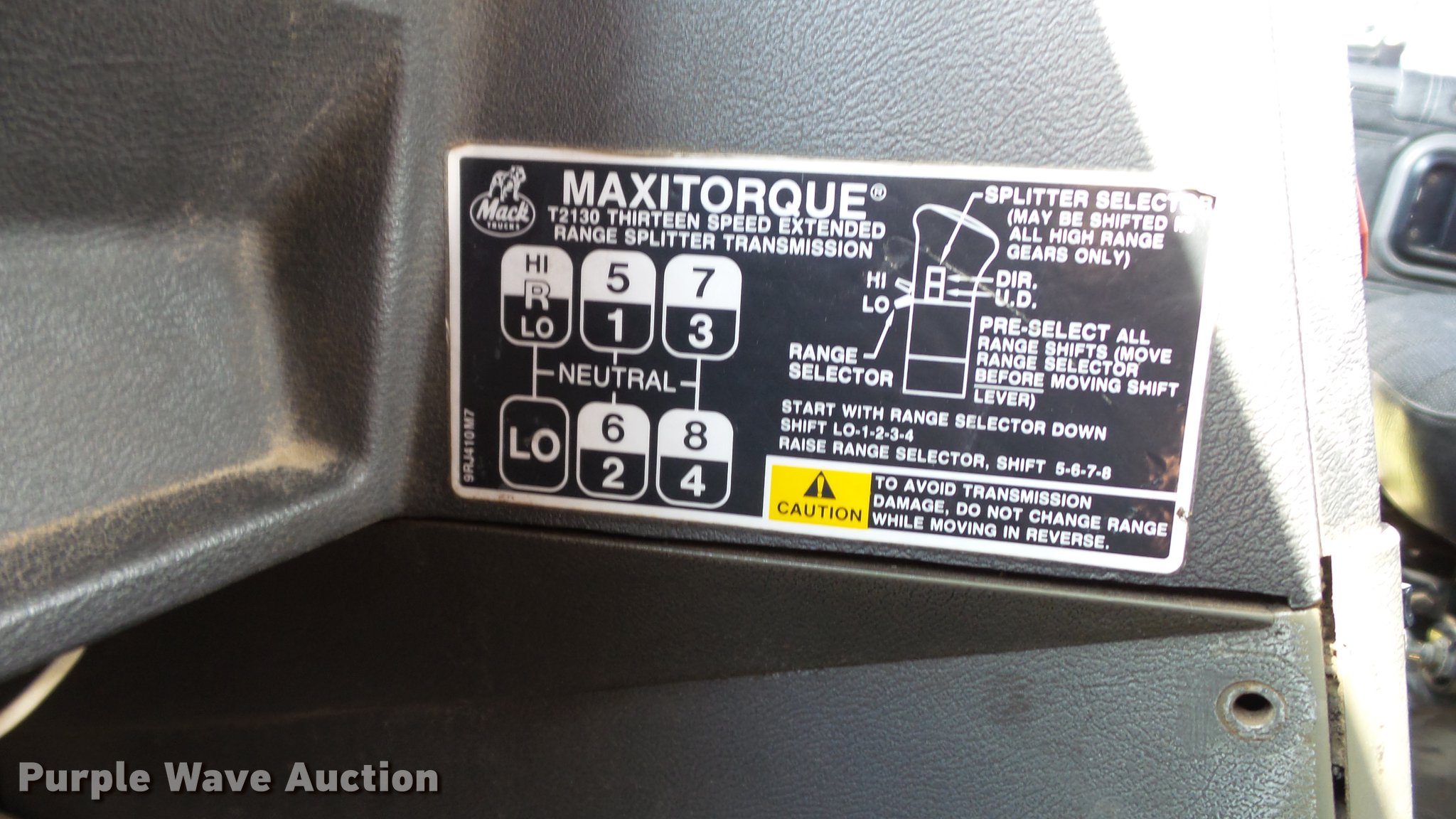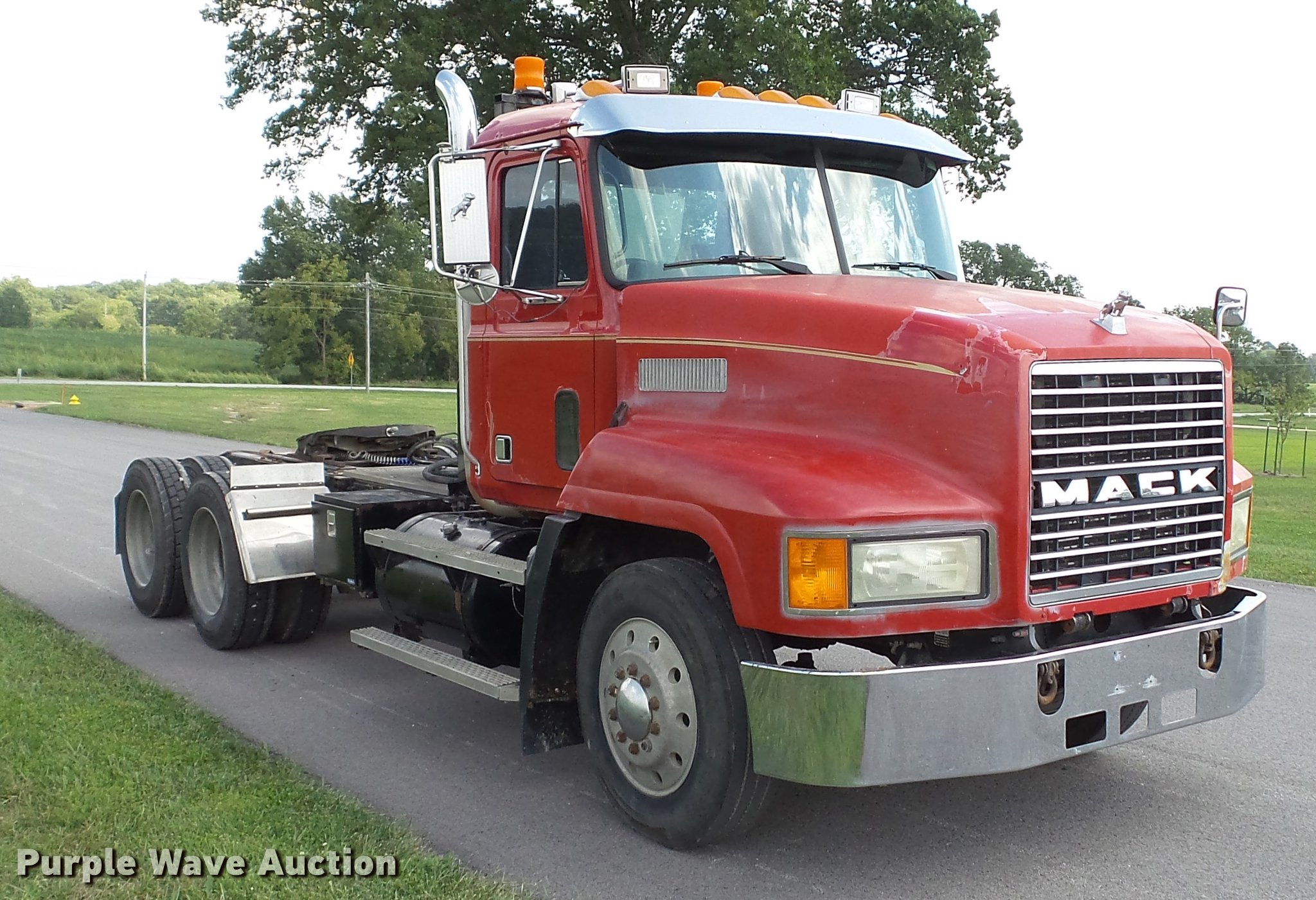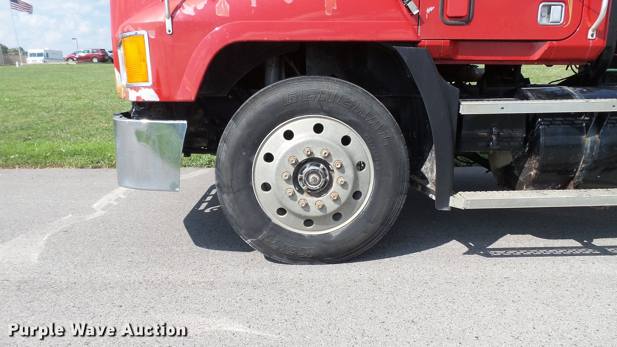 Purple Wave is selling a used Truck Tractor in Missouri. This item is a 1994 Mack CH613 semi truck with the following: 856,633 miles on odometer, 27,363 hours on meter, Mack 12.0L L6 turbo diesel engine, Maxitorque T2130 13 speed manual transmission, Tandem axle, AC and heat, Tilt, Cruise, AM/FM, Heated mirrors, Air suspension seat, Air ride cab, Beacon light, Block heater, Front tow hooks, Exterior visor, PTO, Wet kit, Single exhaust stack, Aluminum deck plate, Air operated sliding fifth wheel plate, Dual fuel tanks, Stainless steel quarter fenders, 206" wheelbase, Air suspension, Air brakes, Engine brake, Aluminum outer wheels, Steel inner wheels, 285/75R24.5 tires, Exhaust leak between turbo and exhaust manifold