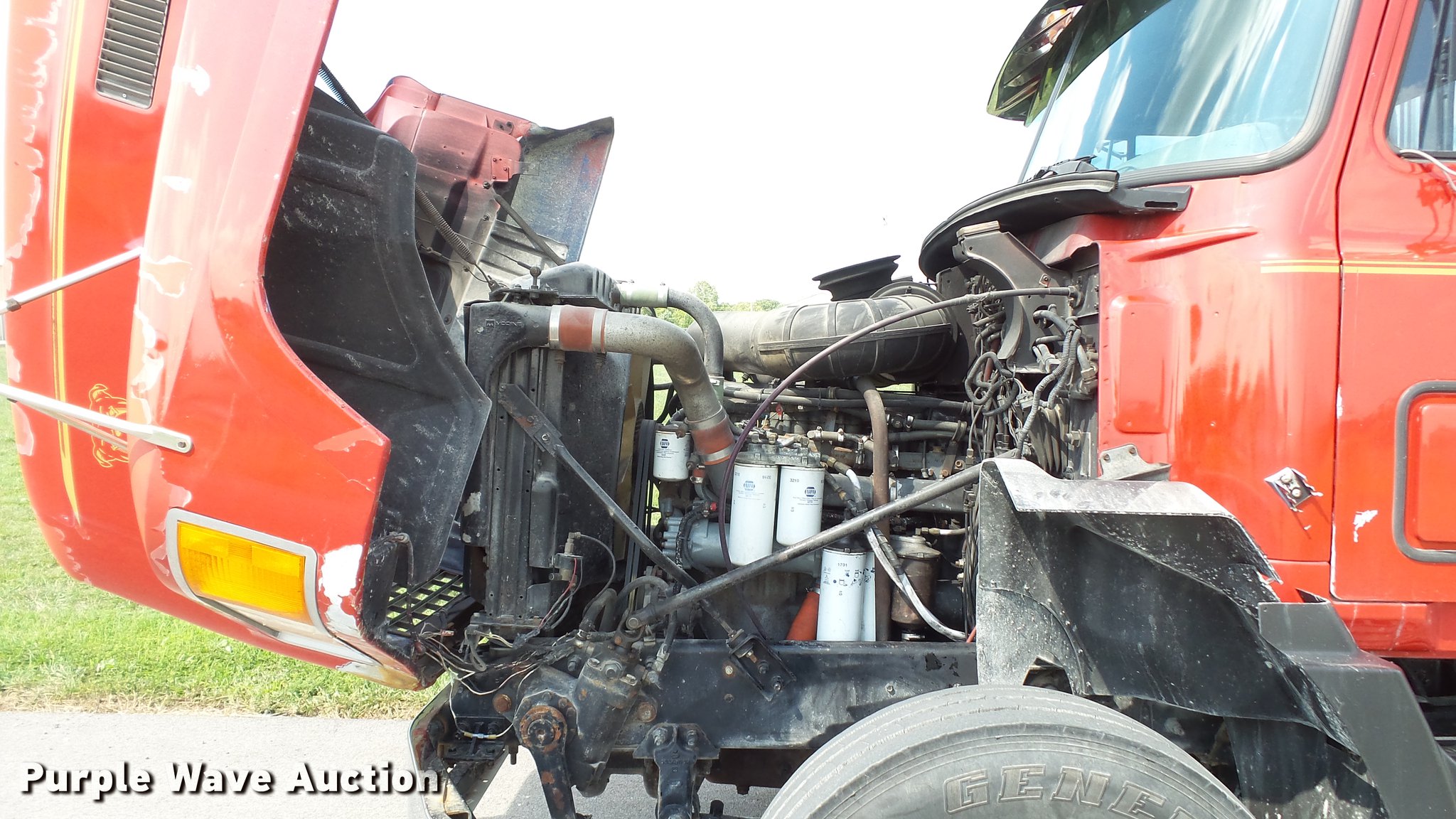1994 Mack CH613 semi truck. 856,633 miles on odometer, 27,363 hours on meter, Mack 12.0L L6 turbo diesel engine, Maxitorque T2130 13 speed manual transmission, Tandem axle, AC and heat, Tilt, Cruise, AM/FM, Heated mirrors, Air suspension seat, Air ride cab, Beacon light, Block heater, Front tow hooks, Exterior visor, PTO, Wet kit, Single exhaust stack, Aluminum deck plate, Air operated sliding fifth wheel plate, Dual fuel tanks, Stainless steel quarter fenders, 206" wheelbase, Air suspension, Air brakes, Engine brake, Aluminum outer wheels, Steel inner wheels, 285/75R24.5 tires, Exhaust leak between turbo and exhaust manifold. Missouri title. 1M2AA14Y3RW038772. Lincoln County. 219 Hwy H. Troy, MO 63379