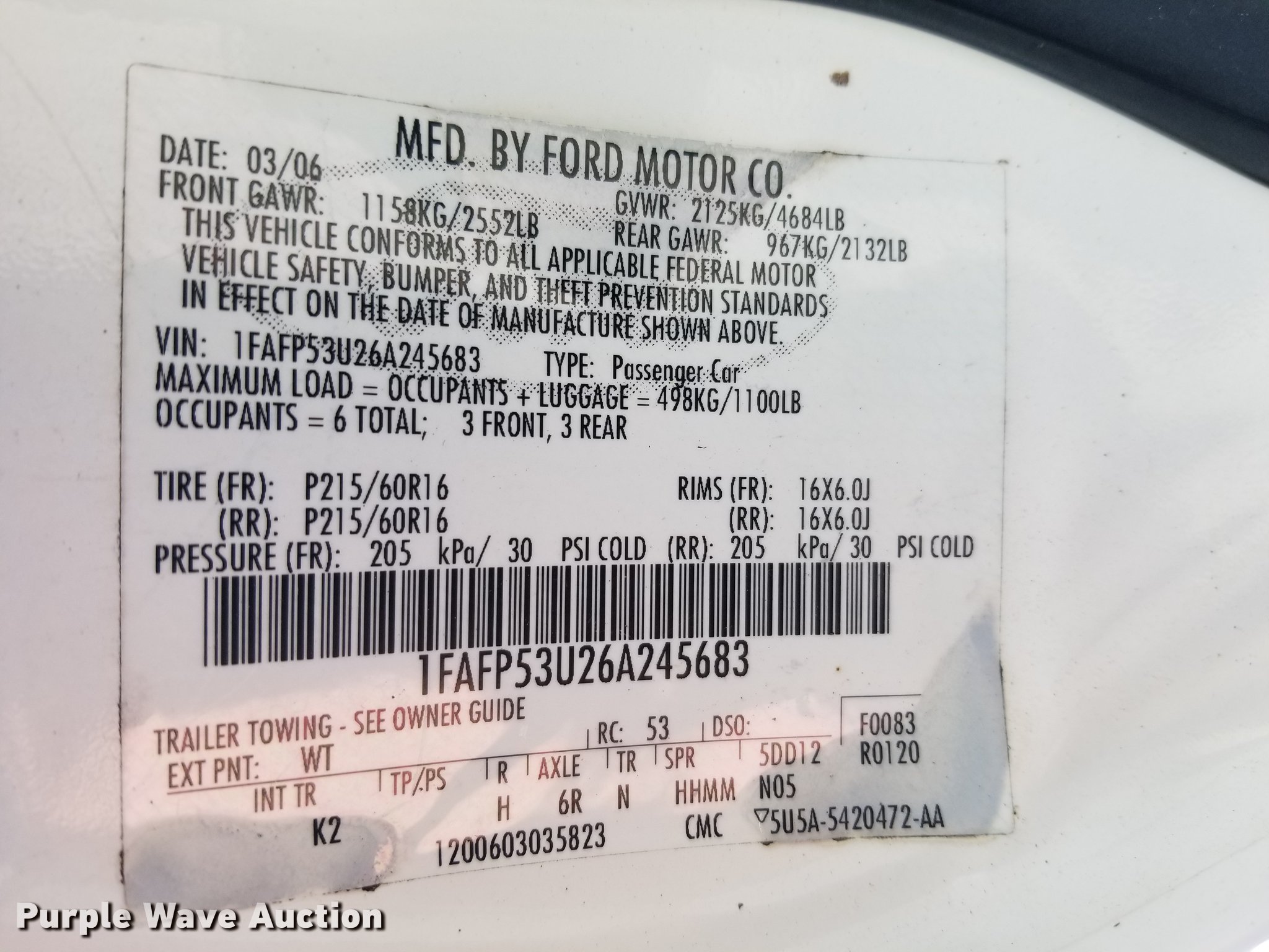Purple Wave is selling a used Passenger Vehicle in Kansas. This item is a 2006 Ford Taurus SE with the following: 58,132 miles on odometer, 3.0L V6 OHV 12V gas engine, Automatic transmission, AC and heat, Tilt, Cruise, AM/FM, Power windows, locks, and mirrors, Cloth interior, 215/60R16 tires, Dead battery
