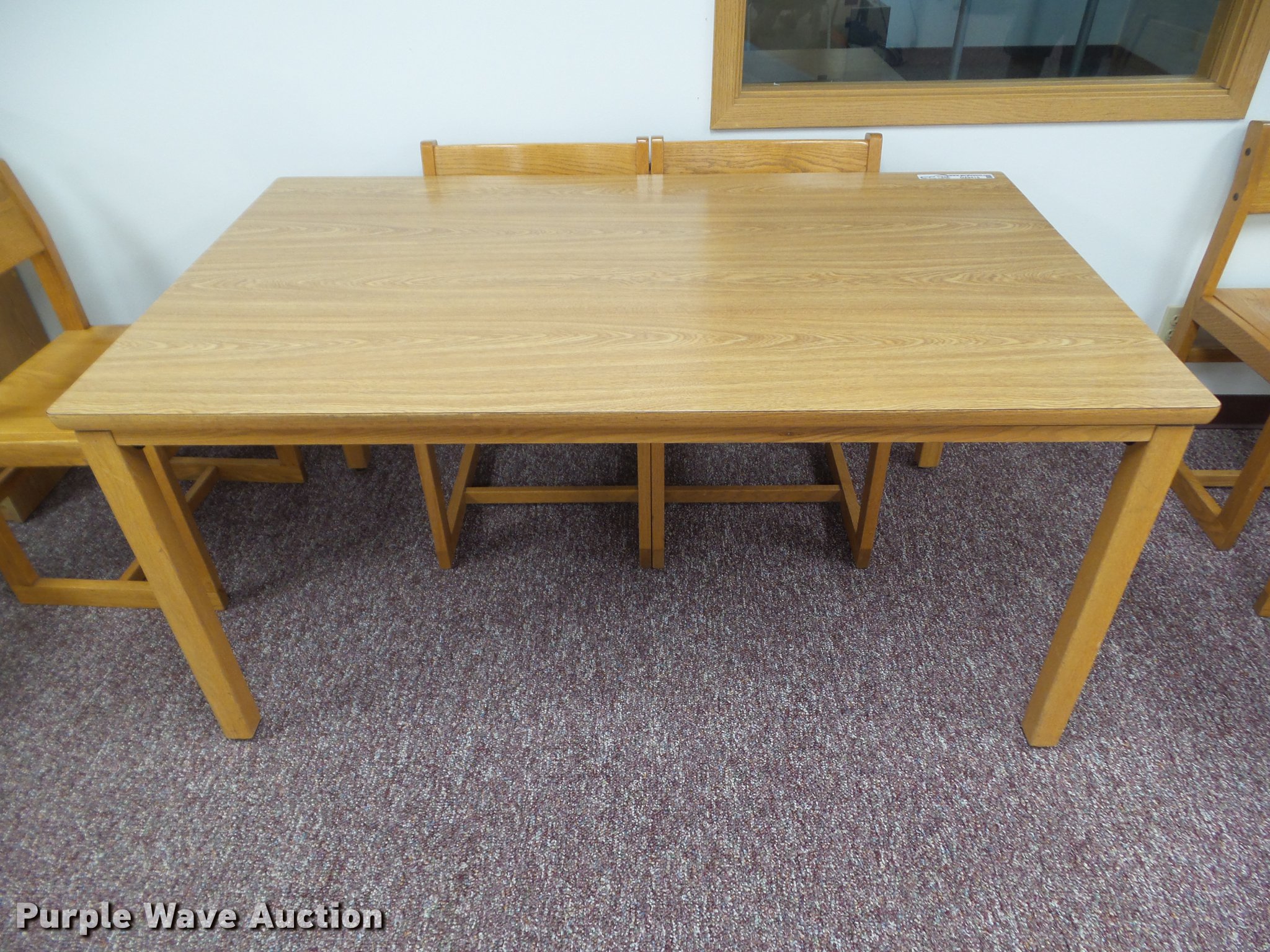 Purple Wave is selling a used Furniture in Iowa. This item is a (5) wood library tables with the following: 3' x 5' x 29", Chairs not included