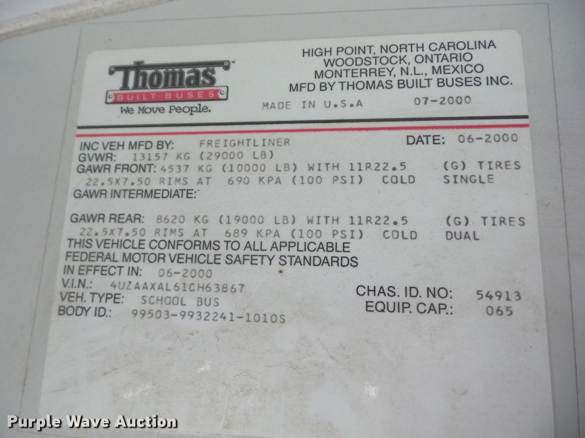 Purple Wave is selling a used Bus in Kansas. This item is a 2001 Freightliner FS65 school bus with the following: 207,673 miles on odometer, 2,669 hours on meter, Caterpillar 3126 7.2L L6 turbo diesel engine, Automatic transmission, Single axle, Heat, AM/FM, 65 passenger capacity, Ceiling, front, rear, and side emergency exits, Lighted stop sign, Spring suspension, Hydraulic brakes, 11R22.5 tires, GVWR 29,000 lbs