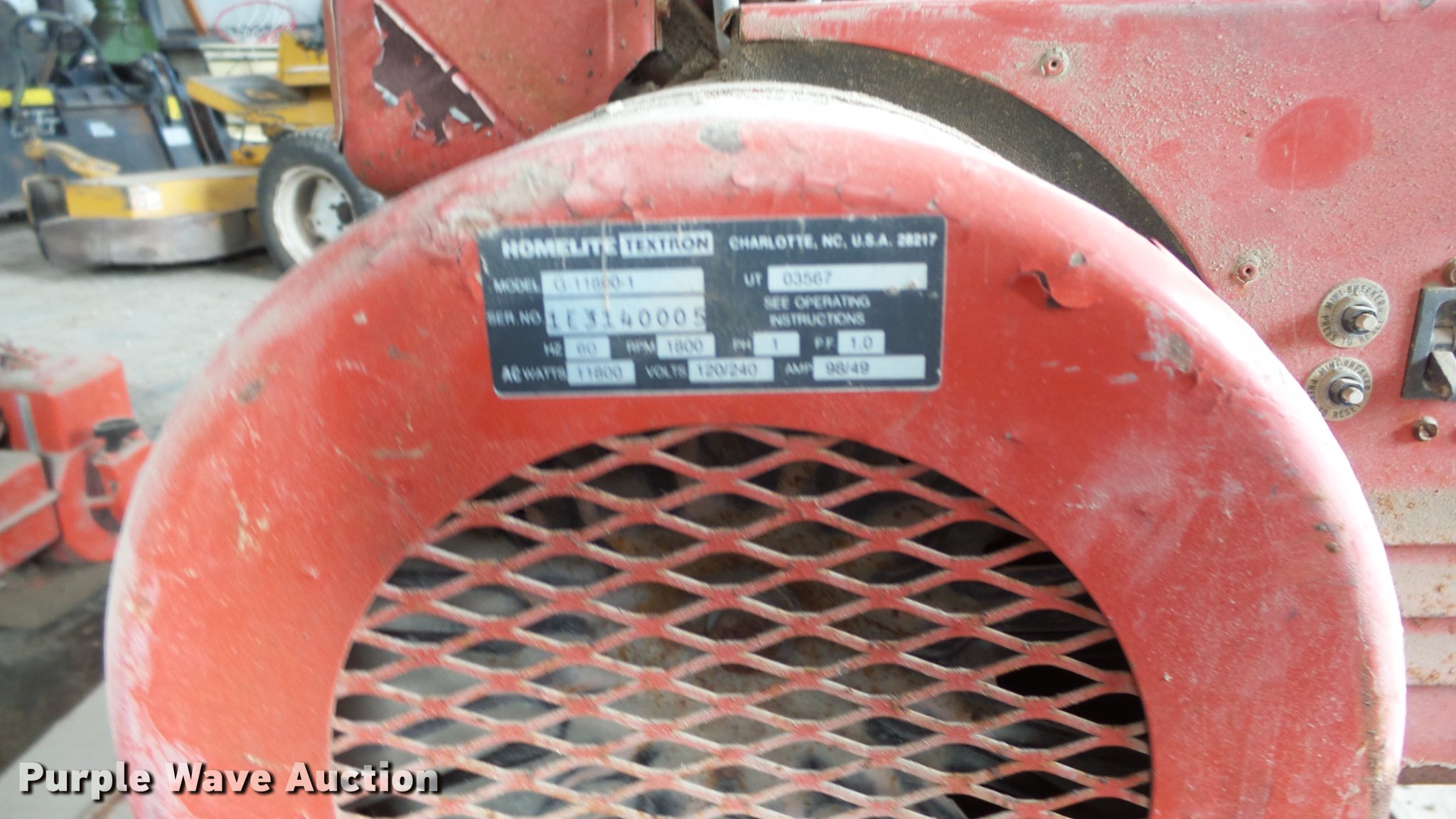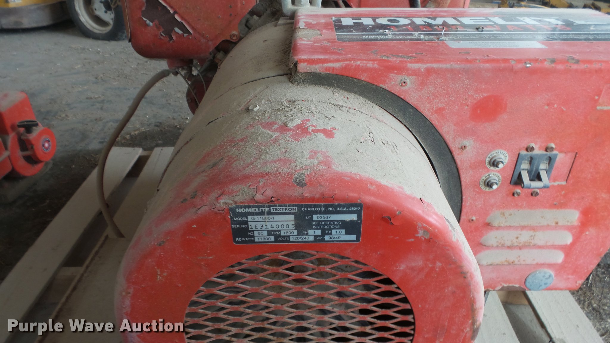 Purple Wave is selling a used Generator Set in Kansas. This item is a Homelite G-11800-1 generator with the following: Wisconsin gas engine, 11,800 watts, 120/240V, Single phase, Unknown operating condition