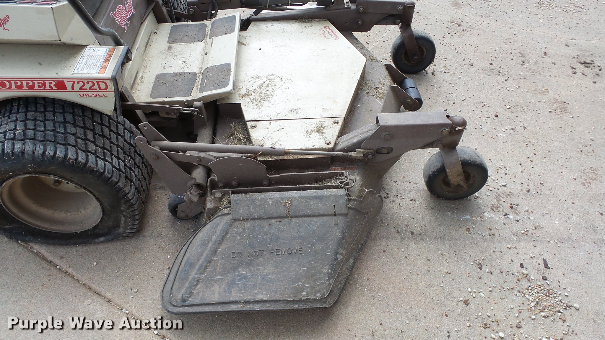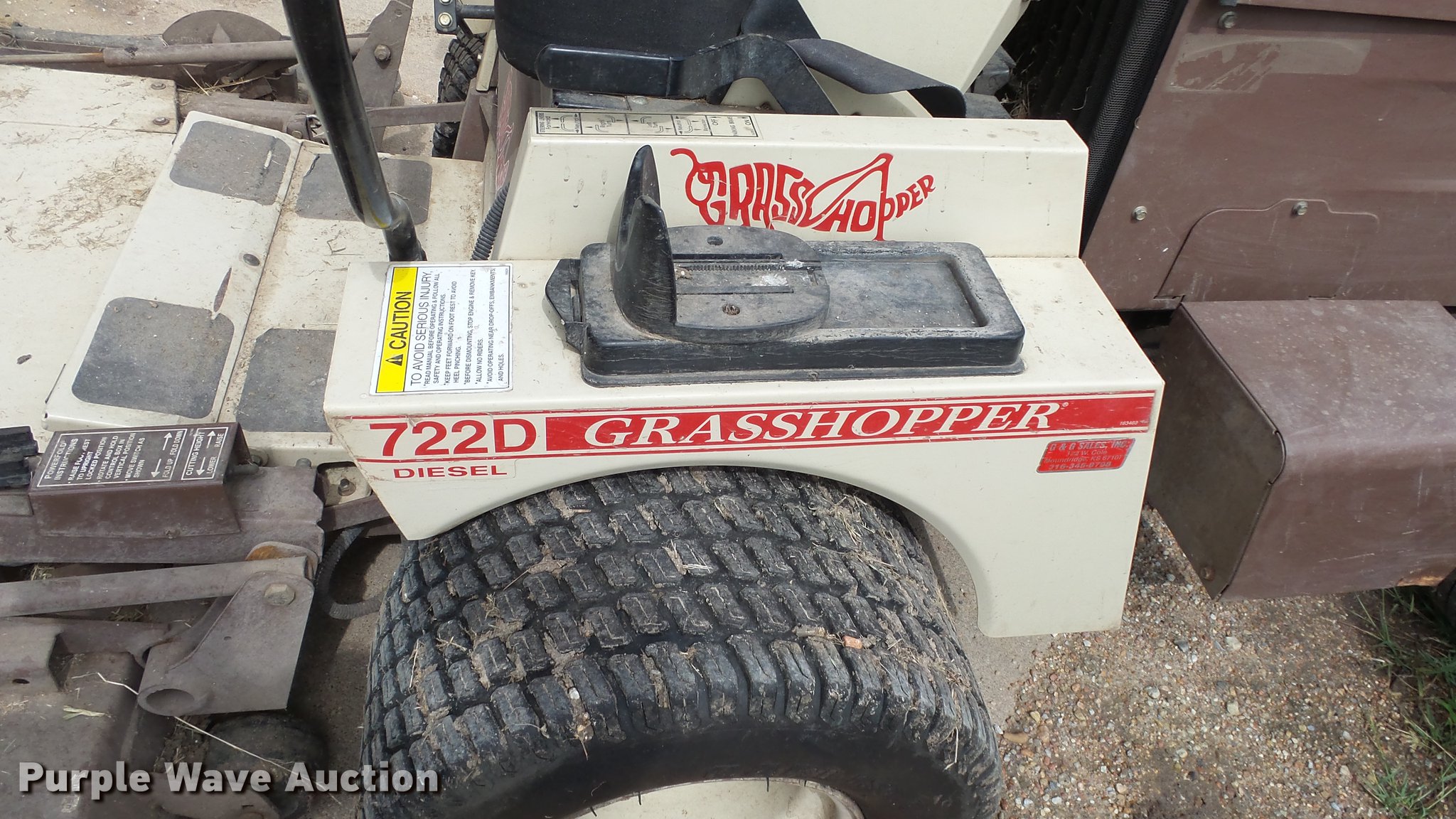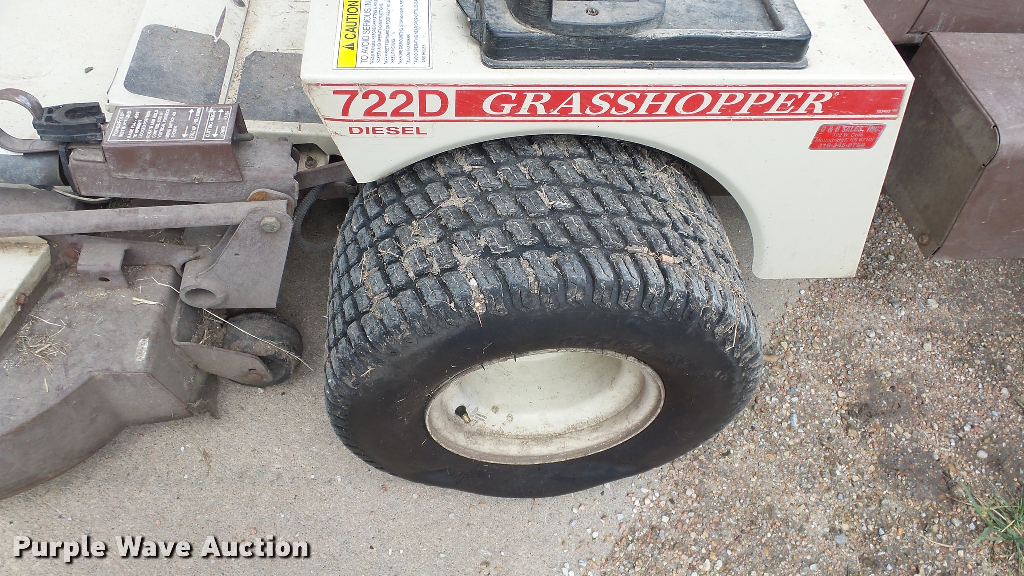 Purple Wave is selling a used Lawn Mower in Kansas. This item is a Grasshopper 722D ZTR lawn mower with the following: 2,552 hours on meter, 52" cut, Kubota three cylinder diesel engine, Hydrostatic transmission, Work lights, 23x10.00-10 tires