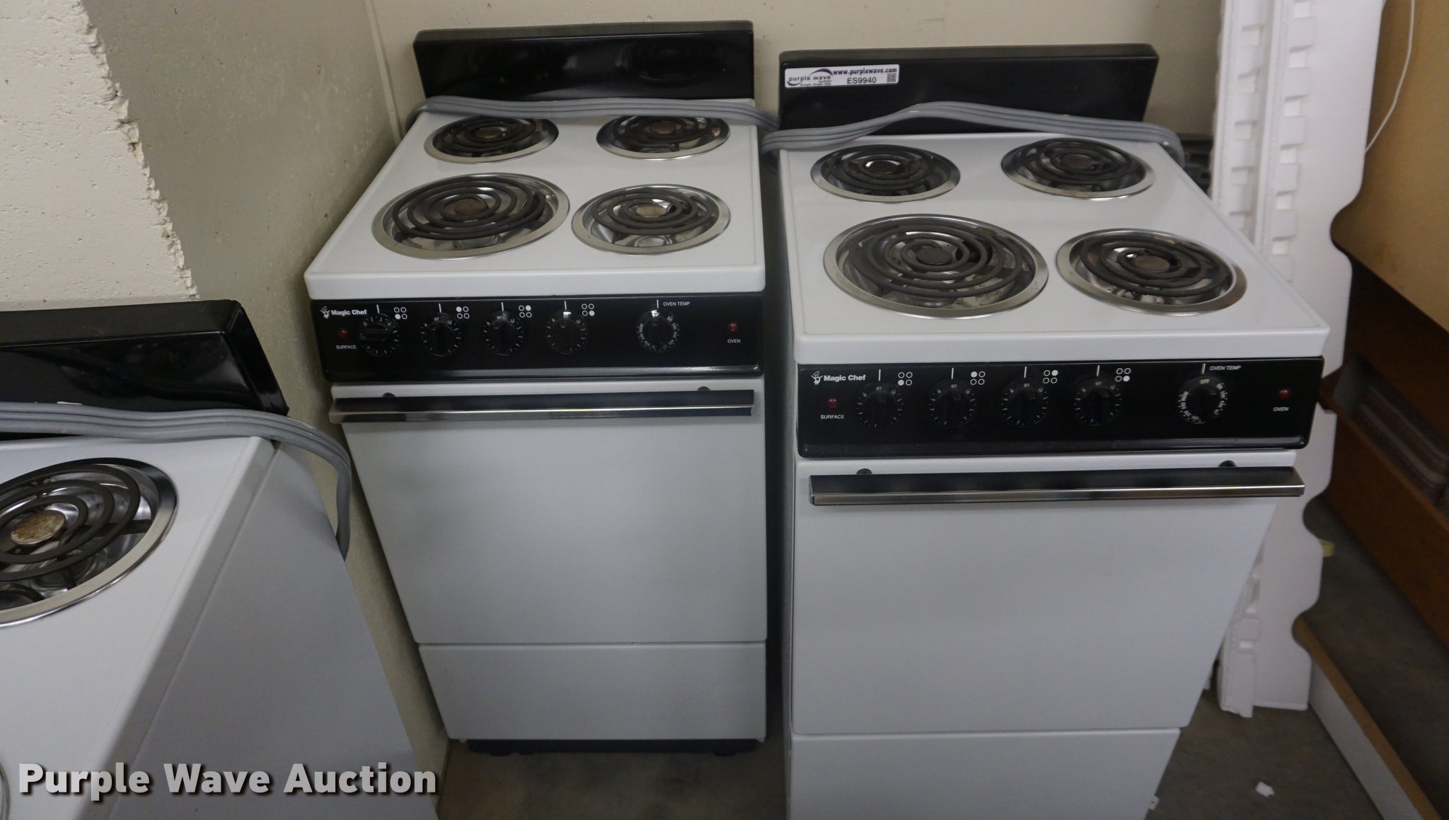 Purple Wave is selling a used Appliances in Kansas. This item is a (4) Magic Chef range ovens with the following: 20"W x 24"D x 40"H, Four burners, 220V