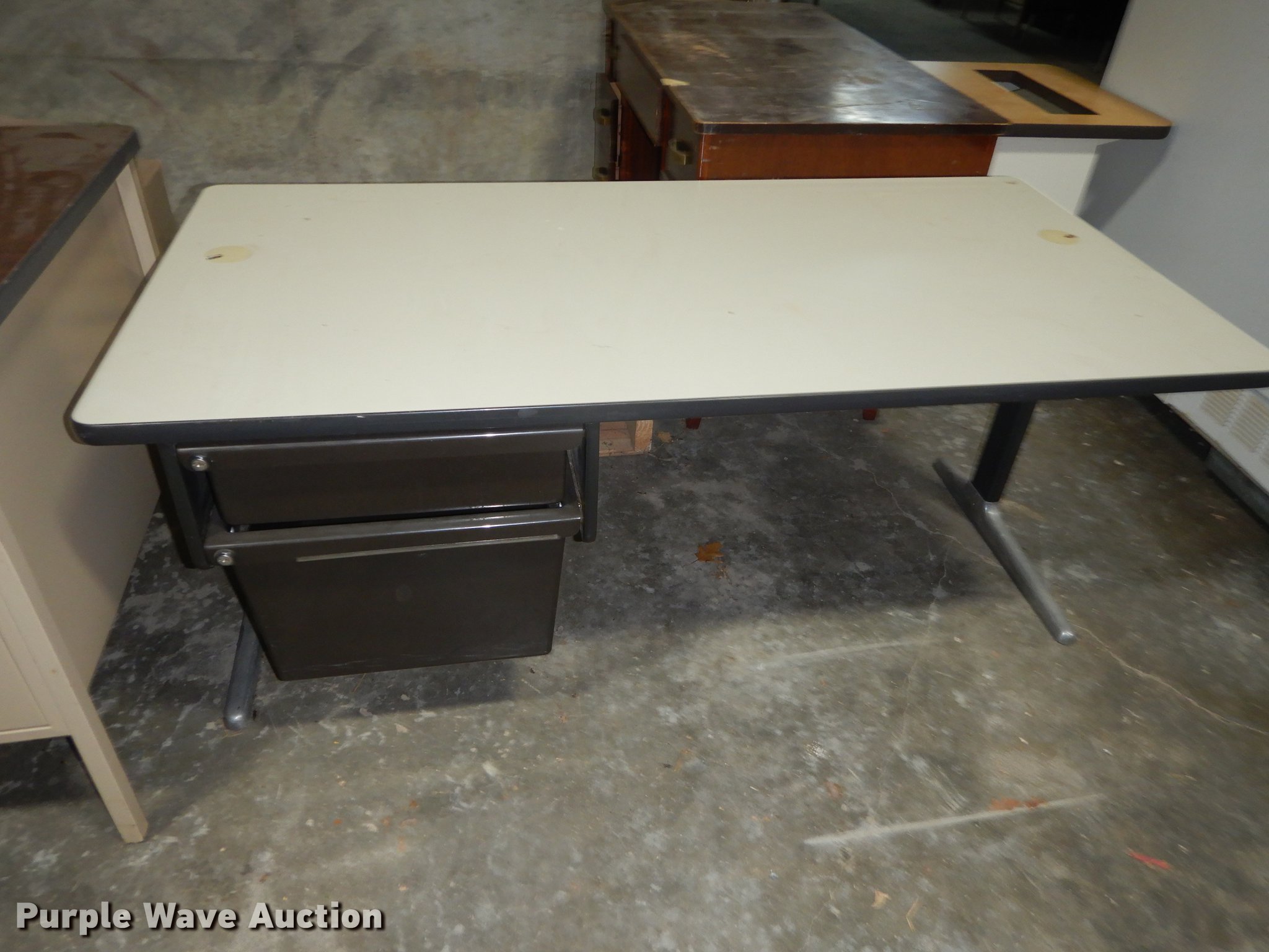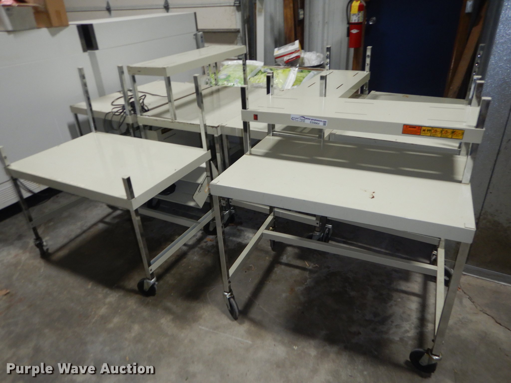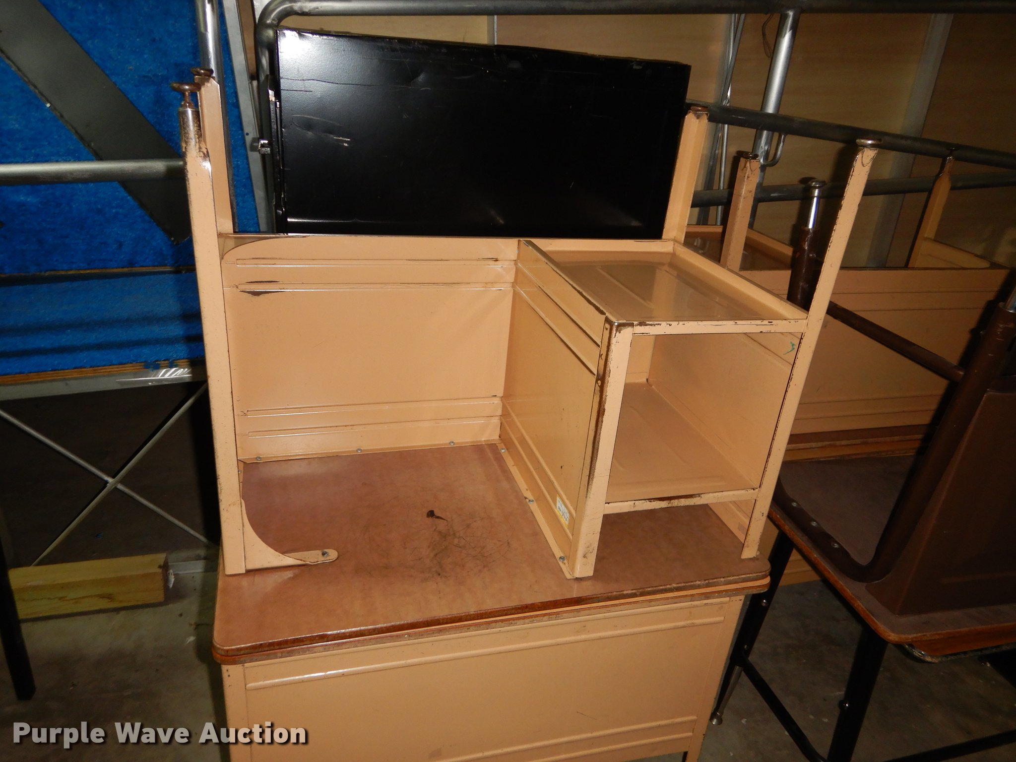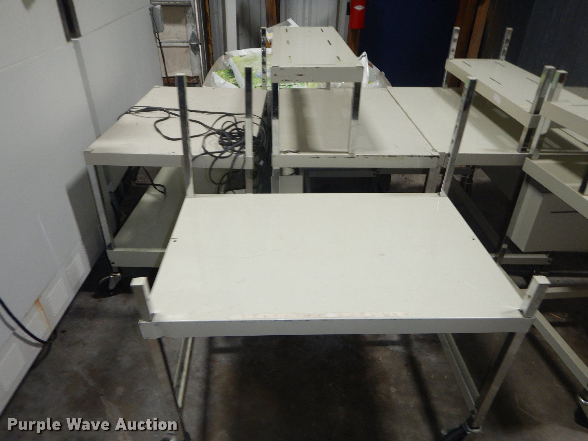 Purple Wave is selling a used Furniture in Kansas. This item is a Furniture with the following: (6) 3' x 2' metal carts, (7) television carts, (14) tables and desks, Filing cabinet, Door frame