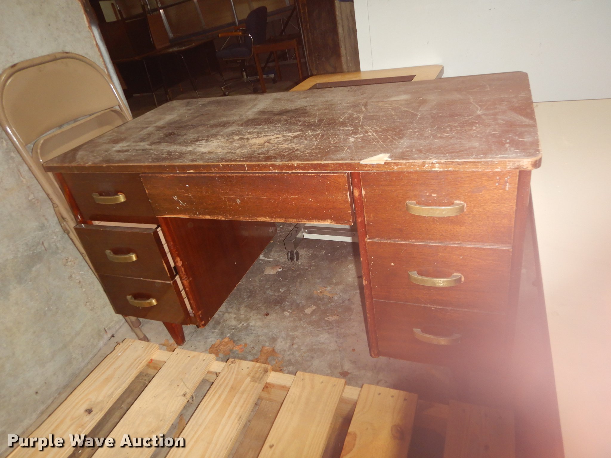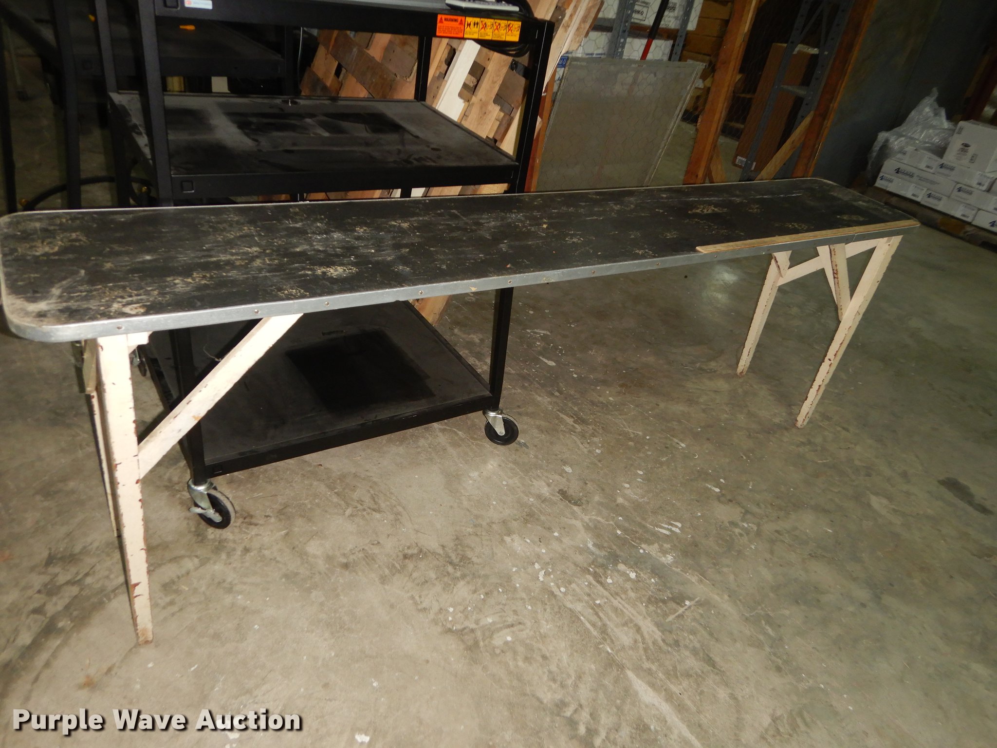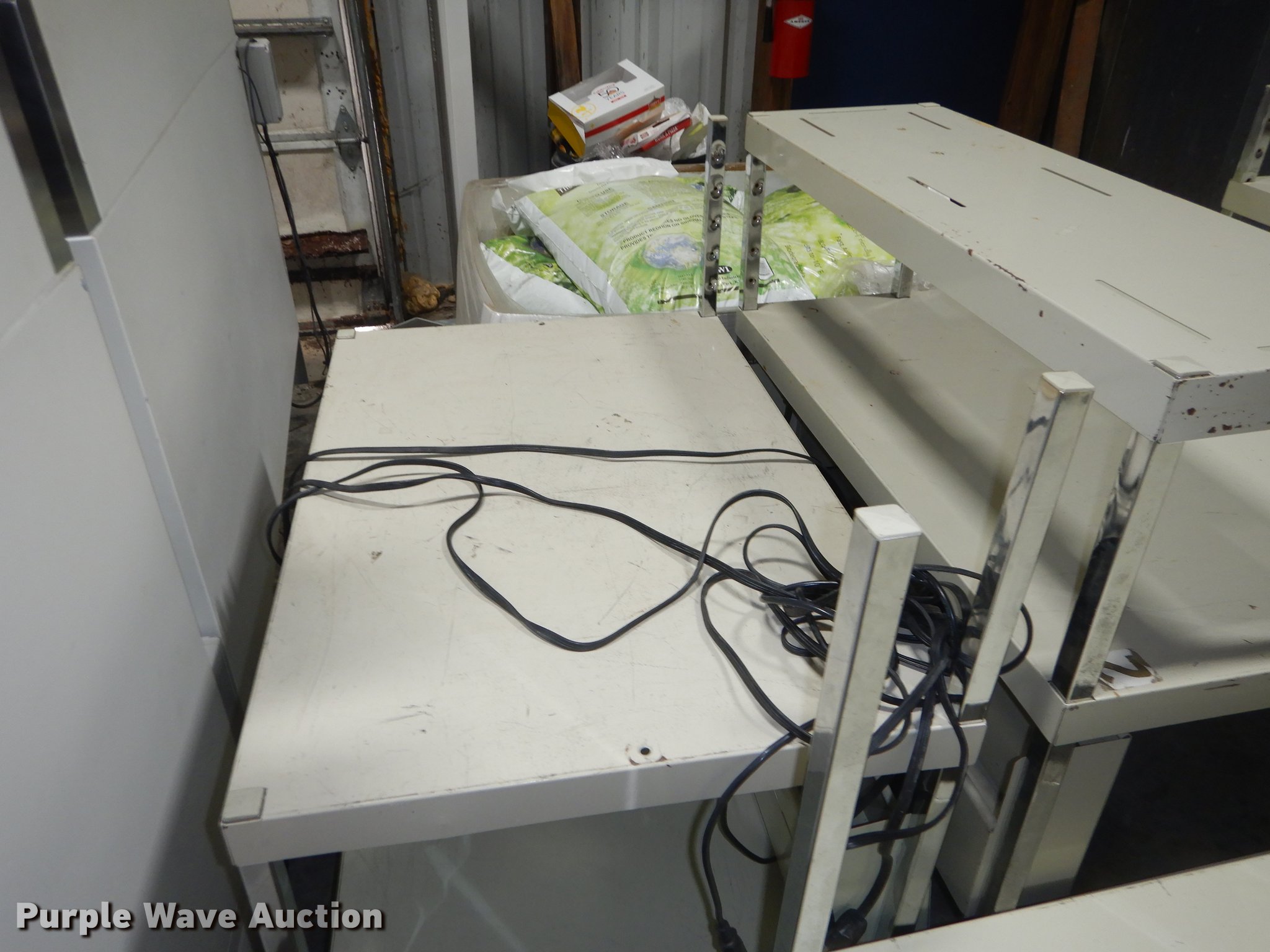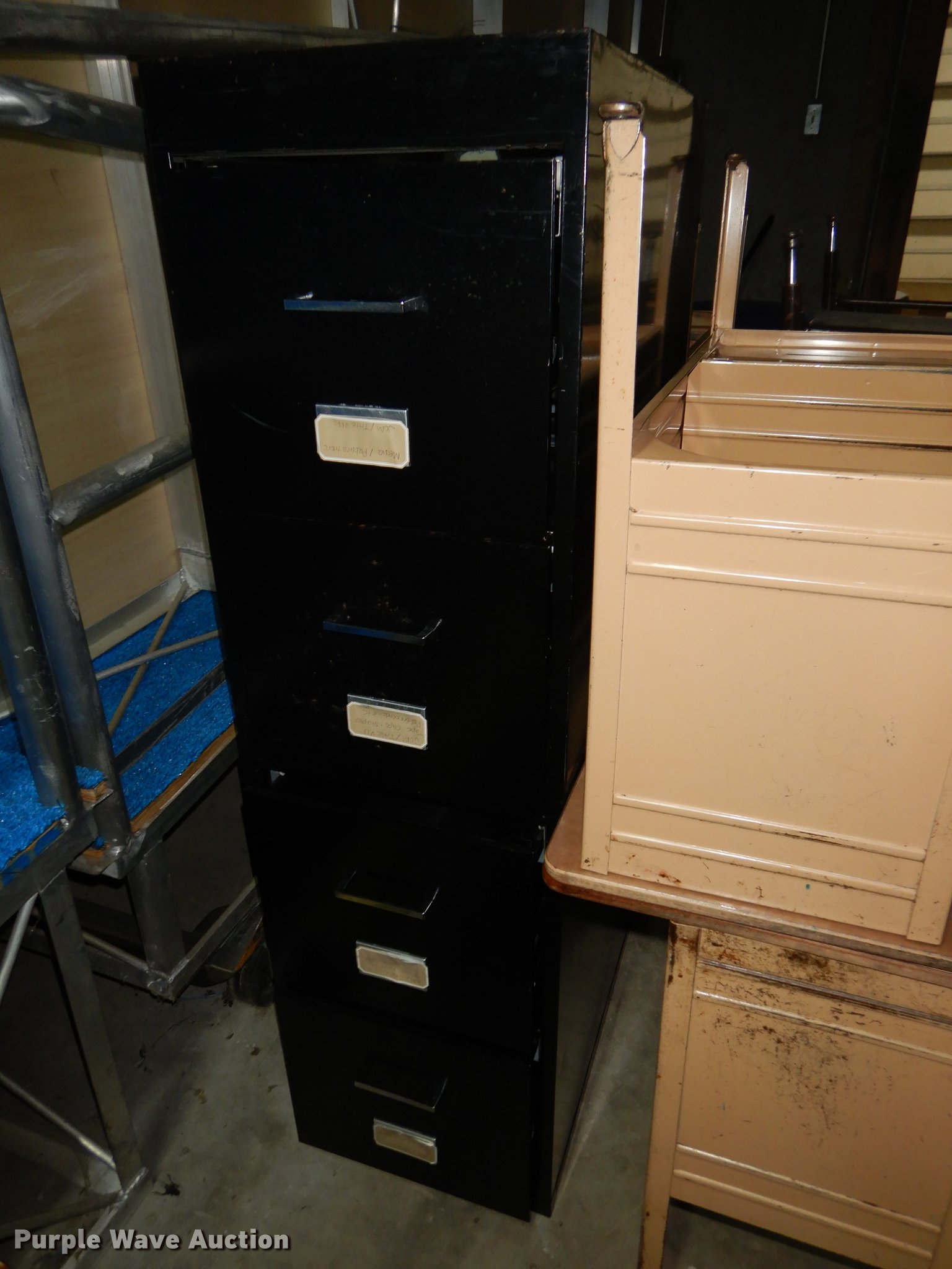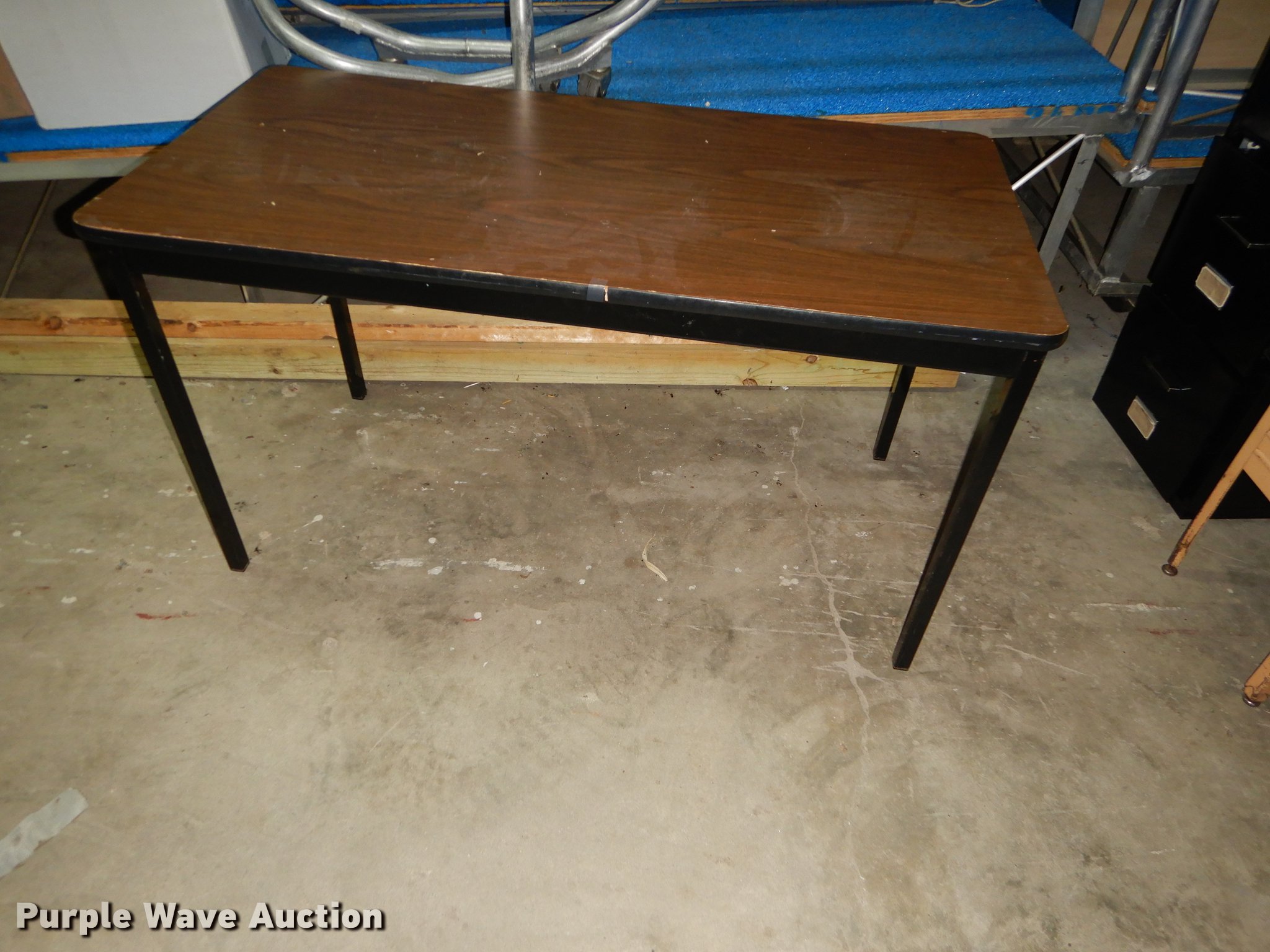 Purple Wave is selling a used Furniture in Kansas. This item is a Furniture with the following: (6) 3' x 2' metal carts, (7) television carts, (14) tables and desks, Filing cabinet, Door frame