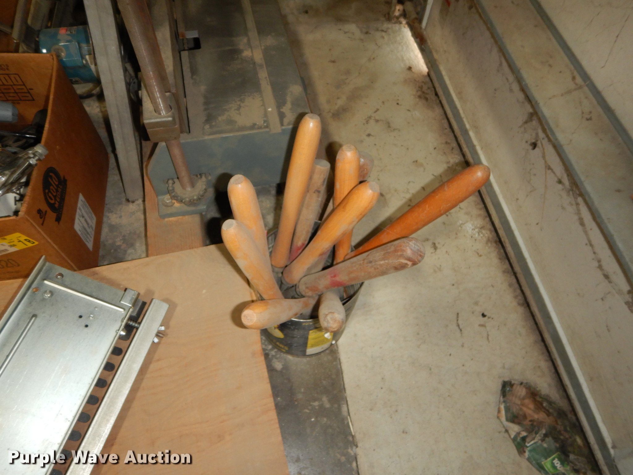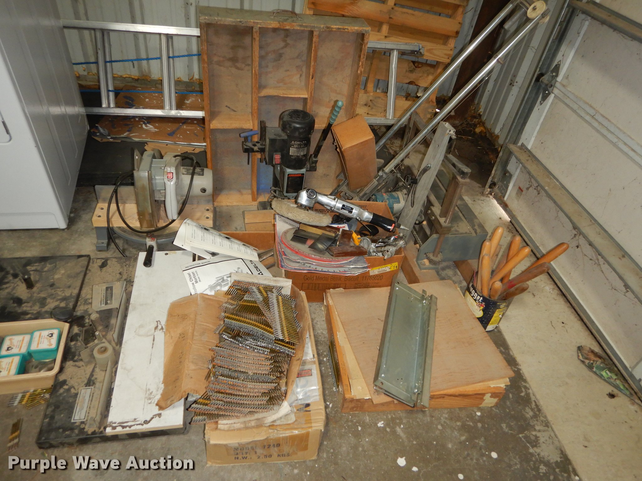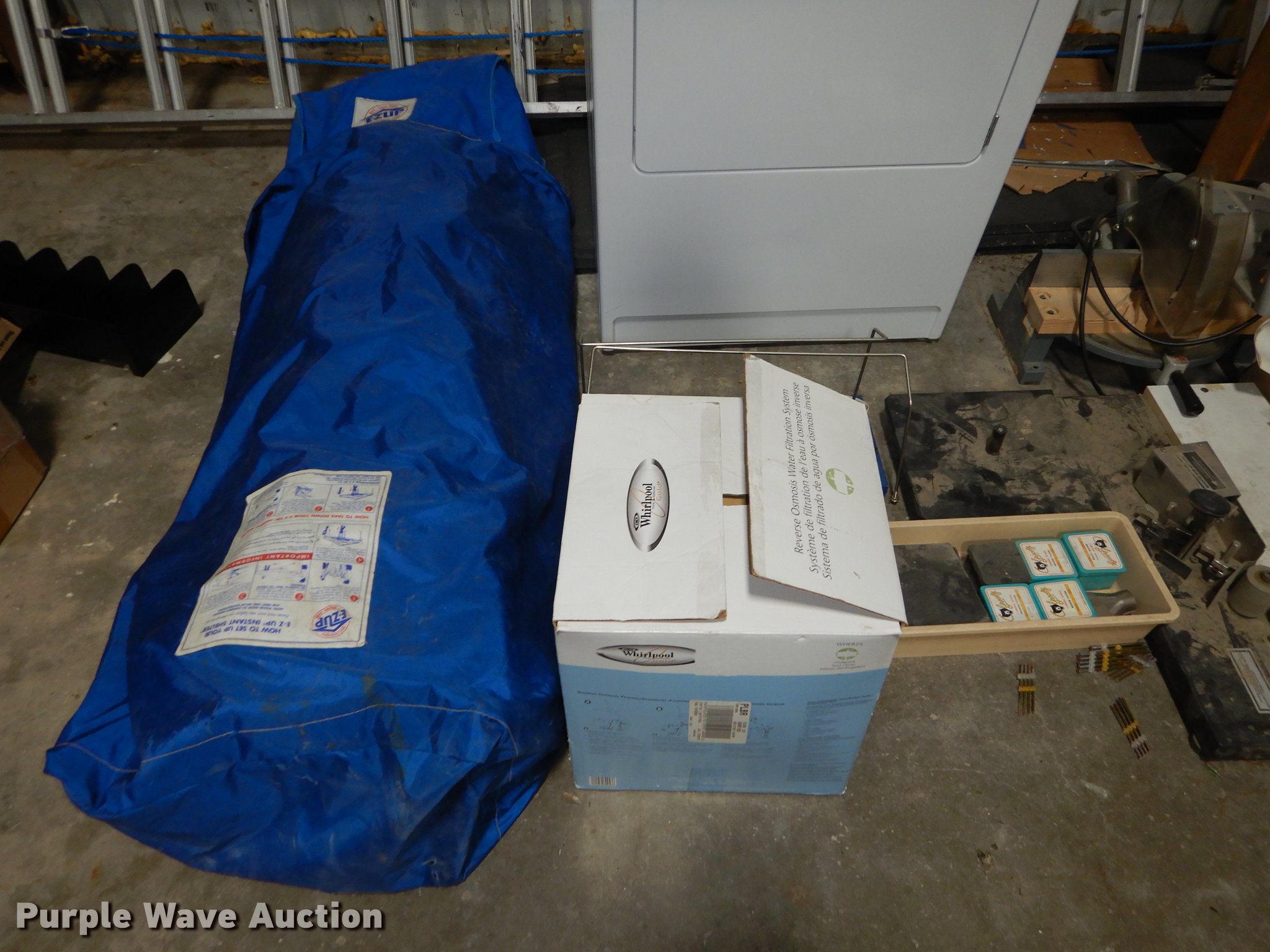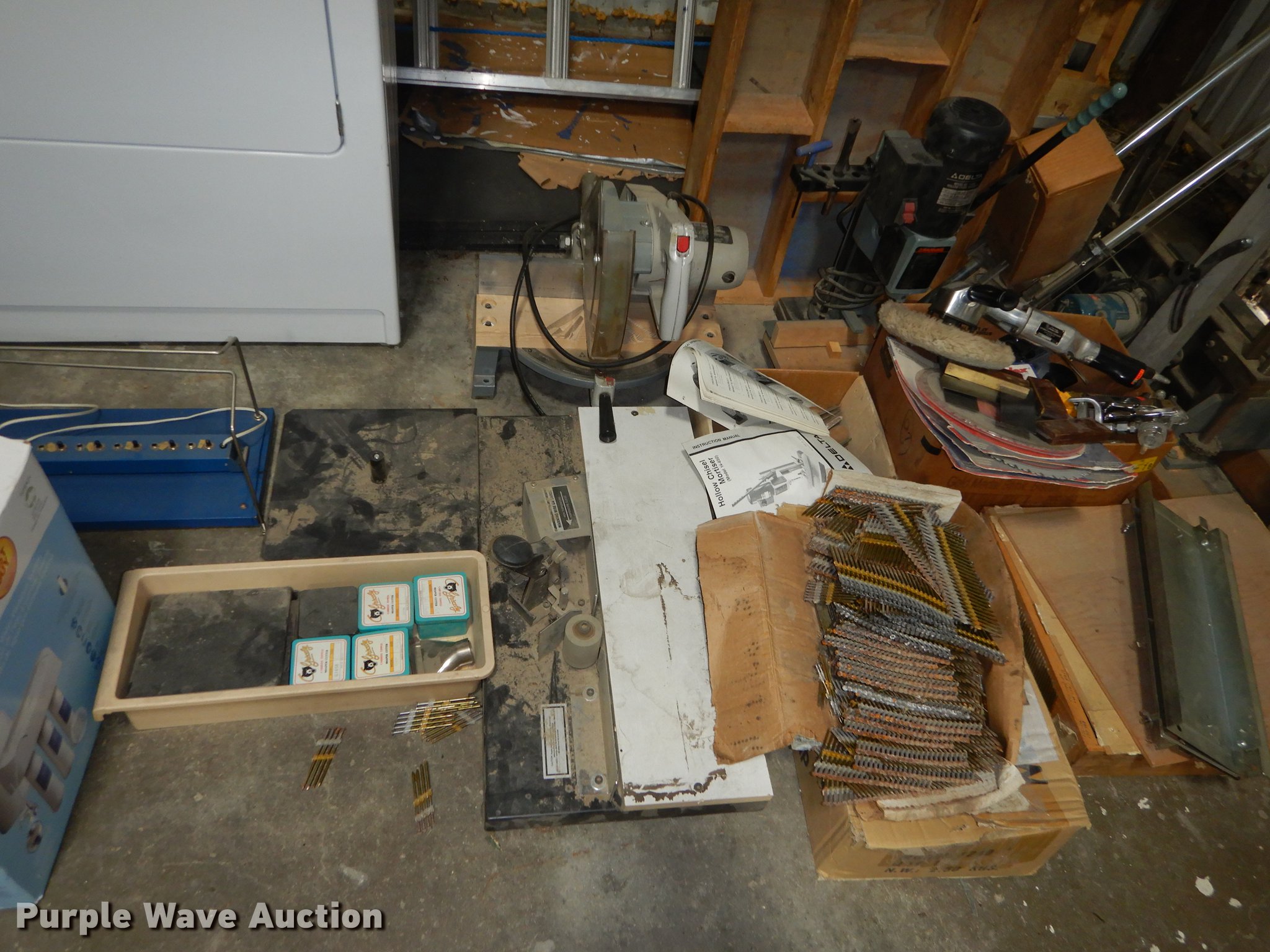 Purple Wave is selling a used Office Supplies and Equip. in Kansas. This item is a Office supplies and equipment with the following: Dryer, Canopy tent, Time clock, Miter saw, Chisel mortiser, Jointer, Water fountains, Power cords and more, Unknown operating conditions