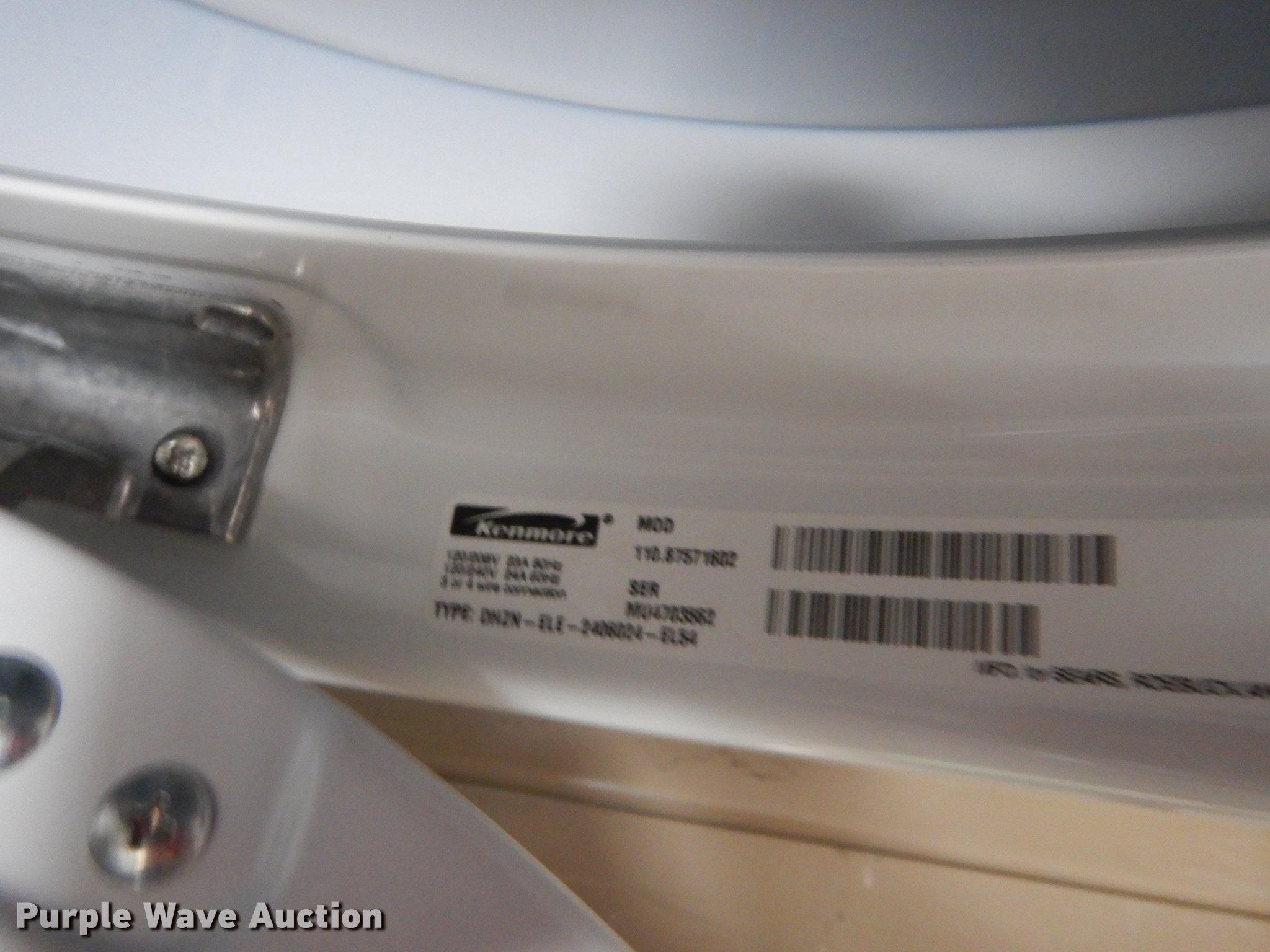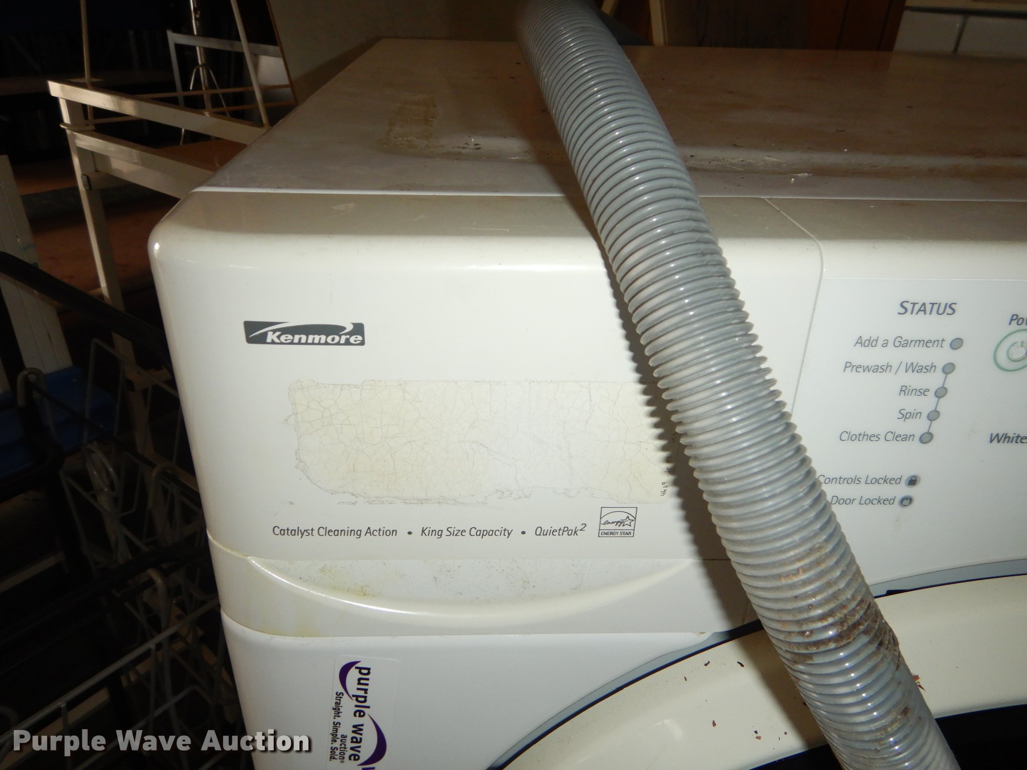 Purple Wave is selling a used Appliances in Kansas. This item is a Kenmore HE2 Plus washer and dryer with the following: Washer, Model 11047532602, Stainless steel barrel, Front window cracked on exterior only, Serial HLU4655647, Dryer, Model 11087871602, Serial M04703882