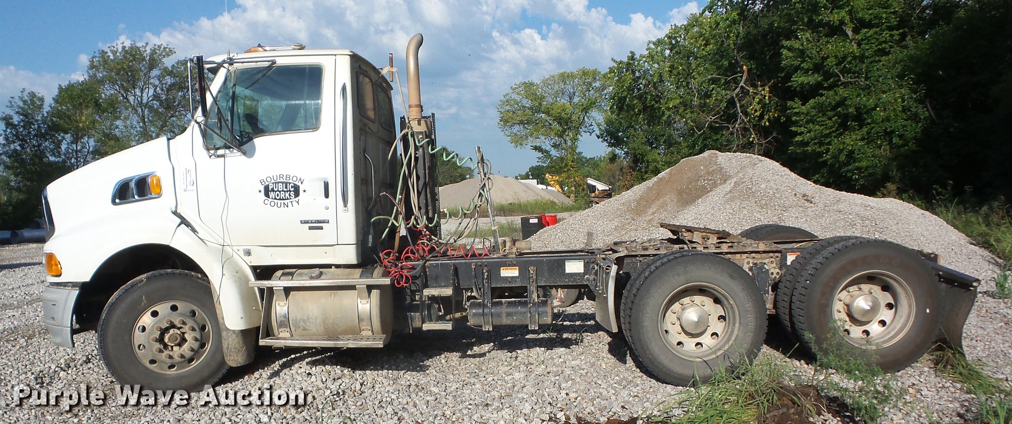 Purple Wave is selling a used Truck Tractor in Kansas. This item is a 2008 Sterling AT9500 semi truck with the following: 250,884 miles on odometer, 11,215 hours on meter, Mercedes-Benz MBE4000 12.0L L6 turbo diesel engine, Eaton Fuller 13 speed manual transmission, Tandem axle, Full differential lock, AC and heat, Tilt, Cruise, AM/FM, Power windows and locks, Air suspension seat, Air ride cab, Block heater, PTO, Wet kit, Dump valves, Single rear exhaust stack, Dual fuel tanks, Stainless steel quarter fenders, Air suspension, Air brakes, Engine brake, 11R22.5 tires, Non-operational vehicle, Non-operational engine