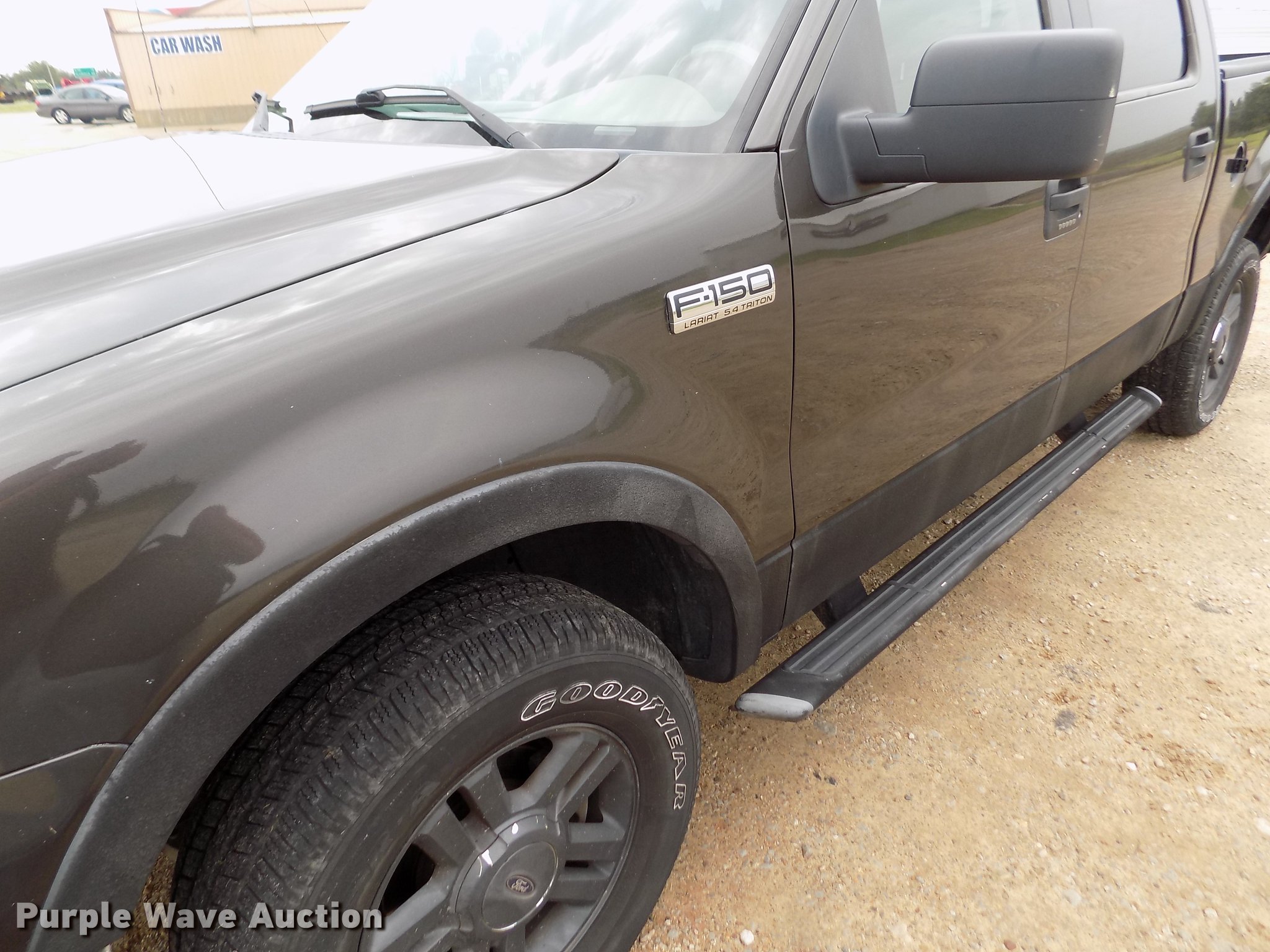 Purple Wave is selling a used 1/2 Ton Pickup or Van in Kansas. This item is a 2005 Ford F150 Lariat SuperCrew pickup truck with the following: 180,709 miles on odometer, 5.4L V6 SOHC 16V gas engine, Automatic transmission, Four wheel drive, AC and heat, Tilt, Cruise, AM/FM/CD, Power windows, locks, mirrors, and seats, Heated seats, Leather interior, Fog lights, Front tow hooks, Running boards, Bed liner, Receiver hitch, Trailer wiring, 275/65R18 tires, Possible transmission issues at higher speed, Check engine light on, Fuel cap door missing