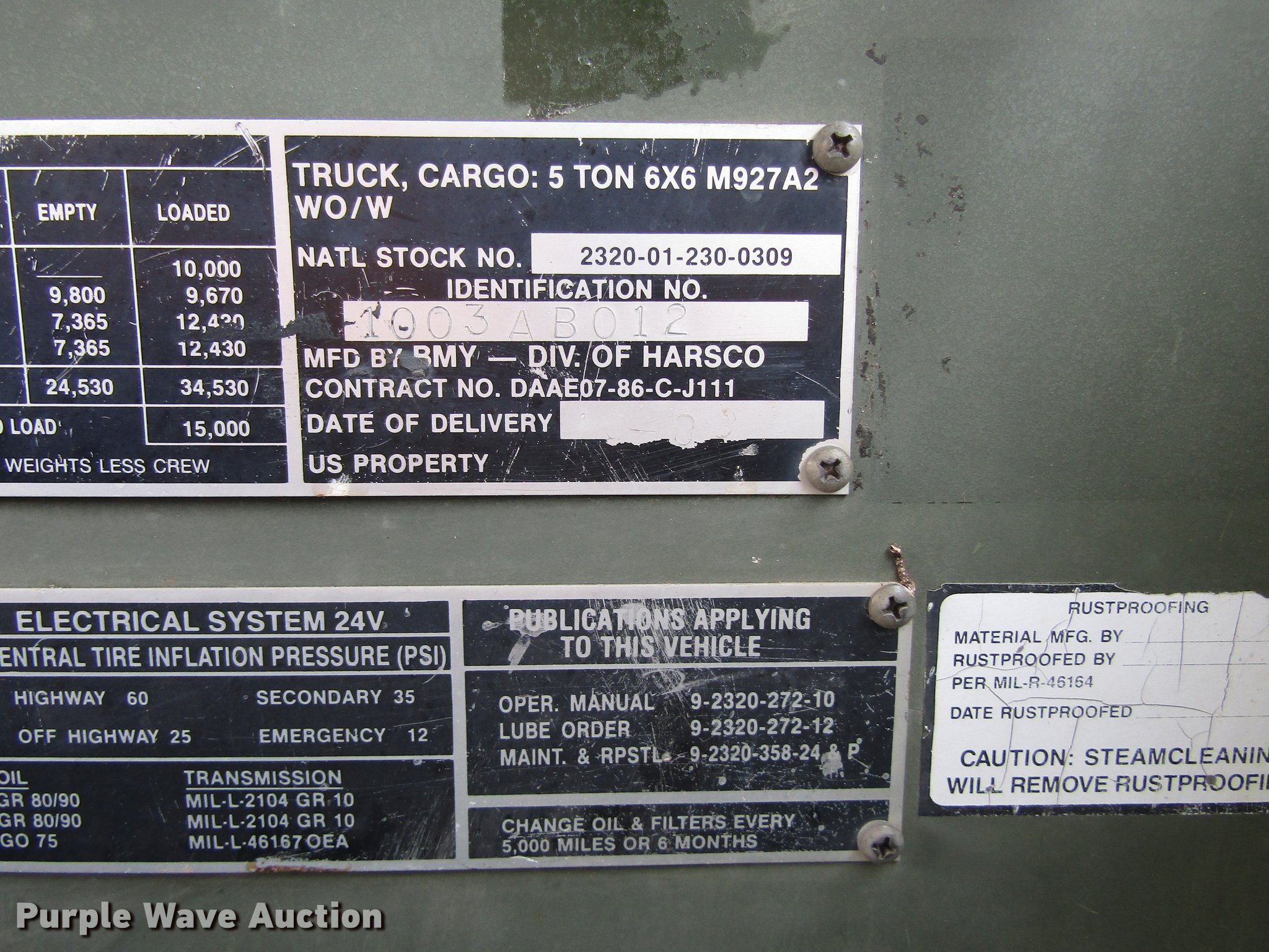 Purple Wave is selling a used Flat Bed Truck in Texas. This item is a 1989 BMY Harsco M972A2 flatbed truck with the following: 5,872 miles on odometer, 443 engine hours on meter, Cummins 6CTA 8.3L six cylinder turbo diesel engine, Serial 44516089, Allison automatic transmission, All wheel drive, Tandem axle, Heat, 20'L x 8'W flatbed, Spring suspension, Air brakes, 14.00R20XL tires