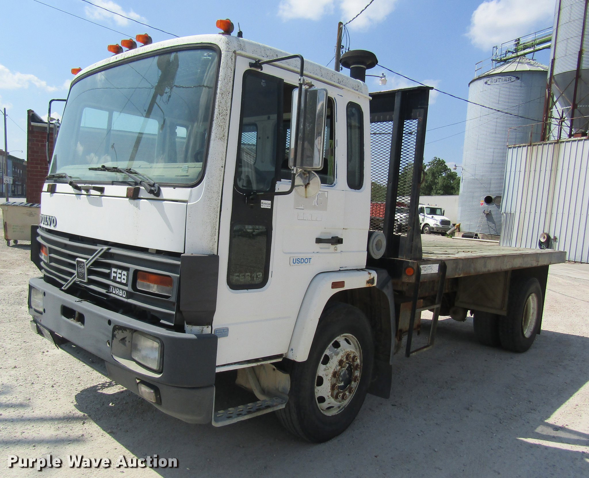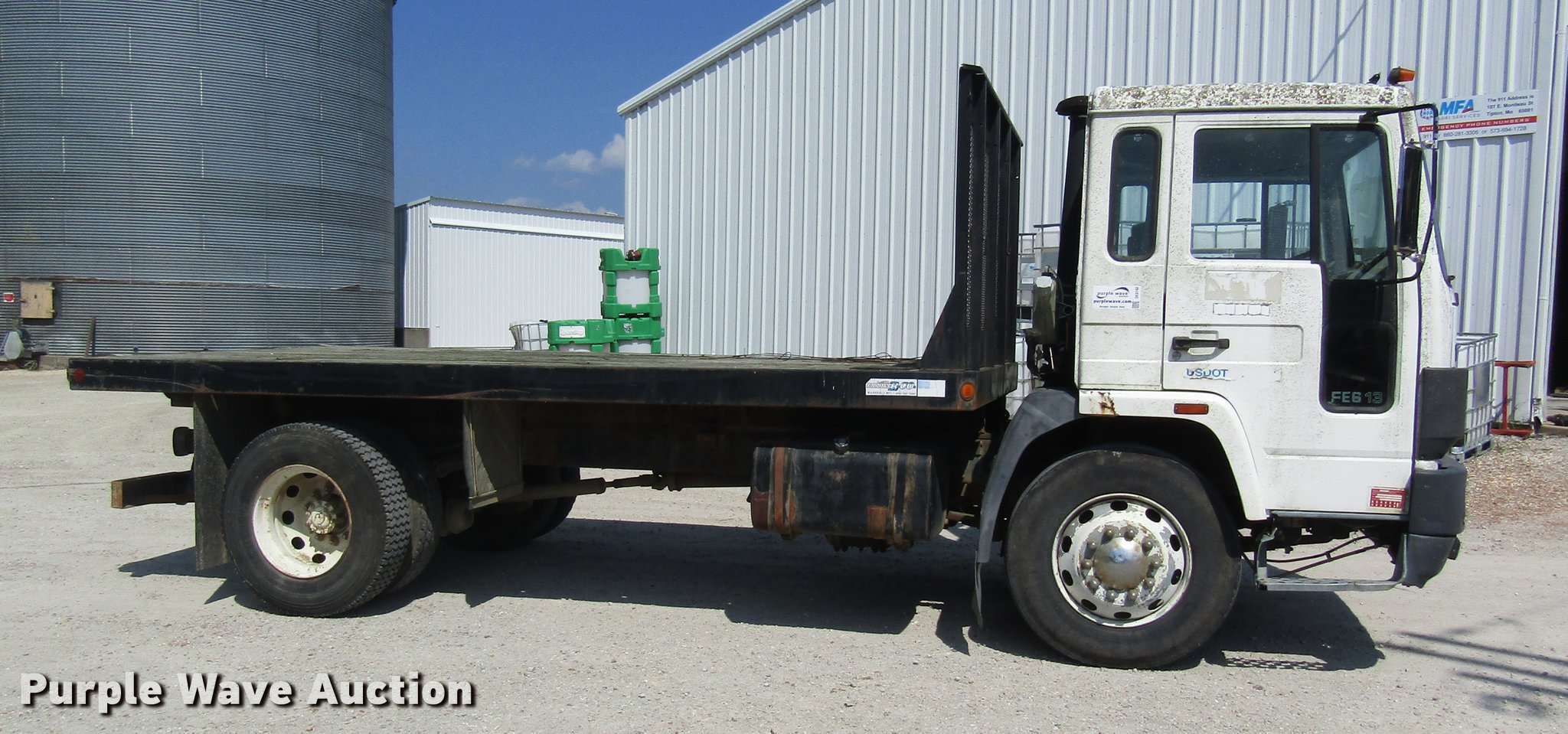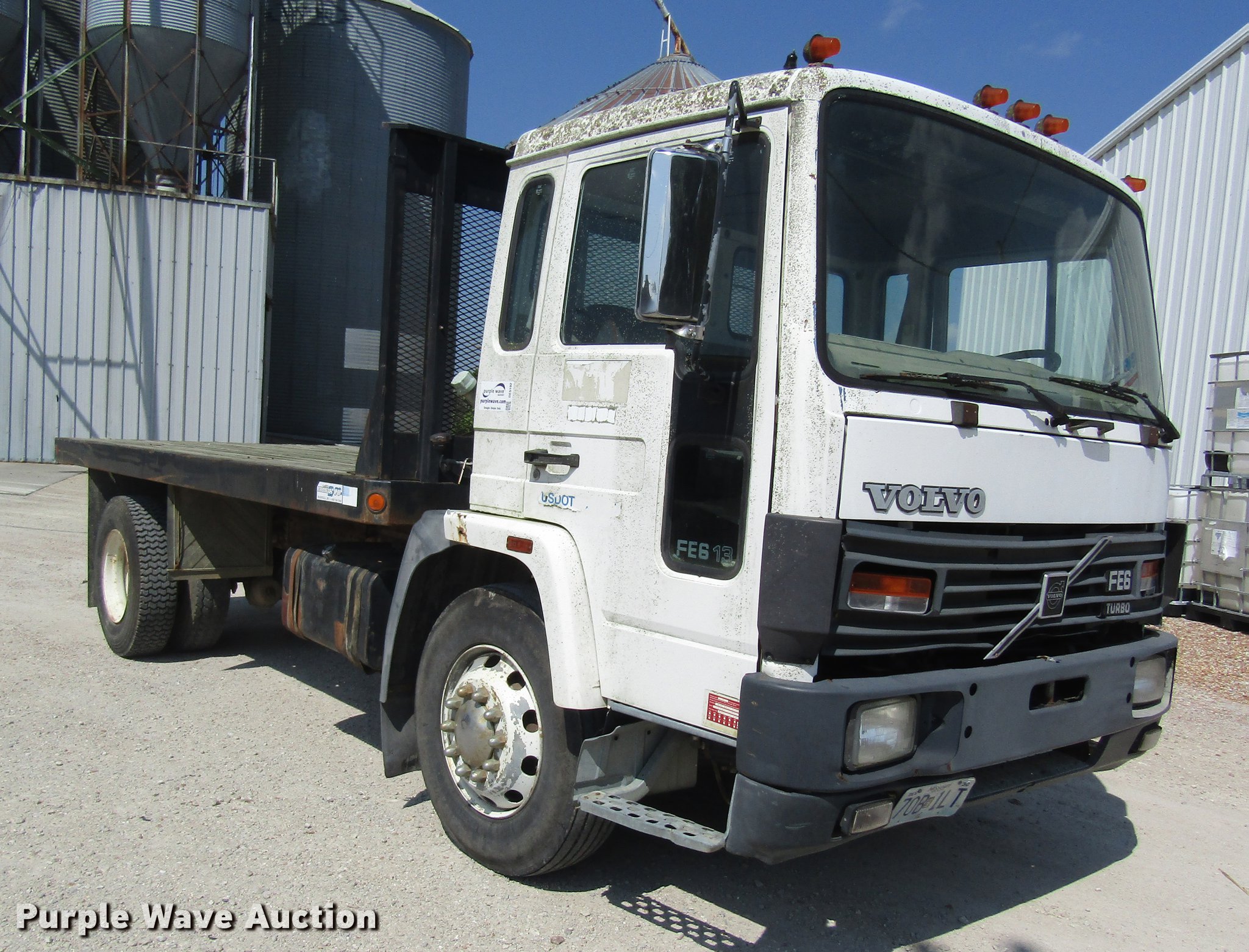 Purple Wave is selling a used Flat Bed Truck in Missouri. This item is a 1989 Volvo FE613 flatbed truck with the following: 34,738 miles on odometer, Six cylinder diesel engine, Five speed manual transmission, Single axle, Heat, AM/FM, Suspension seat, 16'L x 8'W flatbed, Wood deck, Stake pockets, Single fuel tank, Trailer wiring, Spring suspension, Air brakes, 275/80R22.5 tires, Flat tire