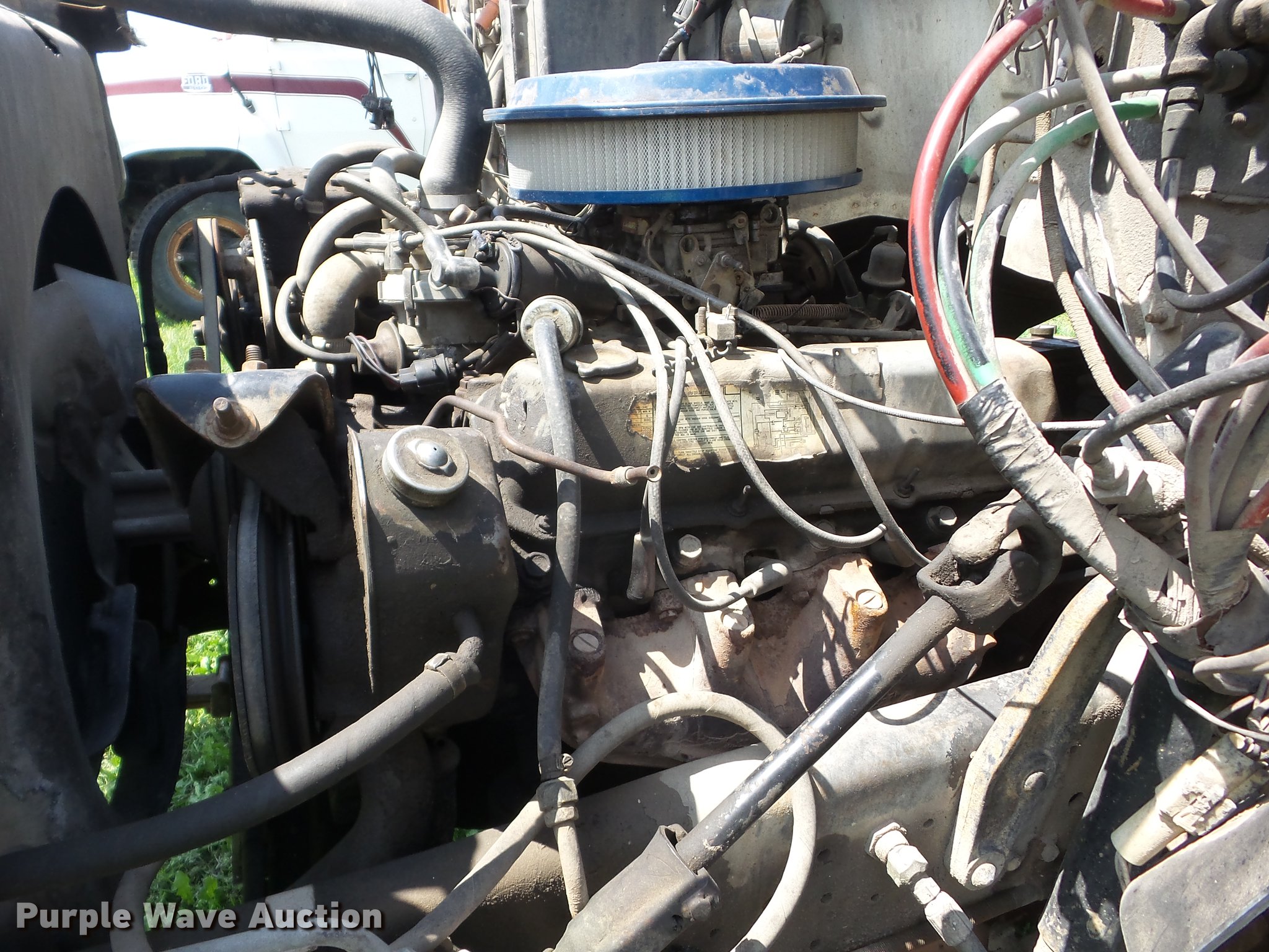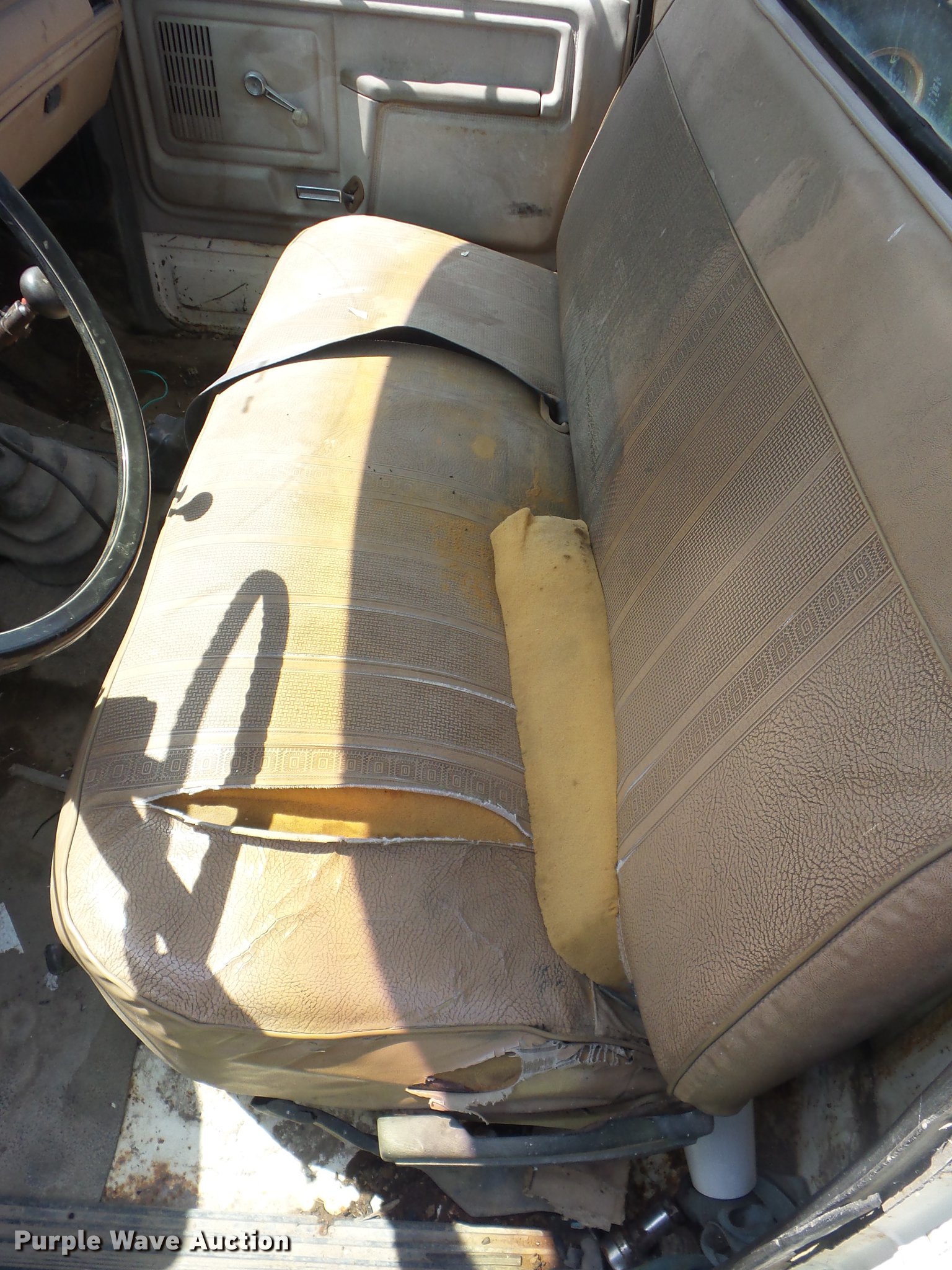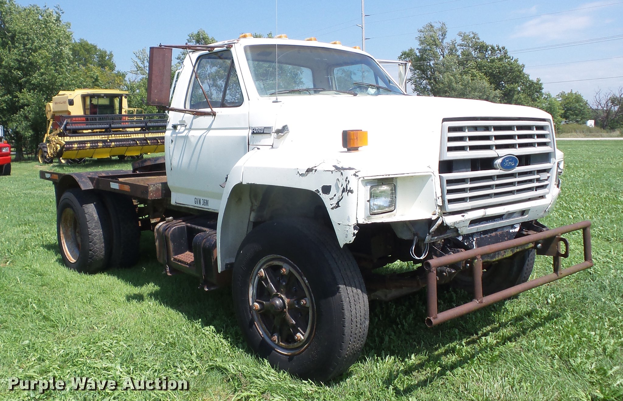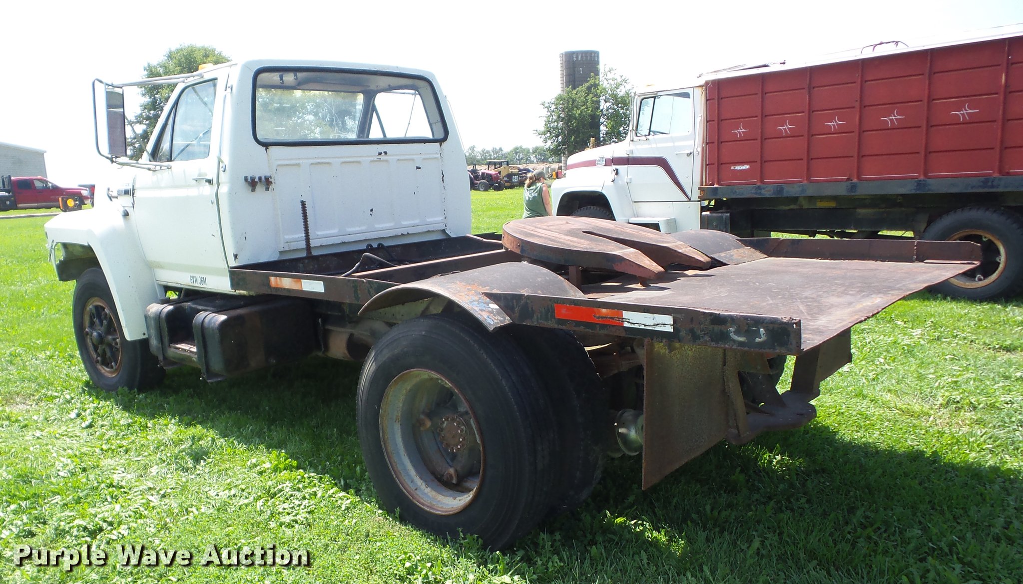 Purple Wave is selling a used Truck Chassis in Kansas. This item is a 1984 Ford F700 flatbed truck with the following: 119,879 miles on odometer, Ford 7.0L V8 gas engine, Five speed manual transmission, Two speed rear end, Single axle, Heat, Suspension seat, Dual fuel tanks, Fifth wheel plate, Spring suspension, Air brakes, 139" wheelbase, 9.00-20 front tires, 10R22.5 rear tires, GVWR 27,500 lbs