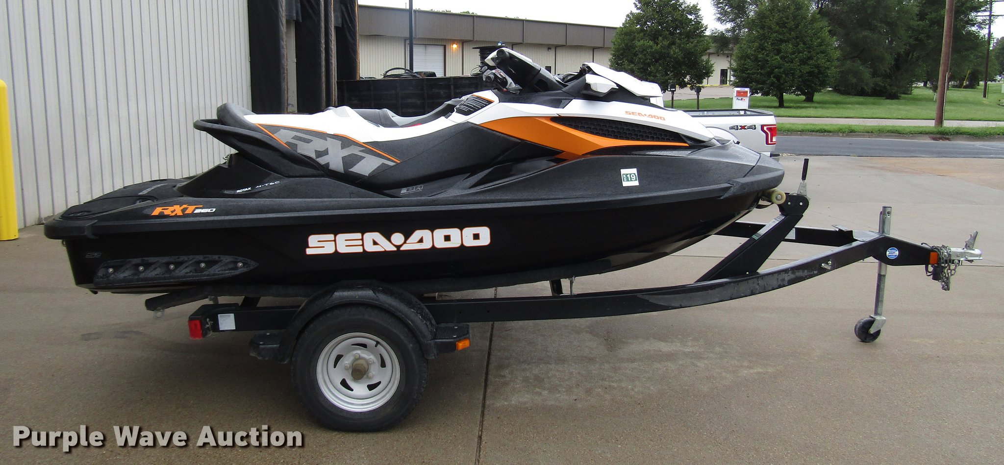 Purple Wave is selling a used Boat in Kansas. This item is a (2) jet skis with the following: 2014 SeaDoo RXP260, 47 hours on meter, Rotax 4tec 1,496cc liquid cooled four stroke supercharged gas engine, 260 HP, Reverse, Variable trim, 130.6"L x 48.3"W, Two passenger capacity, Hull I.D. CA-YDV38202B414, 2013 SeaDoo RXT26, 59 hours on meter, Rotax 4tec 1,496cc four stroke gas engine, 260 HP, Reverse, Three passenger capacity, 11.5'L x 48.2"W, Hull I.D. CA-YDV09517C313, 2005 Shoreland trailer, 171"L x 97"W, ST175/80R13 tires, GVWR 2,720 lbs