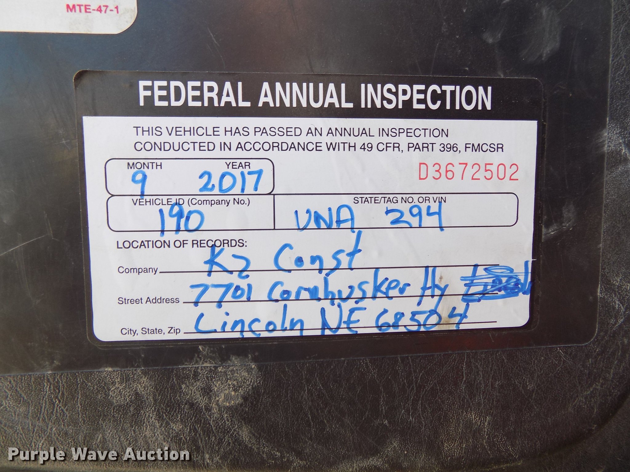1997 GMC T7500 street sweeper. 162,520 miles on odometer, 734 hours on meter, Caterpillar 3116 6.6L six cylinder turbo diesel engine, Automatic transmission, Single axle, Heat, Tilt, AM/FM, Suspension seat, Backup alarm, Ecco backup camera, Beacon light, Tymco hydrovac 7,241 hours on meter, John Deere 4045DF150R 4.5L four cylinder diesel engine, Steel tank, 89"W poly bristle center broom, 30"W gutter brooms, Single fuel tank, Spring suspension, Air brakes, 11R22.5 tires, GVWR 30,000 lbs, Annual inspection valid through September 2018, Unit# 190. Nebraska title. 1GDM7C1J7VJ518237. K2 Construction. 7701 Cornhusker Hwy. Lincoln, NE 68507