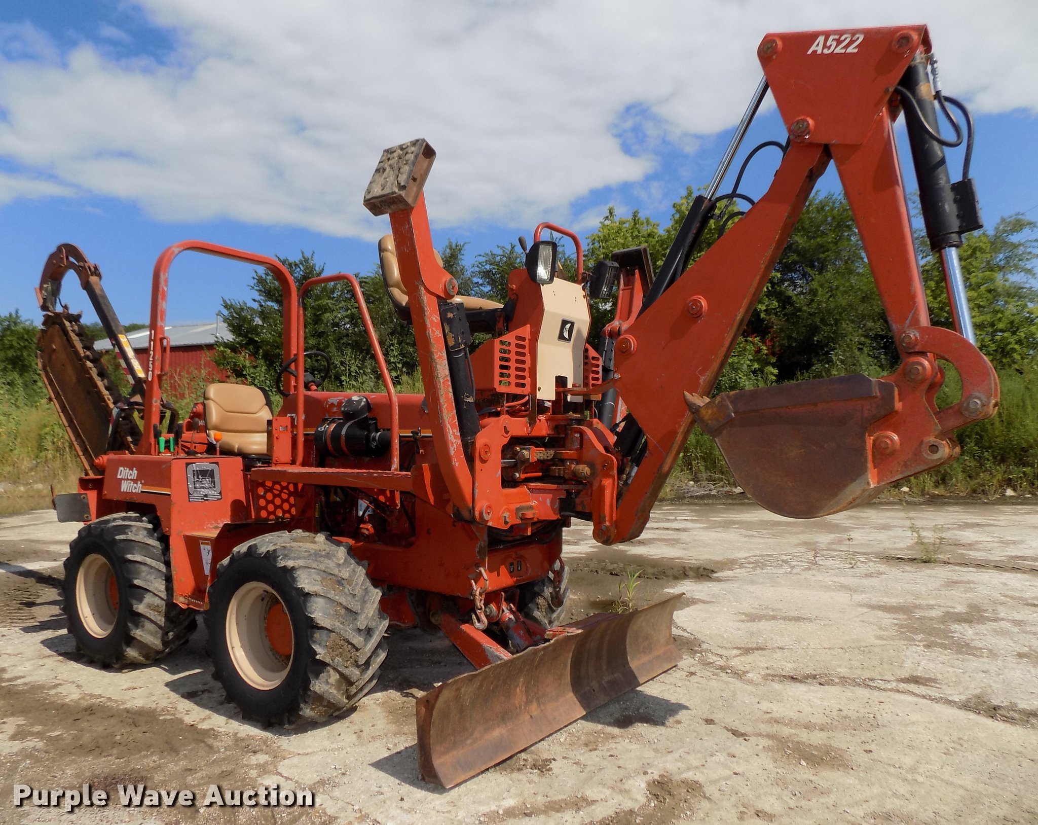 Purple Wave is selling a used Trencher or Rock Saw in Nebraska. This item is a 2000 Ditch Witch 5700 trencher with the following: 2,051 hours on meter, Deutz four cylinder diesel engine, Hydrostatic transmission, Four wheel drive, Front wheel steer, Rear wheel steer, Crab steer, Four wheel steer, Roll bar, Personal restraint bar, Front work lights, Model H412 trencher, 60" digging depth, 6" cutting width, Hydraulic crumber shoe, Backhoe model A522, 48" stick length, 18"W five tooth bucket, Stick controls, 72"W six-way backfill blade, Goodyear 31 x 15.50-15 tires, Contents not included, Serial 3T1409, Unit# 11250