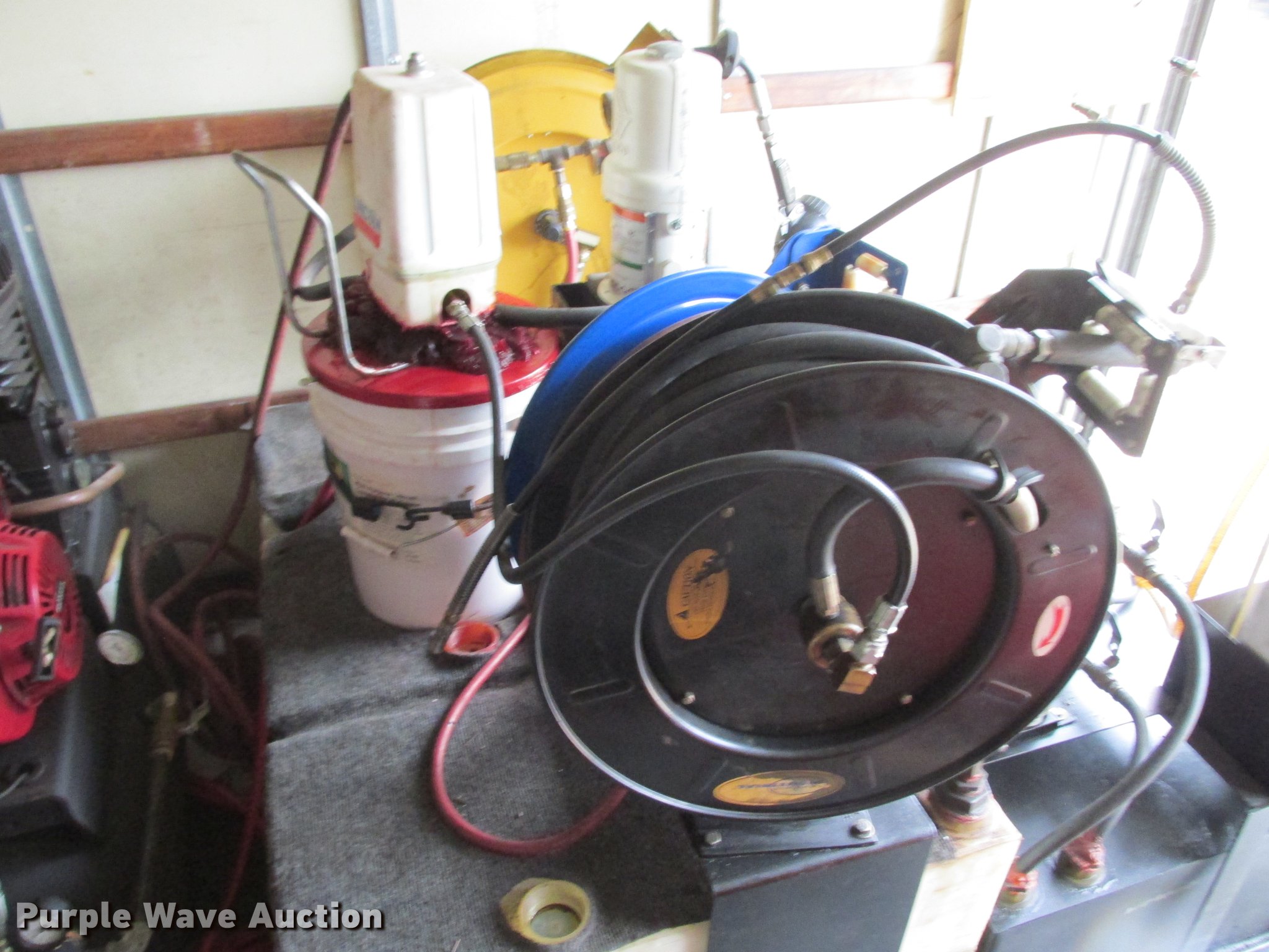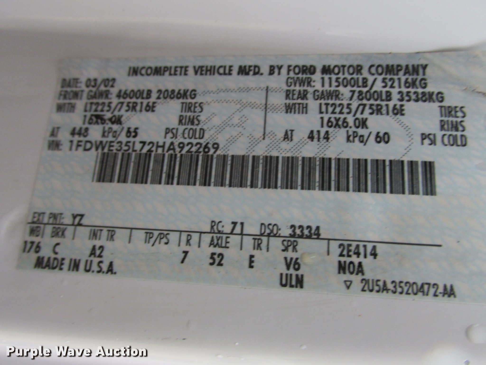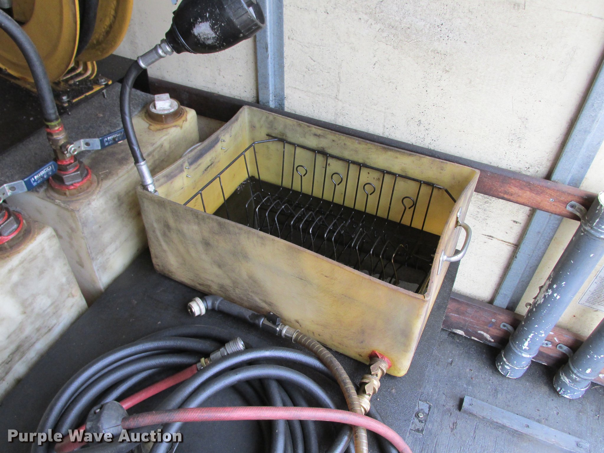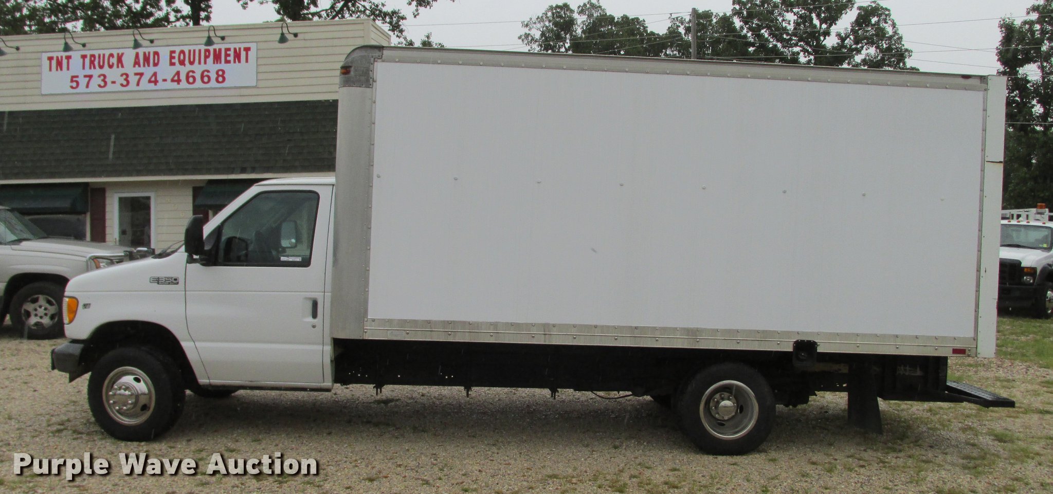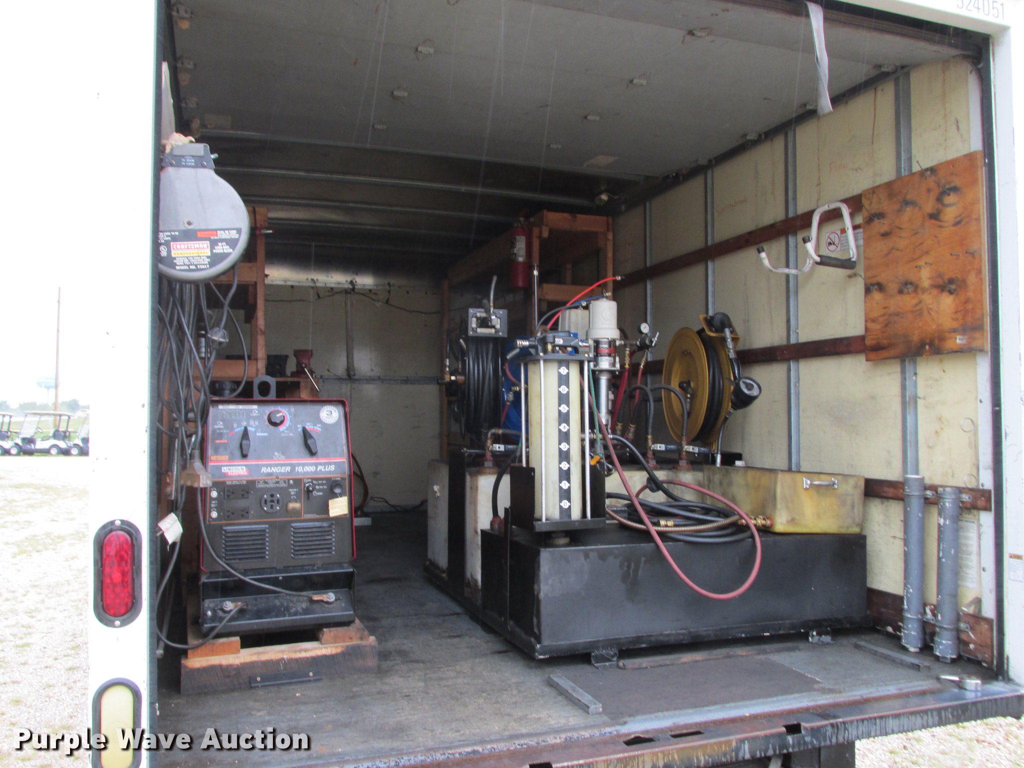 Purple Wave is selling a used Box Truck in Missouri. This item is a 2002 Ford Econoline E350 Super Duty service and lube box truck with the following: 151,588 miles on odometer, 5.4L V8 SOHC 16V gas engine, Automatic transmission, AC and heat, AM/FM, 16'L x 8'W bed, Shelving, Work benches, Compartment lights, Enclosed body, Work lights, Mounted vise, Fire extinguisher, Aluminum ramp, Lincoln Ranger 10,000 Plus AC/DC welder/generator, 30 hours on meter, Kohler 24 HP gas engine, 240 outlet, (4) 120V outlets, Leads, Honda air compressor, 13 HP engine, 150 psi, 40 gallon tank, Electric start, Battery included, Fireball oil/lube system, Hose reels, Nozzles, Pump, Hydraulic fluid reservoir, Grease reservoir, Motor oil reservoir, Used oil reservoir, Anti-freeze reservoir, Single fuel tank, Spring suspension, Hydraulic brakes, 225/75R16 tires