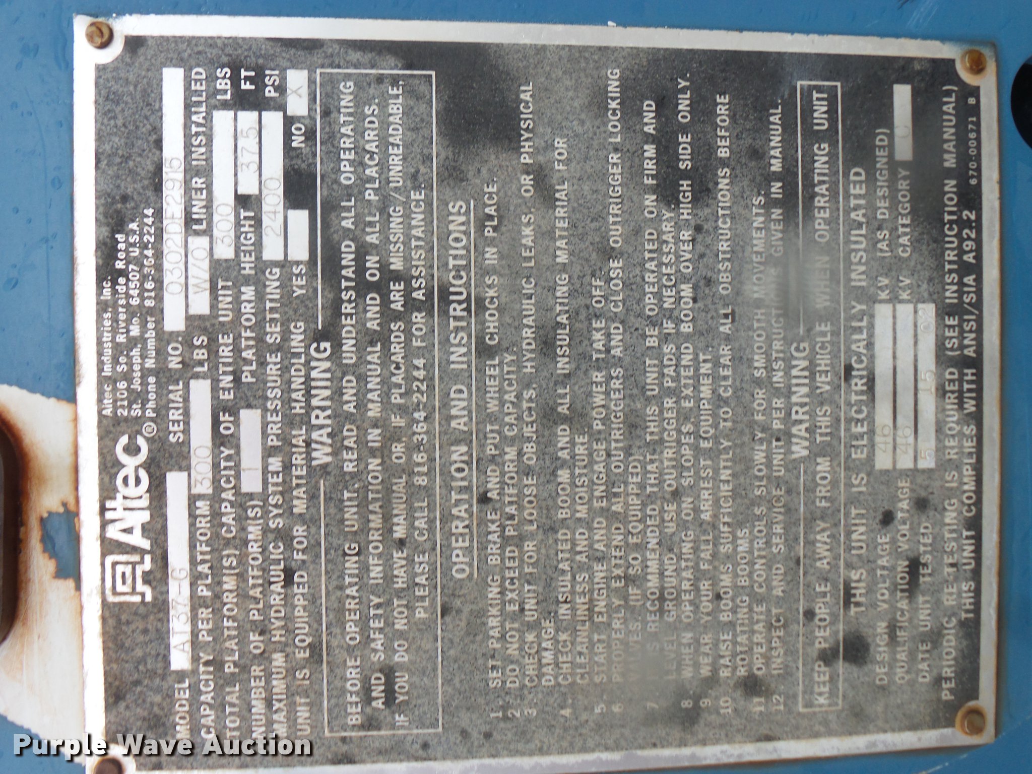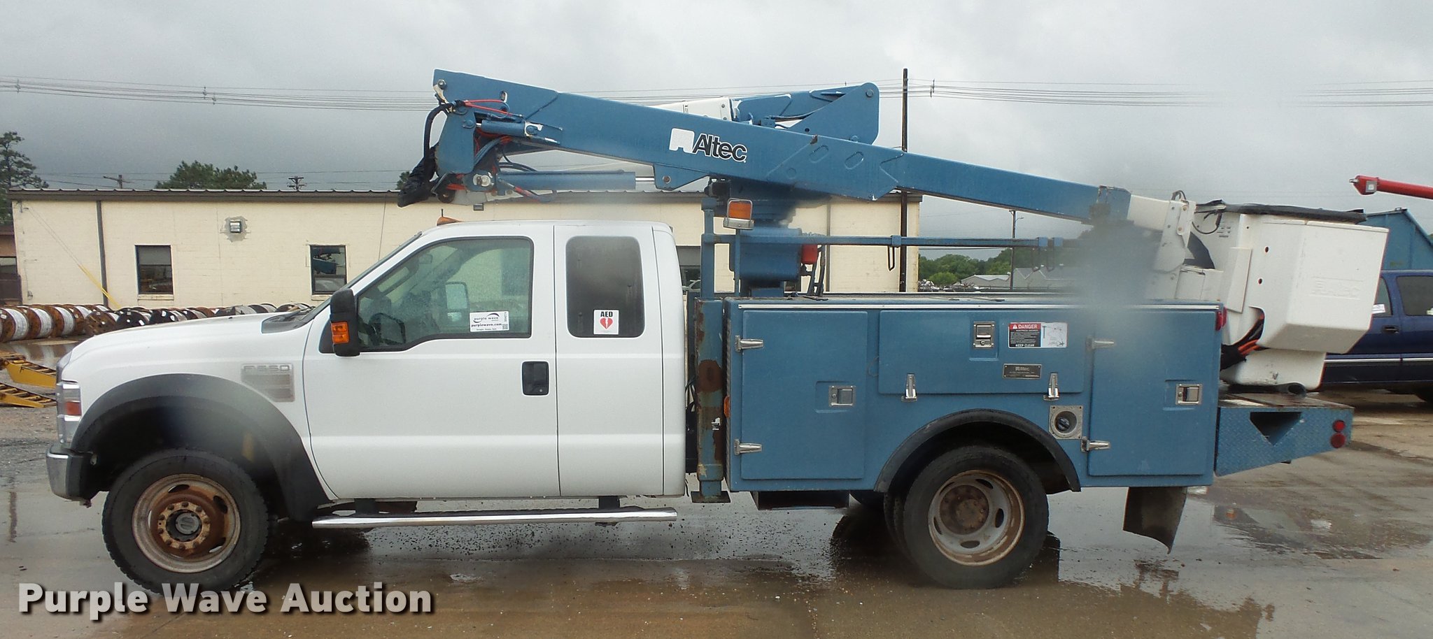Purple Wave is selling a used Bucket Truck in Nebraska. This item is a 2009 Ford F550 Super Duty bucket truck with the following: 147,472 miles on odometer, 6.4L V8 OHV 32V turbo diesel engine, Automatic transmission, Four wheel drive, Single axle, AC and heat, AM/FM, Power windows, locks, and mirrors, Heated mirrors, Trailer brake controller, Wet kit, Beacon light, Front tow hooks, Altec utility bed, 11'L, Shelving, Catwalk, Altec boom, 300 lbs maximum lift capacity, 37.5 maximum lift height, Man basket, Platform and ground controls, Boom rotation, Articulating boom, Outriggers, Serial 0302DE2915, Single fuel tank, Receiver hitch, Trailer wiring, 162" wheelbase, Spring suspension, Hydraulic brakes, 225/70R19.5 tires, Metal in fuel lines