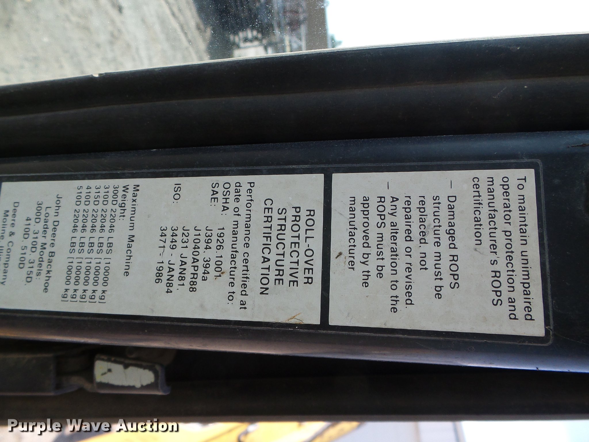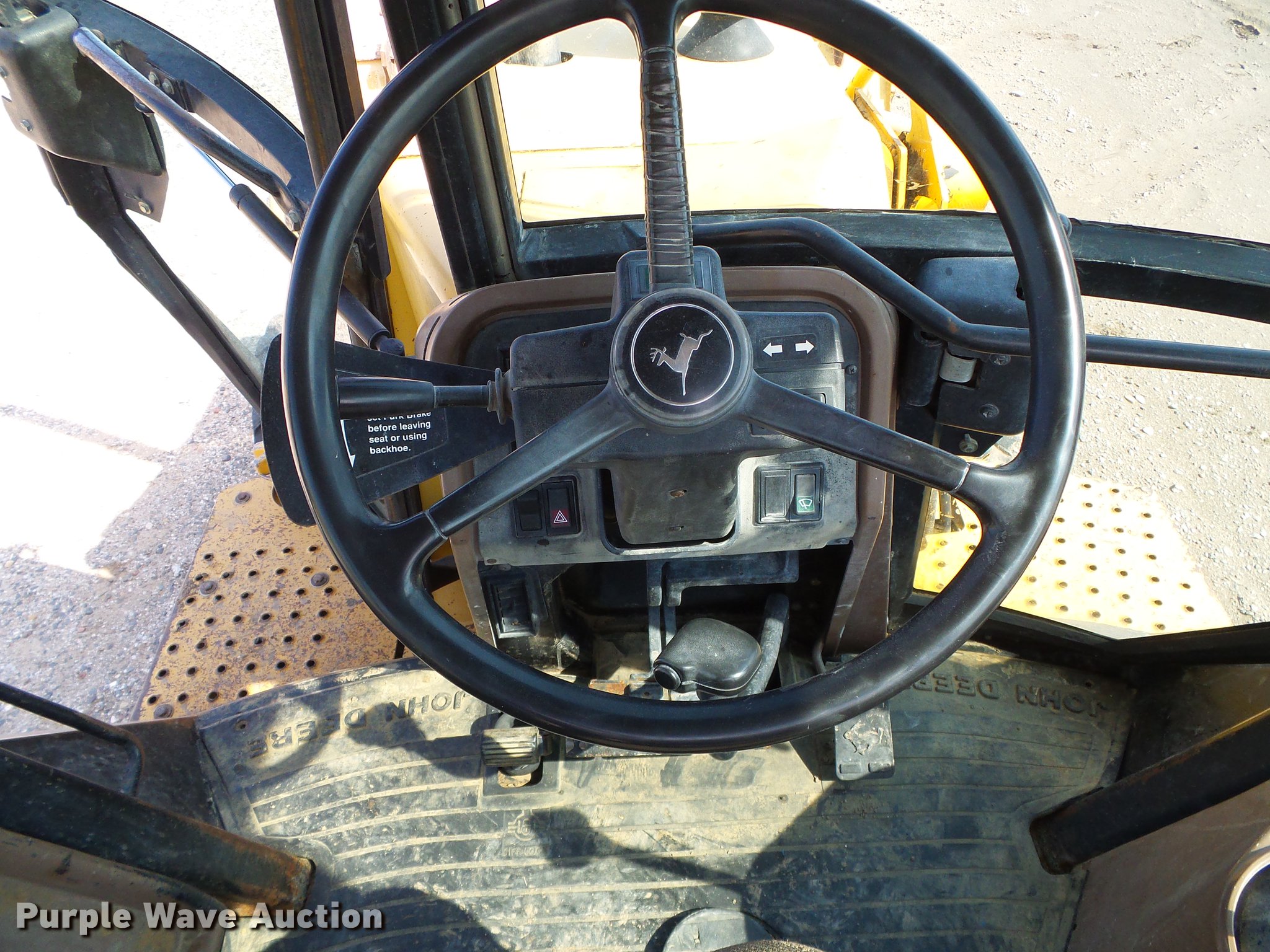 Purple Wave is selling a used Tractor Loader Backhoe in Kansas. This item is a 1996 John Deere 310D backhoe with the following: 1,337 hours on meter, Estimated 11,337 hours, John Deere four cylinder turbo diesel engine, Shuttle shift transmission, 4F-4R, Four wheel drive, EROPS, AC and heat, Suspension seat, Wobble stick backhoe controls, Wipers, Front and rear work lights, John Deere AT166494 86"W loader bucket, One cu. yd. capacity, Bolt-on cutting edge, Extendable stick, 24"W backhoe bucket, Weld-on cutting edge, (5) teeth, Front counter weights, 12-16.5 front tires, 19.5L-24 rear tires, Rear glass broken, Serial T0310DG808100