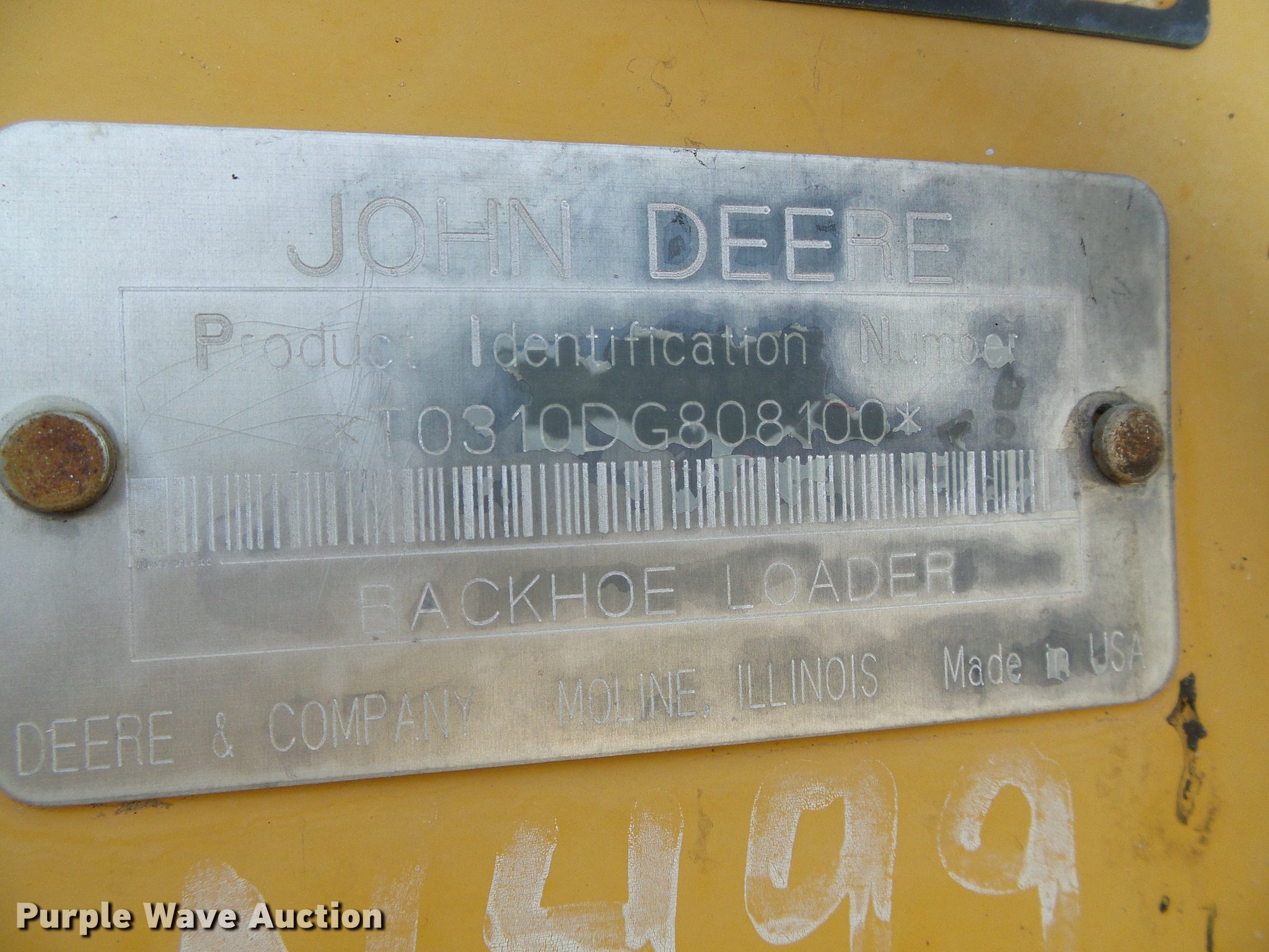 1996 John Deere 310D backhoe. 1,337 hours on meter Estimated 11,337 hours, John Deere four cylinder turbo diesel engine, Shuttle shift transmission 4F-4R, Four wheel drive, EROPS, AC and heat, Suspension seat, Wobble stick backhoe controls, Wipers, Front and rear work lights, John Deere AT166494 86"W loader bucket One cu. yd. capacity, Bolt-on cutting edge, Extendable stick, 24"W backhoe bucket Weld-on cutting edge, (5) teeth, Front counter weights, 12-16.5 front tires, 19.5L-24 rear tires, Rear glass broken, Serial T0310DG808100. Teeter Irrigation. 2729 W. Oklahoma Ave. Ulysses, KS 67880