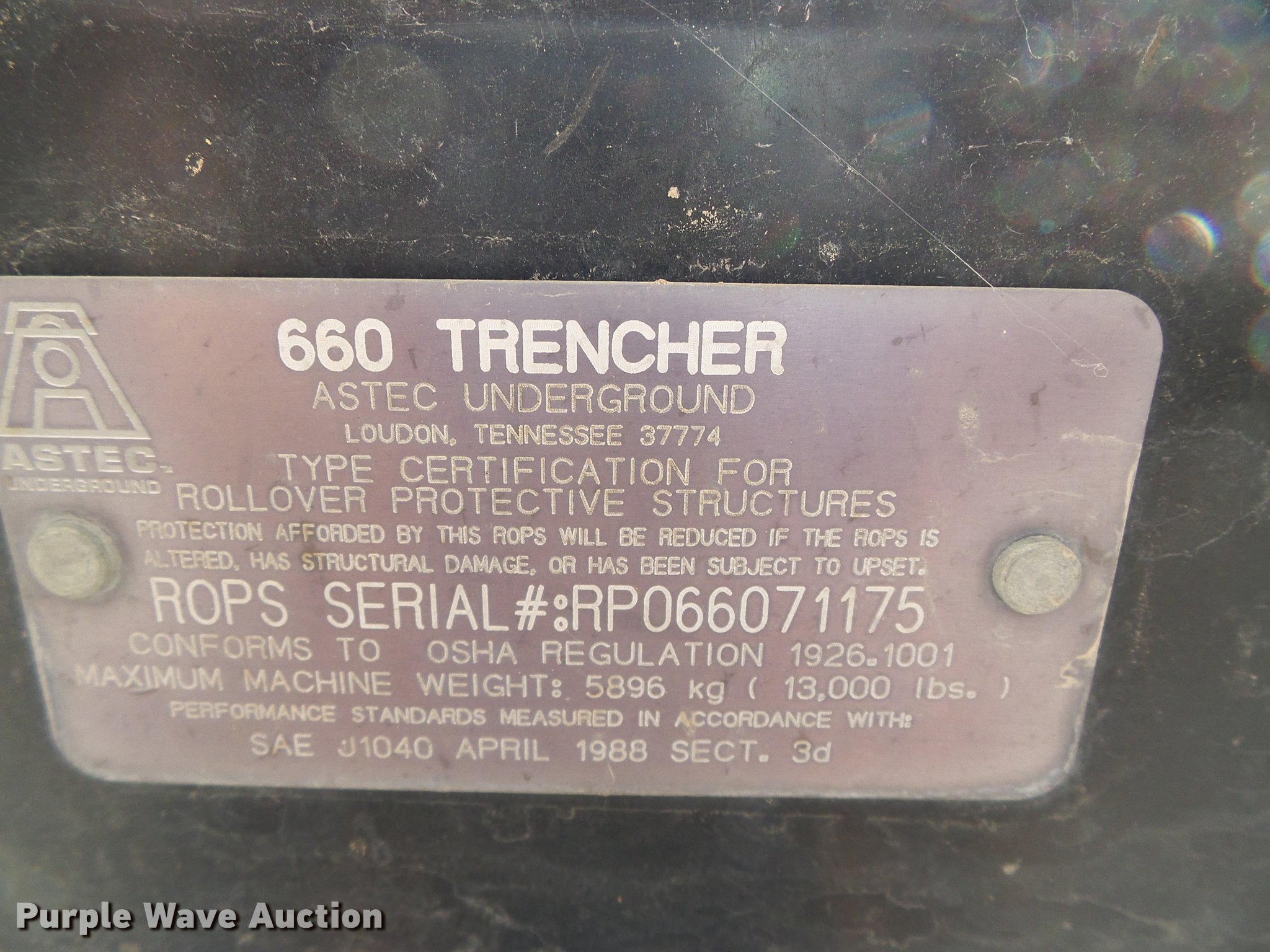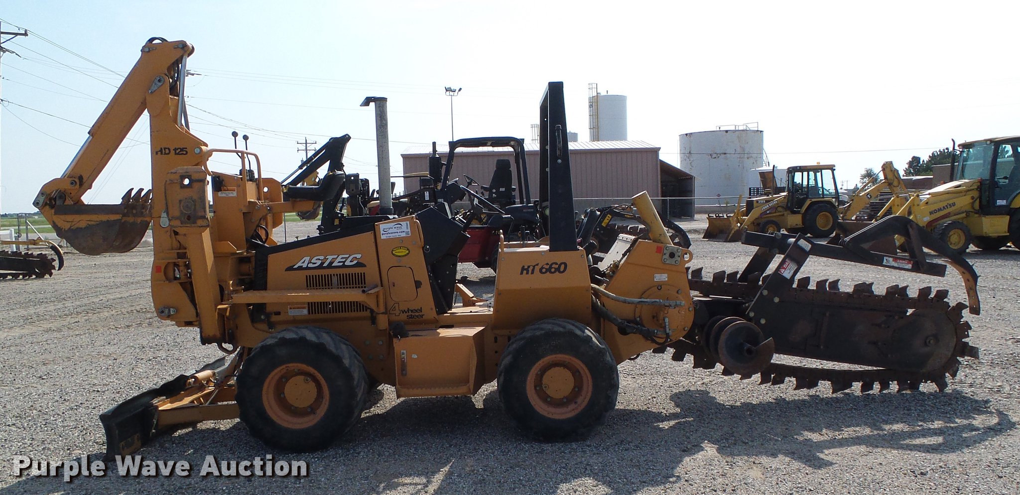 Purple Wave is selling a used Trencher or Rock Saw in Kansas. This item is a 2002 Astec RT660 trencher with the following: 1,722 hours on meter, Cummins B3.9 3.9L four cylinder diesel engine, Serial 30203655, Hydrostatic transmission, Four wheel drive, Four wheel steer, OROPS, Rotating suspension seat, Trencher model RT660, 72" boom length, 6" cutting width, 20" end idler diameter, Dirt teeth, Crumber bridge, Manual crumber arch, 5" crumber shoe width, Serial TRHD6X70738, Backhoe model HD125, 17"W four tooth bucket, Remote controls, Outriggers, Serial BHD12579718, 72"W six-way backfill blade, 31 x 15.5-15 tires, Serial RT660X64259
