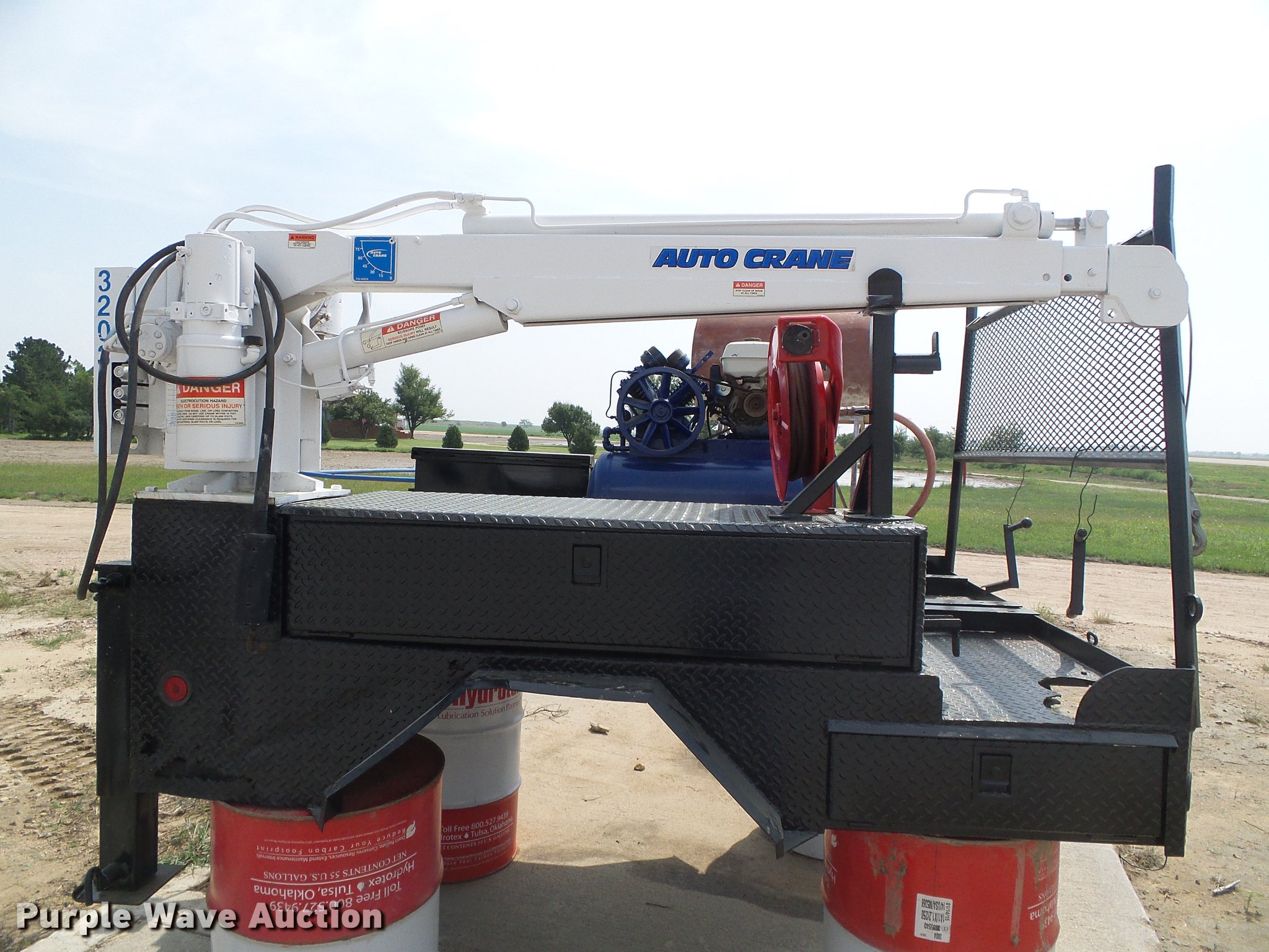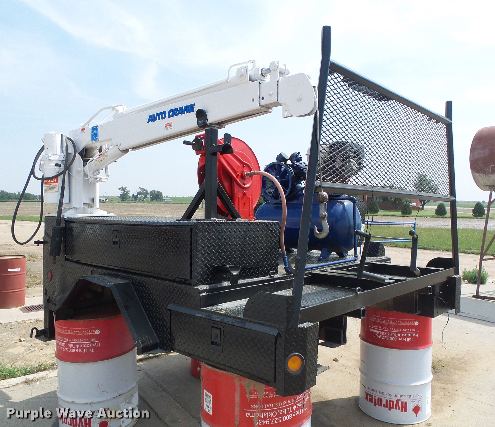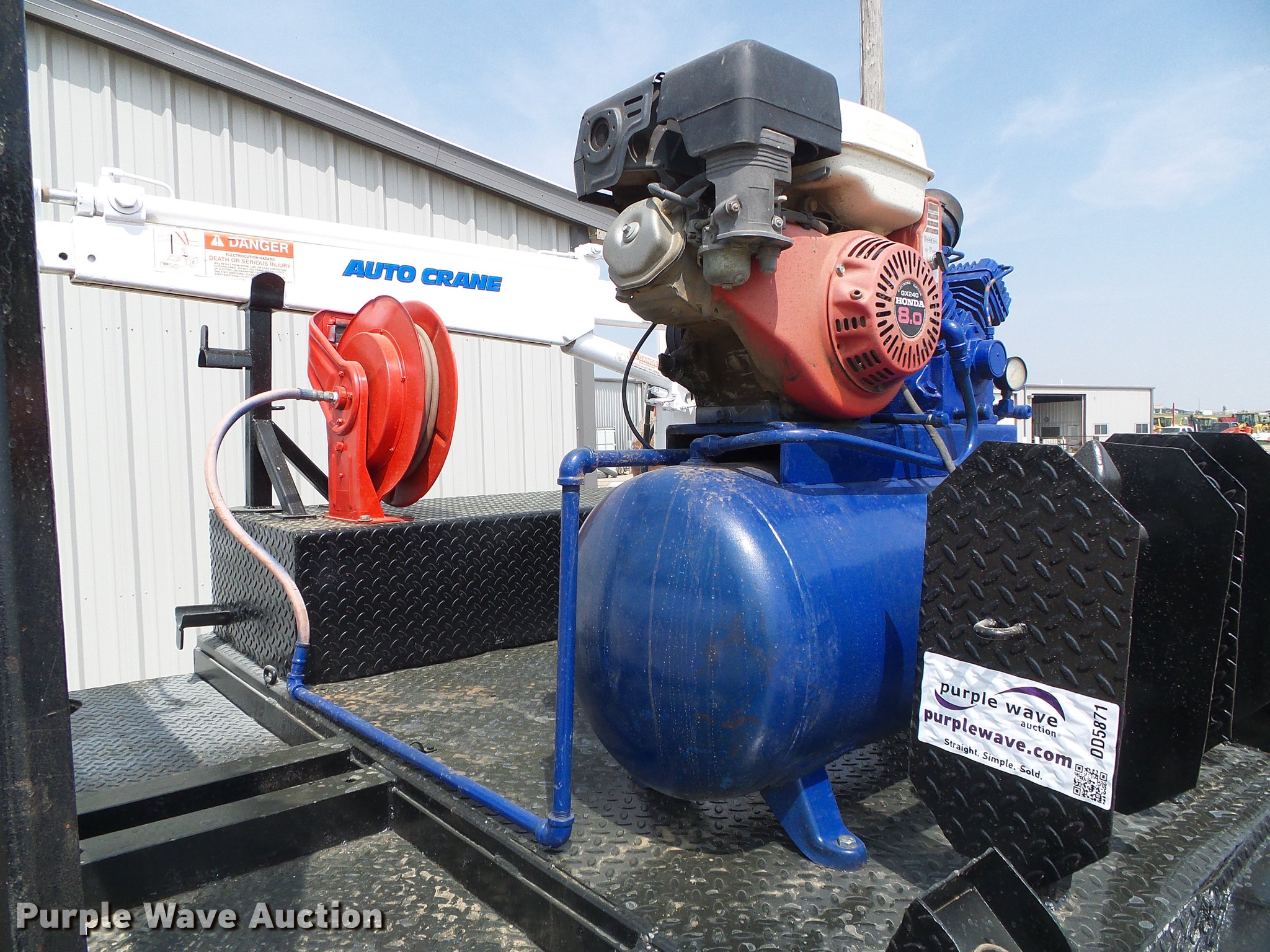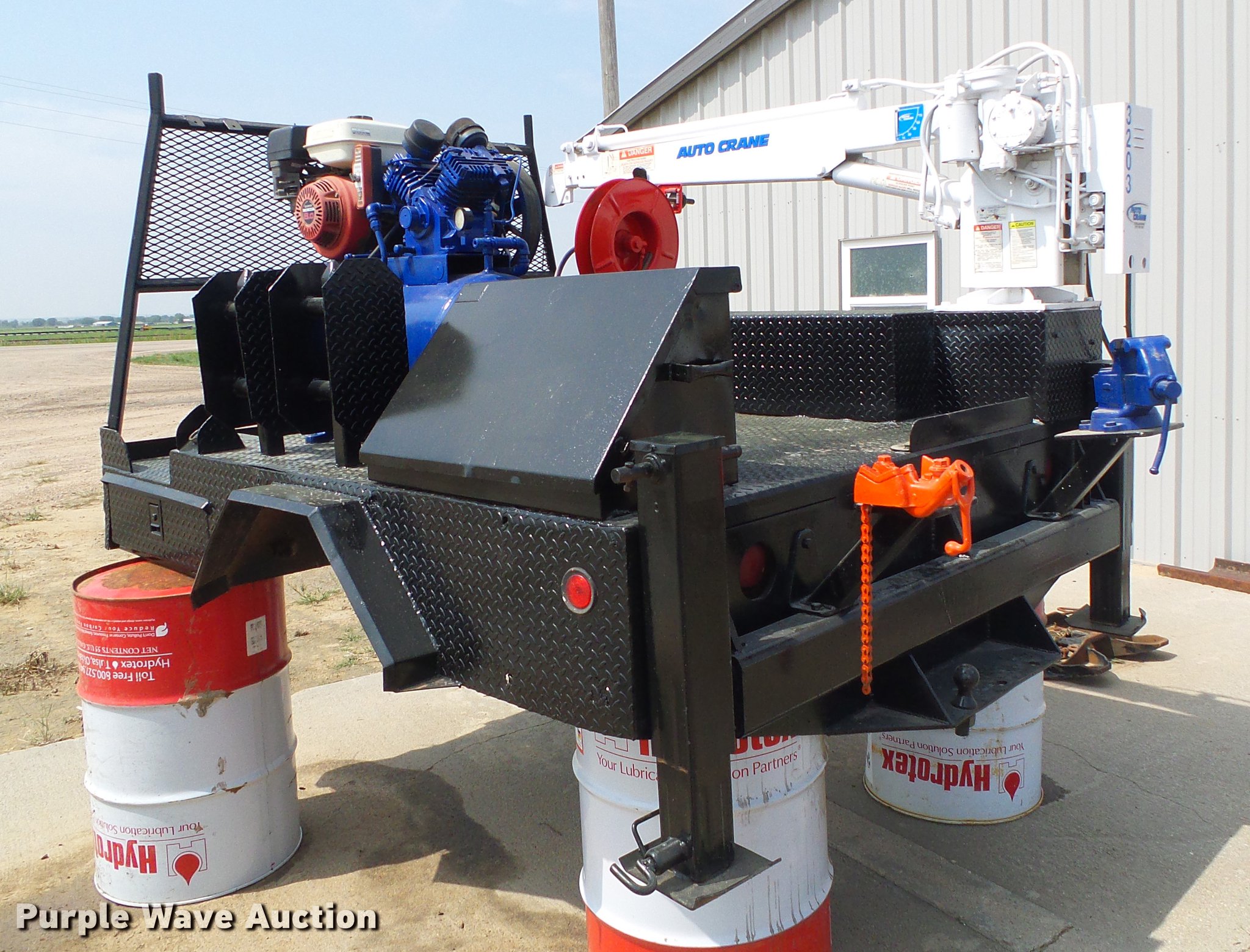 Purple Wave is selling a used Automotive Parts or Acces. in Kansas. This item is a Flatbed with crane with the following: 8'L x 83"W, Auto Crane 3203 crane, Remote, Torch bottle rack, Air compressor, Honda GX240 single cylinder gas engine, 8 HP, Hose reel, Welding and torch reel, Outriggers, Toolboxes