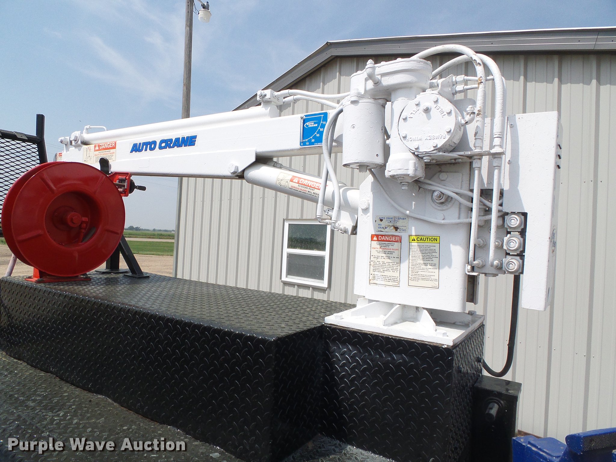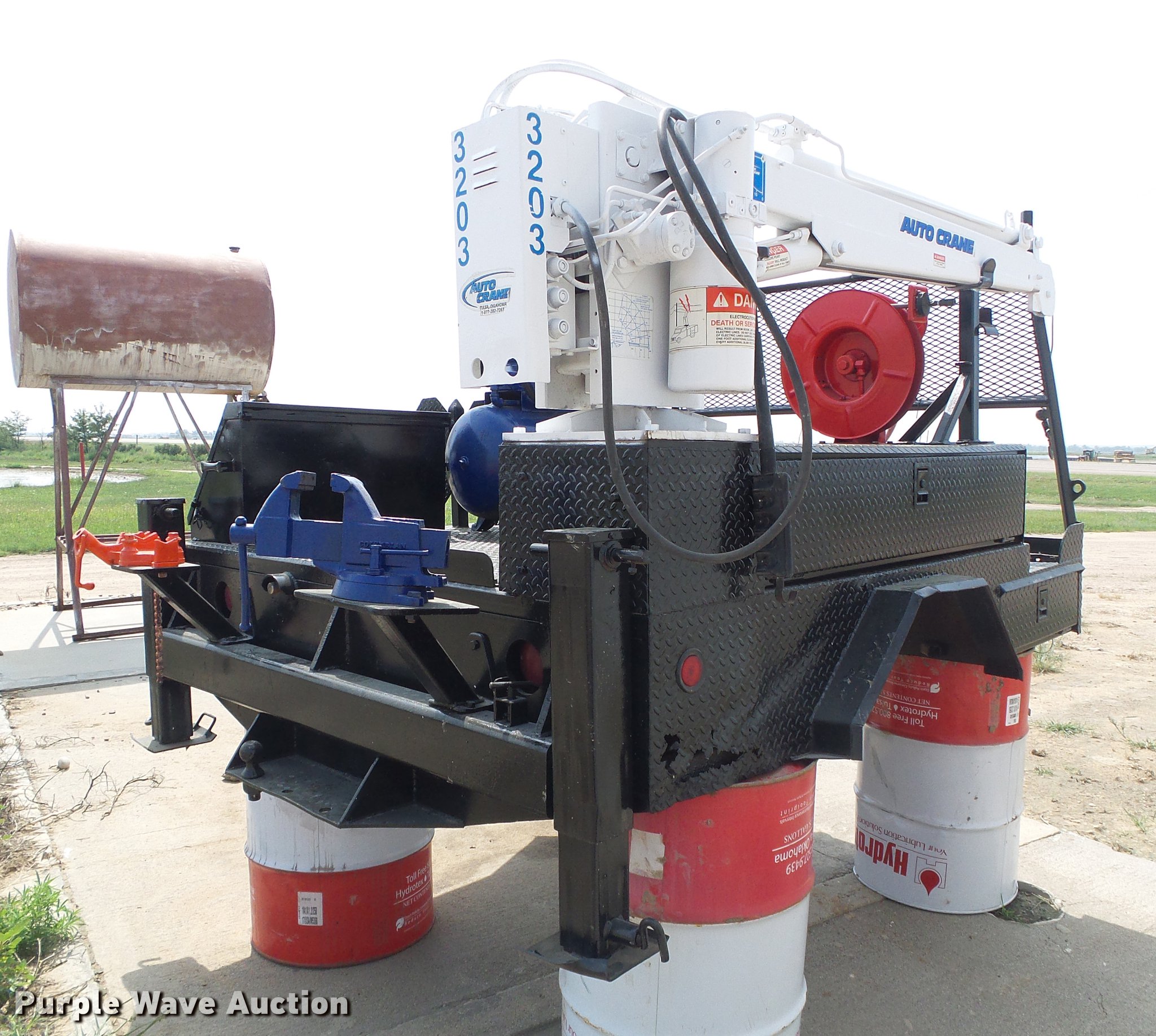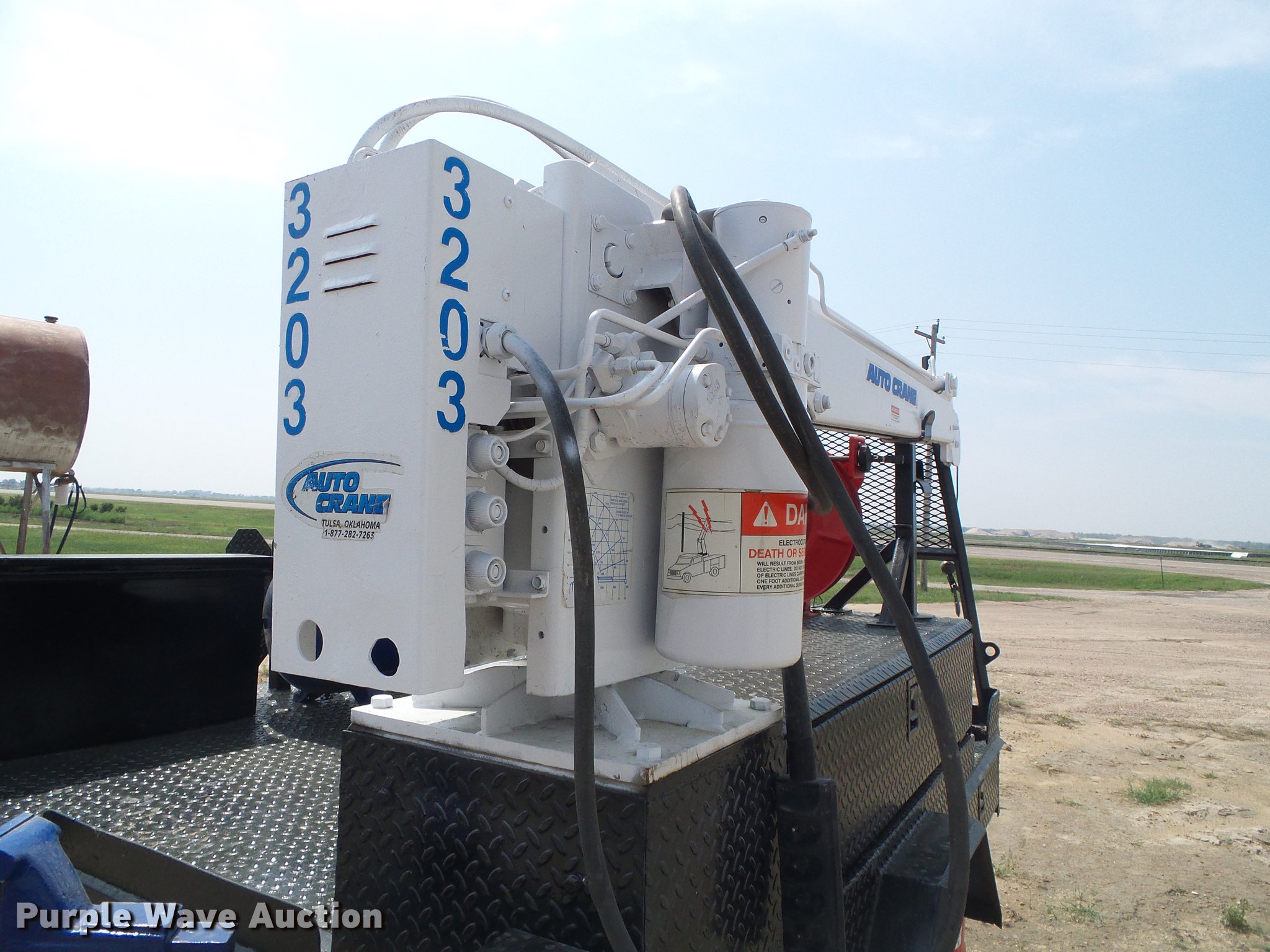 Purple Wave is selling a used Automotive Parts or Acces. in Kansas. This item is a Flatbed with crane with the following: 8'L x 83"W, Auto Crane 3203 crane, Remote, Torch bottle rack, Air compressor, Honda GX240 single cylinder gas engine, 8 HP, Hose reel, Welding and torch reel, Outriggers, Toolboxes