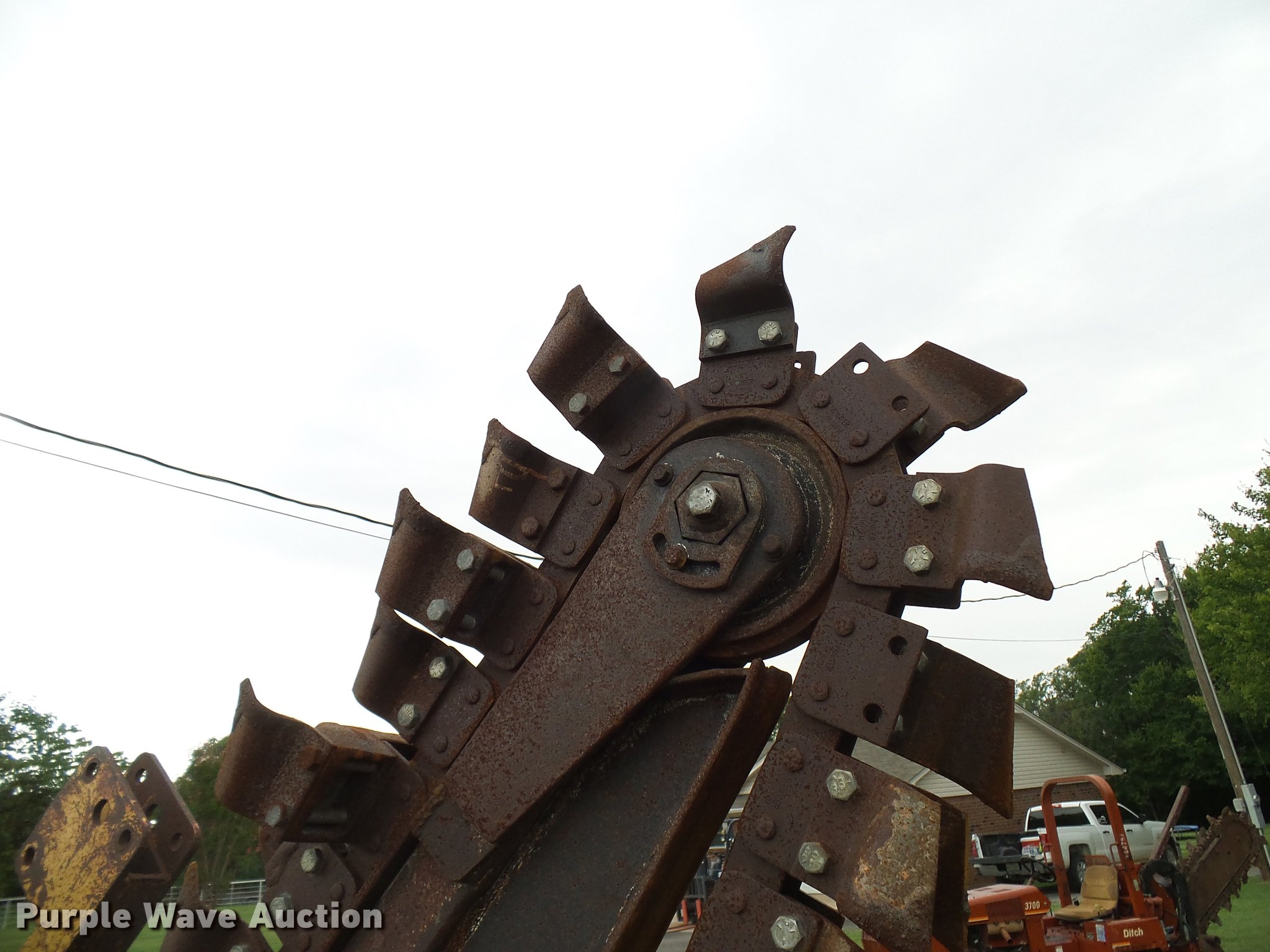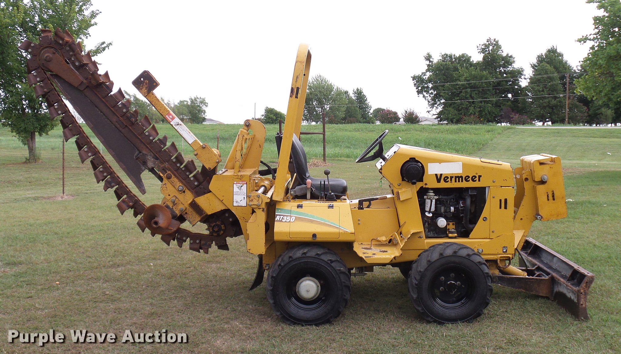 Purple Wave is selling a used Trencher or Rock Saw in Oklahoma. This item is a 2007 Vermeer RT350 trencher with the following: 1,858 hours on meter, CUmmins three cylinder diesel engine, 37 HP, Hydrostatic transmission, Four wheel drive, OROPS, 60"L trenching boom, 10" cutting width, 9" end idler diameter, Dirt teeth, Hydraulic side shift, 57"W four-way backfill blade, (11) counter weights, 26 x 12.00-12 tires, Serial 1VRZ0826071000415