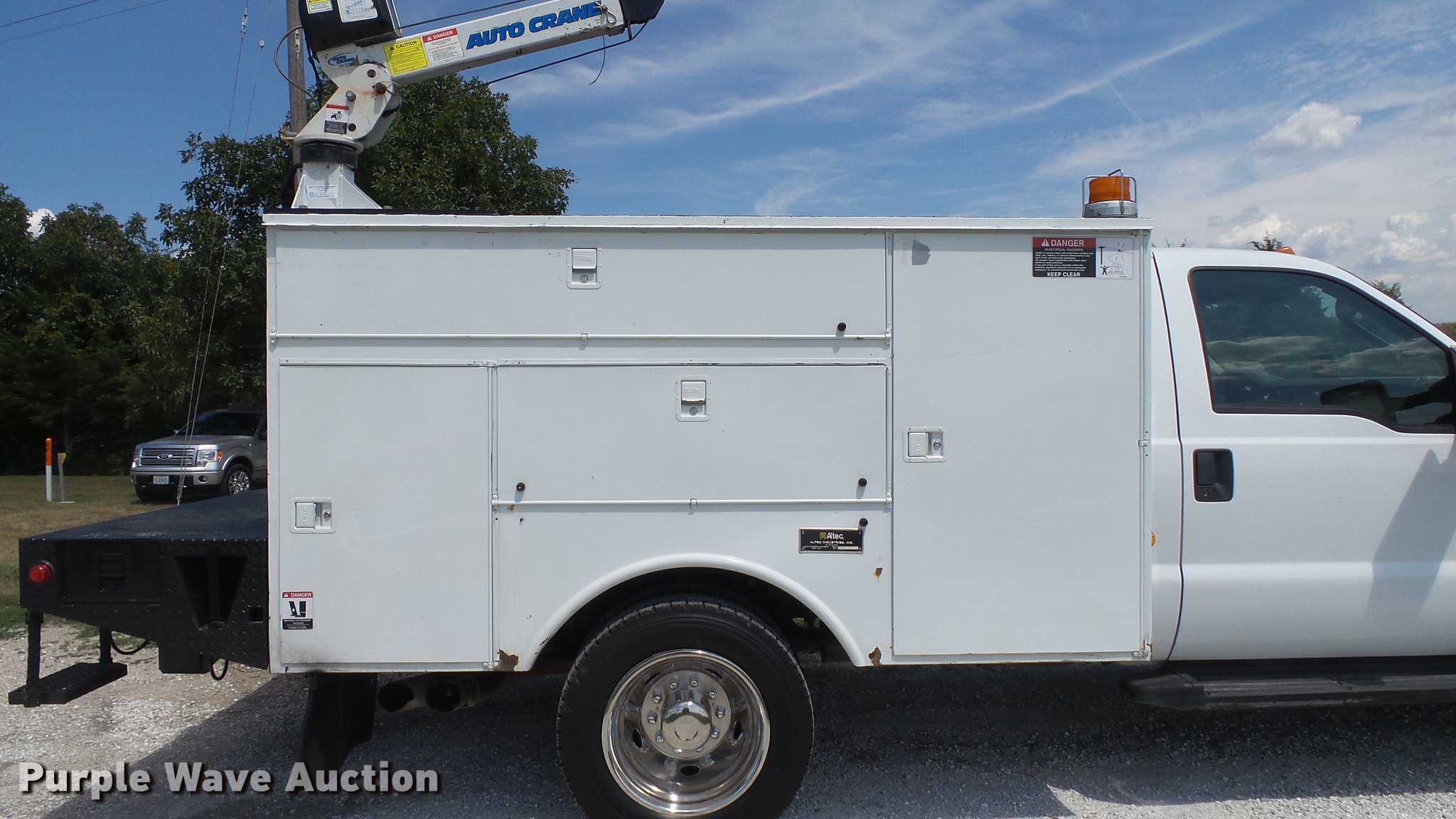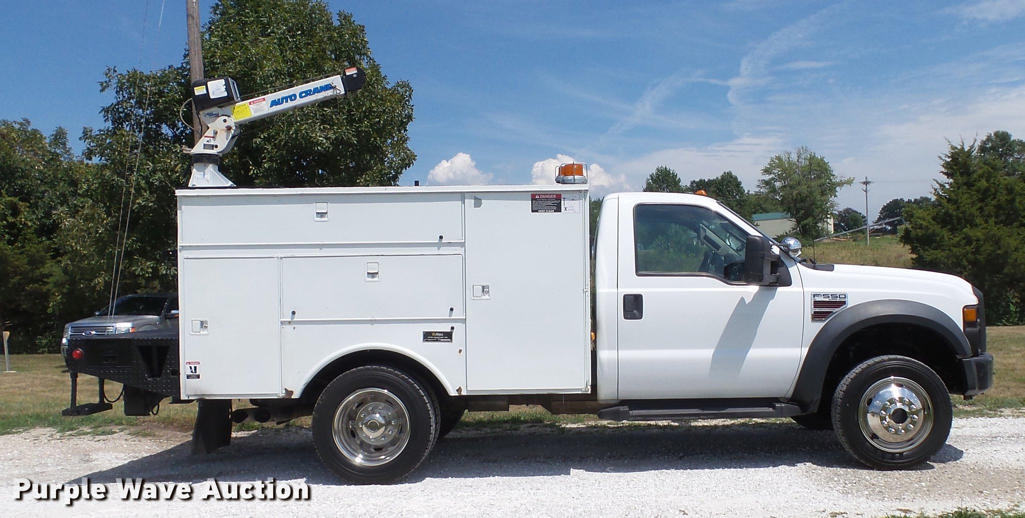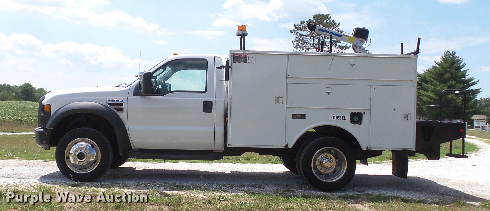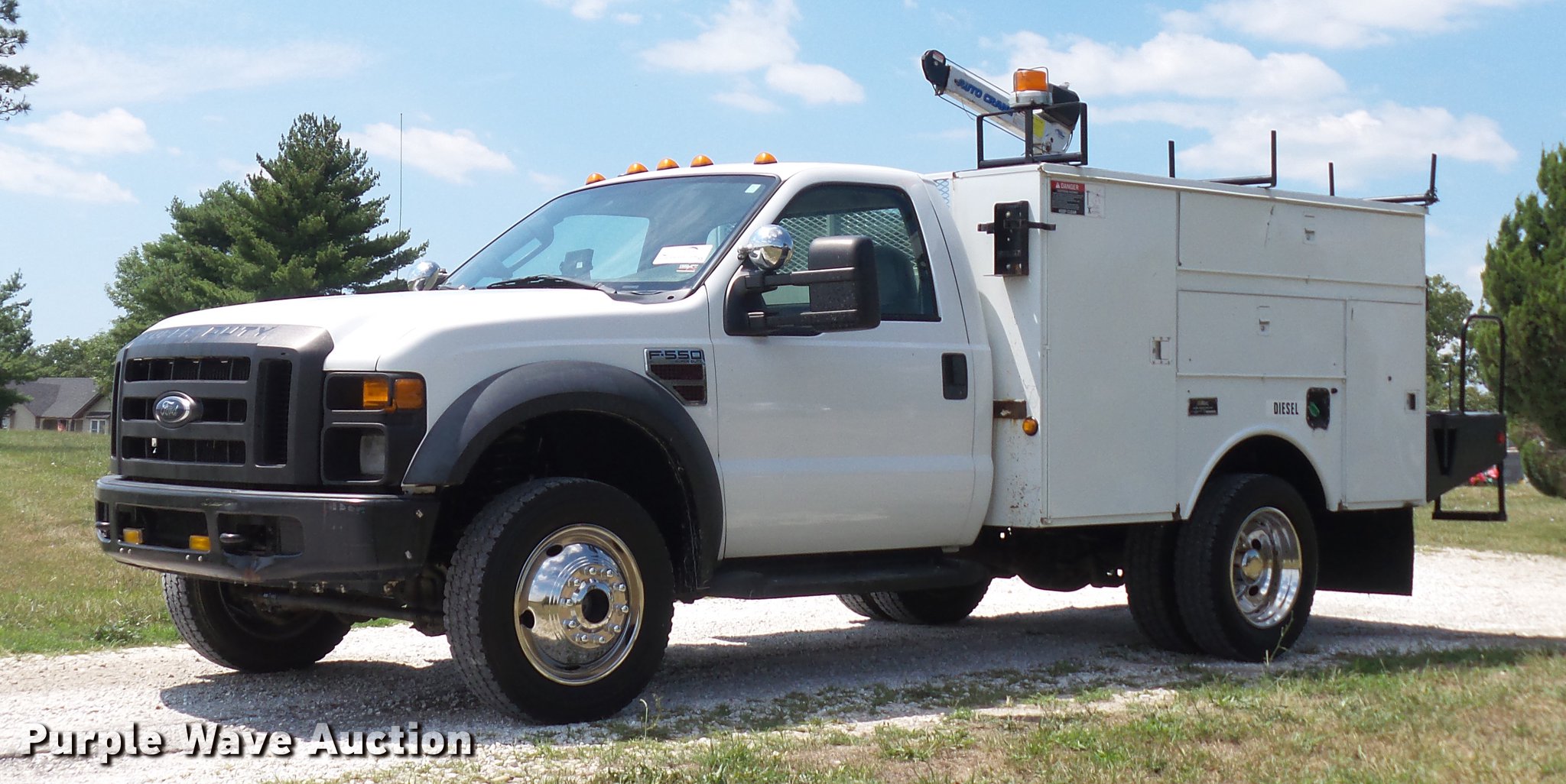 Purple Wave is selling a used Service Truck in Missouri. This item is a 2008 Ford F550 Super Duty XL utility bed truck with crane with the following: 115,684 miles on odometer, 6.4L V8 OHV 32V turbo diesel engine, Automatic transmission, Four wheel drive, AC and heat, AM/FM, Trailer brake controller, Backup camera, Strobe lights, Altec 9'L utility bed, Shelving, 29"W bumper, Auto Crane ETII crane, 2,000 lbs maximum lift capacity, 5.5' boom length, Remote control, Super inverter, (4) 110V outlets, Single fuel tank, Single exhaust stack, 141" wheelbase, Pintle hitch, Trailer wiring, Spring suspension, Hydraulic brakes, 225/70R19.5 tires, GVWR 17,950 lbs, Non-operational backup camera