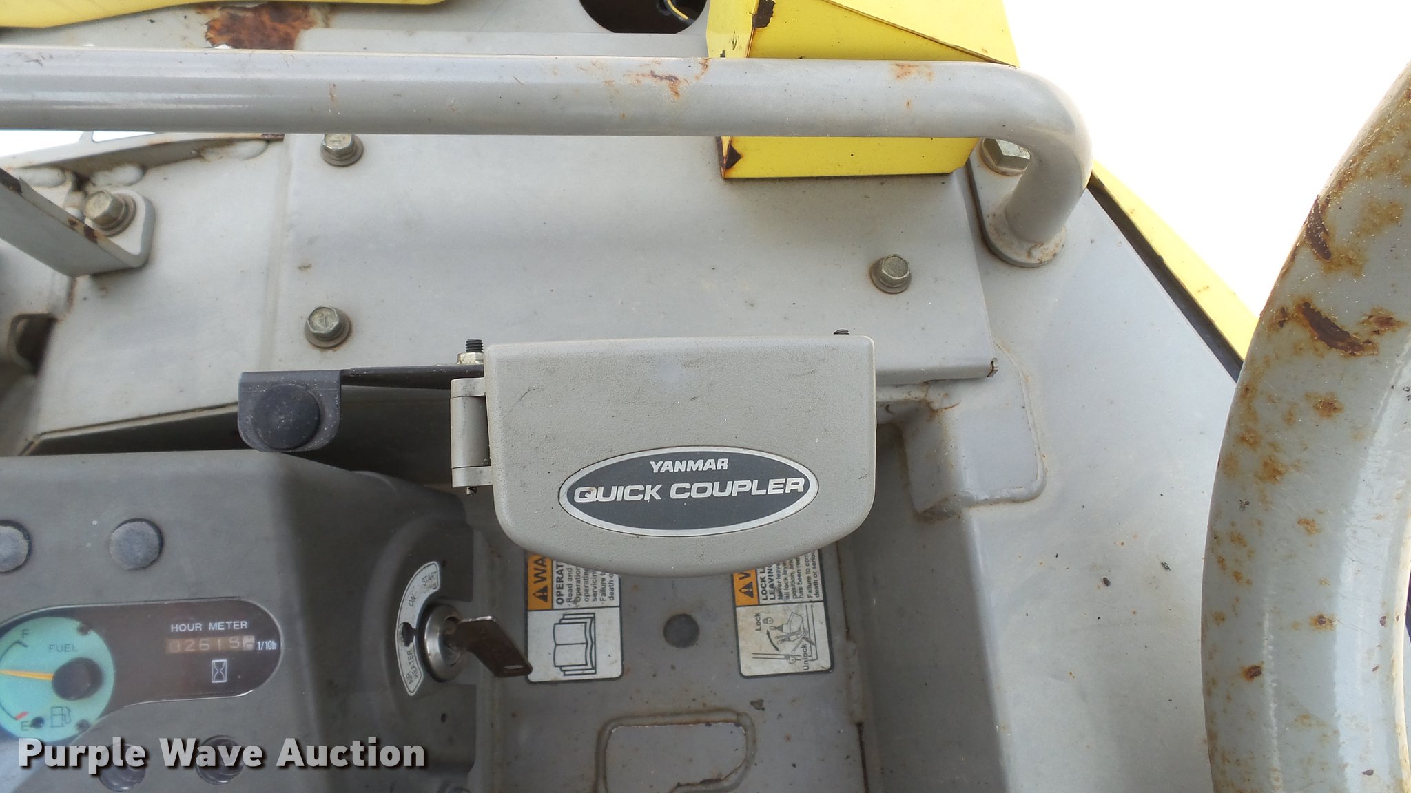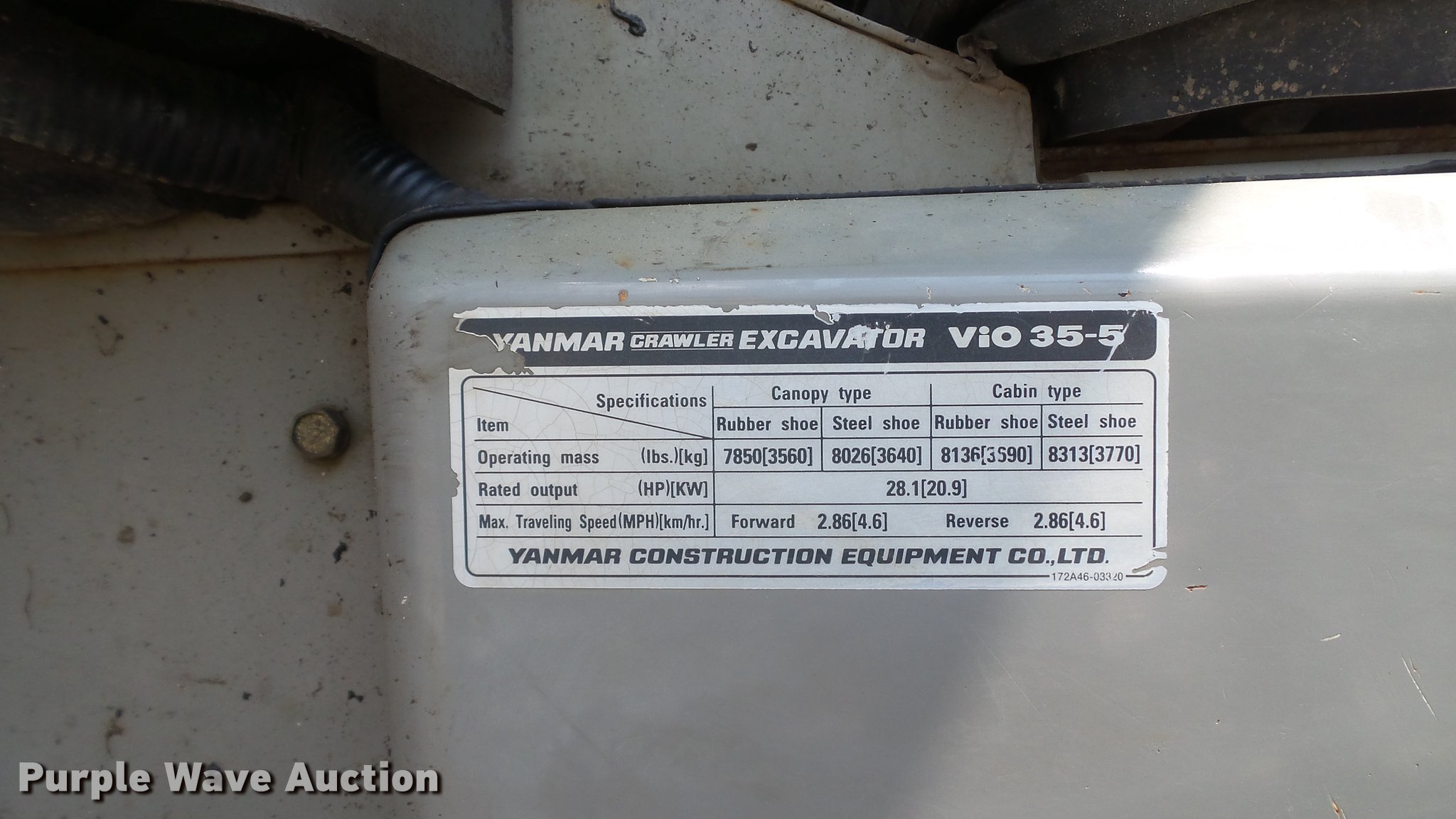 Purple Wave is selling a used Mini Excavator in Missouri. This item is a 2008 Yanmar VIO35-5 mini excavator with the following: 2,615 hours on meter, Yanmar 3TNV88 three cylinder diesel engine, 28 HP, Two speed hydrostatic transmission, OROPS, Suspension seat, Pattern changer, Standard boom, Tag 107645-02 24"W bucket, (5) teeth, Hydraulic quick coupler, Two way auxiliary hydraulics, 61"W backfill blade, 12"W rubber tracks, One tooth missing, Serial YMRVI035T7Y51514