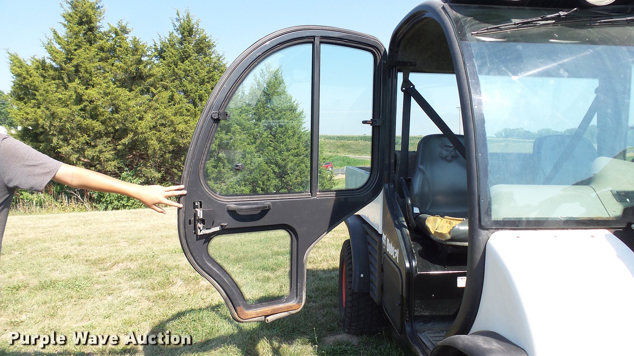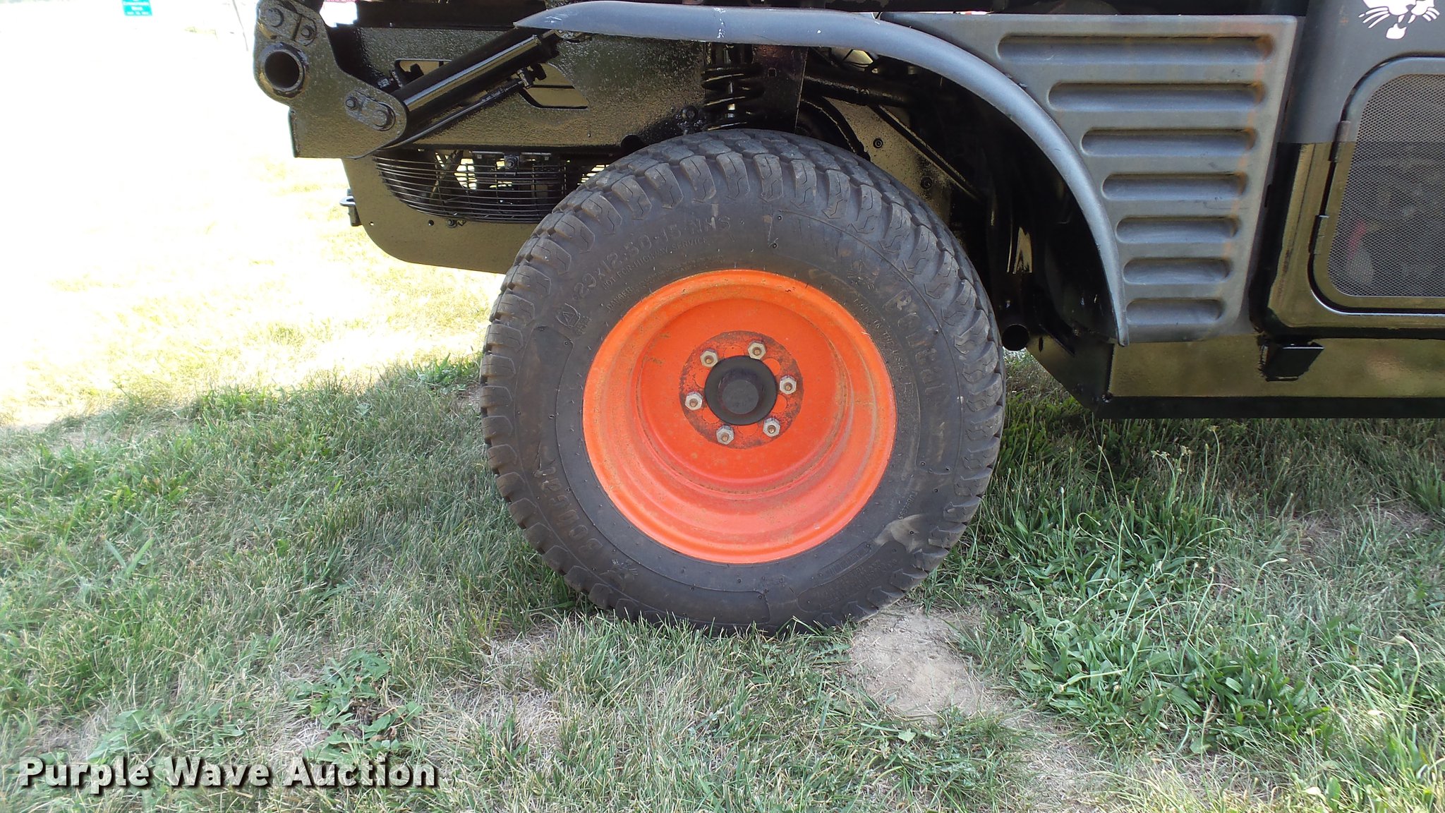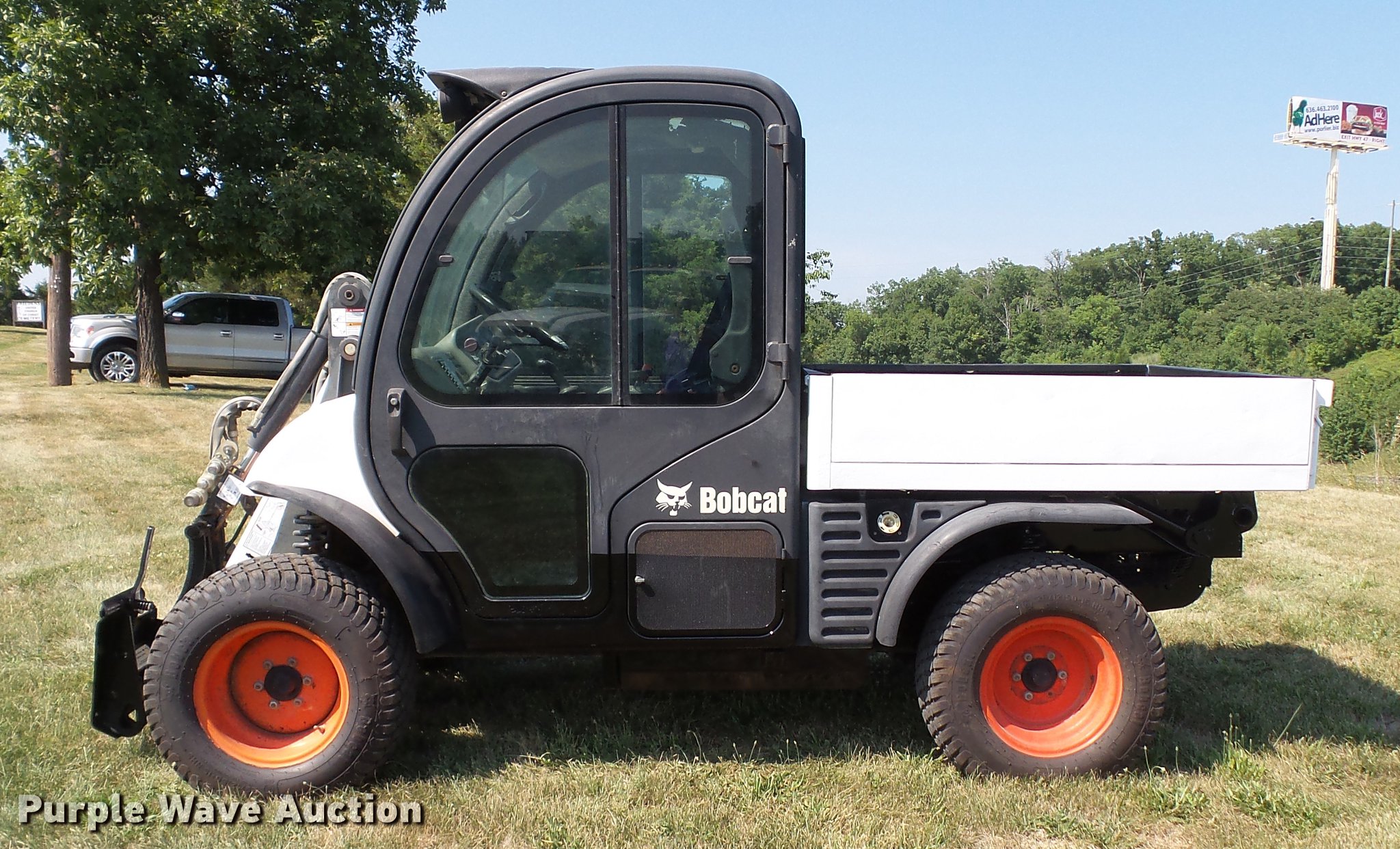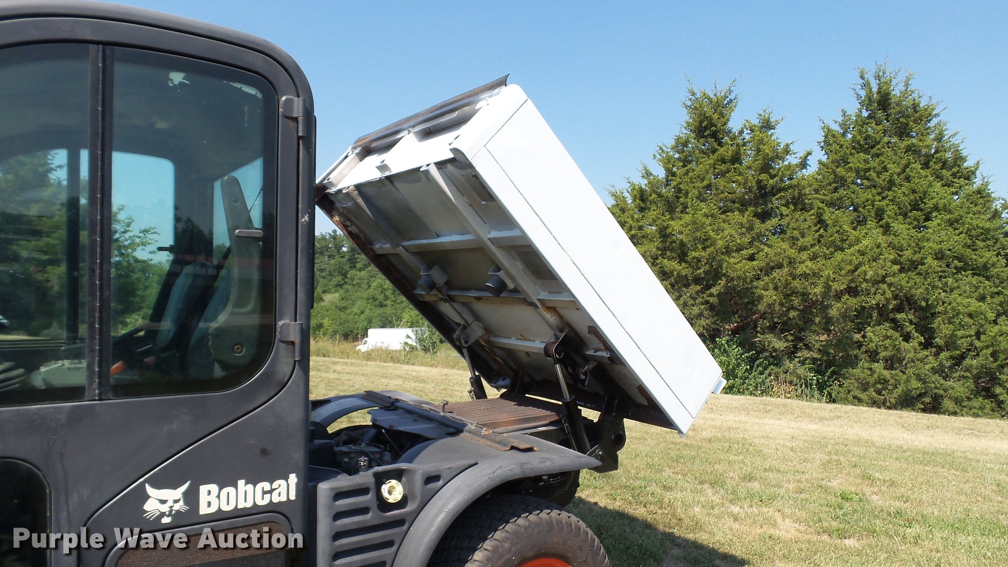 Purple Wave is selling a used Utility Vehicle in Missouri. This item is a 2007 Bobcat Toolcat 5600 utility work machine with the following: 3,040 hours on meter, Kubota V2003-T four cylinder turbo diesel engine, 61 HP, Two speed hydrostatic transmission, Four wheel drive, All wheel steer, Enclosed cab, AC and heat, Wipers, 56"L x 51" dump bed, Tool carrier, Manual quick coupler, High flow auxiliary hydraulics, Front and rear work lights, 29 x 12.50-15 tires, Serial A0W111236