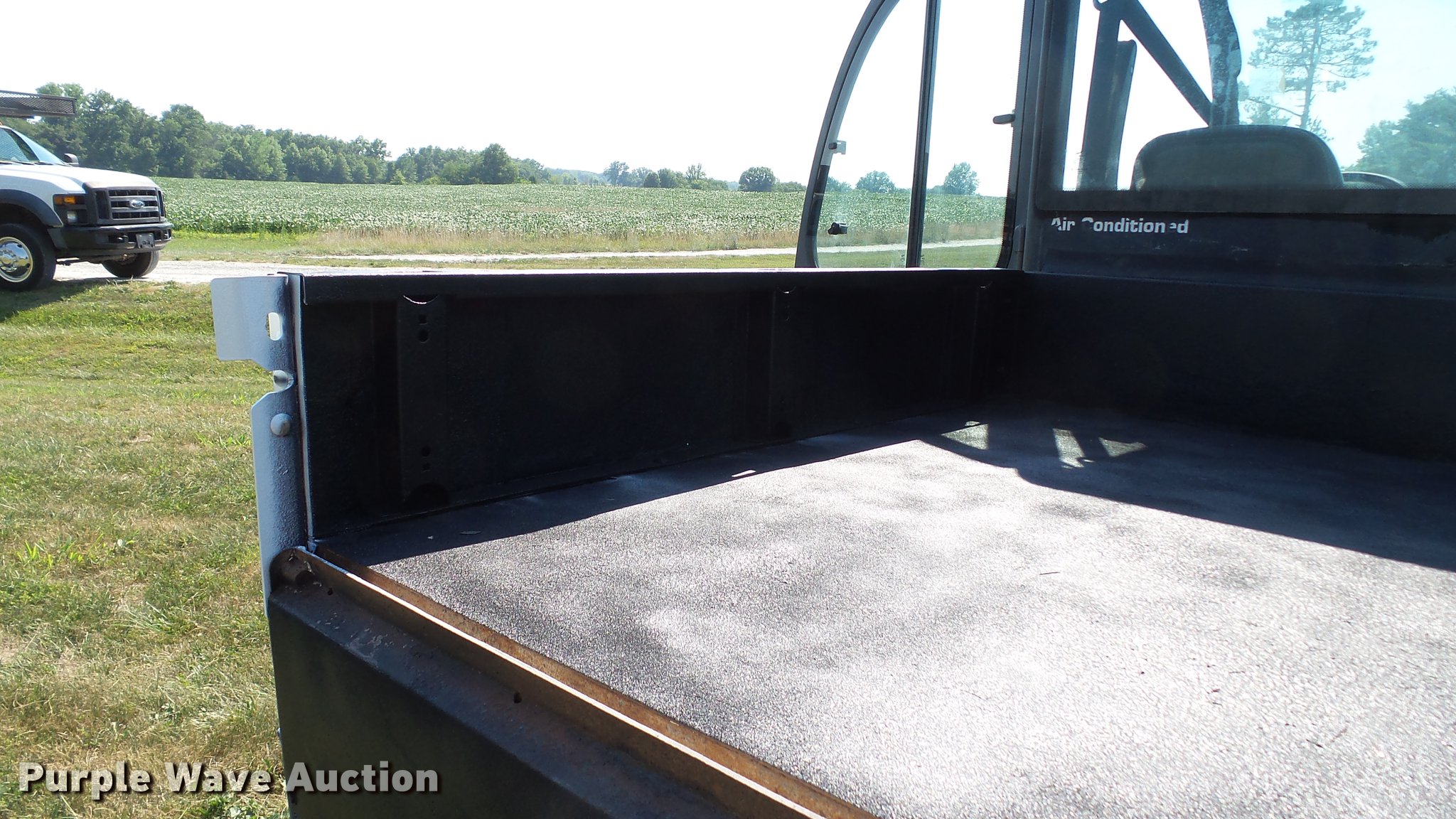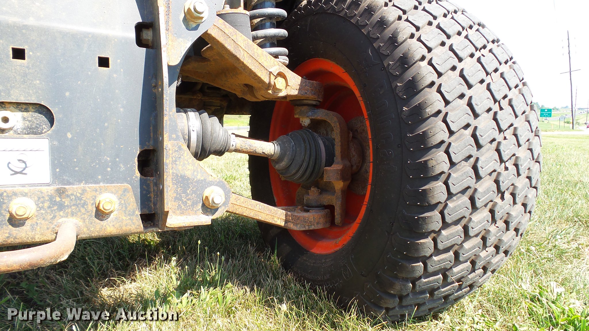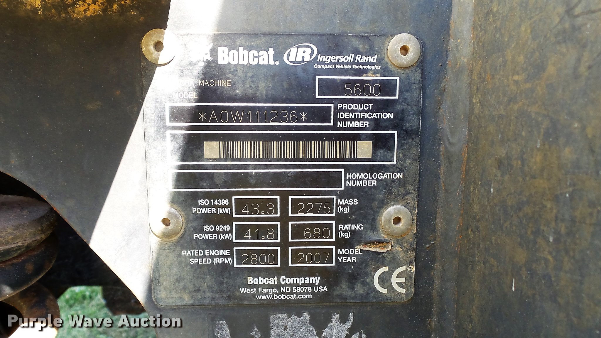 Purple Wave is selling a used Utility Vehicle in Missouri. This item is a 2007 Bobcat Toolcat 5600 utility work machine with the following: 3,040 hours on meter, Kubota V2003-T four cylinder turbo diesel engine, 61 HP, Two speed hydrostatic transmission, Four wheel drive, All wheel steer, Enclosed cab, AC and heat, Wipers, 56"L x 51" dump bed, Tool carrier, Manual quick coupler, High flow auxiliary hydraulics, Front and rear work lights, 29 x 12.50-15 tires, Serial A0W111236